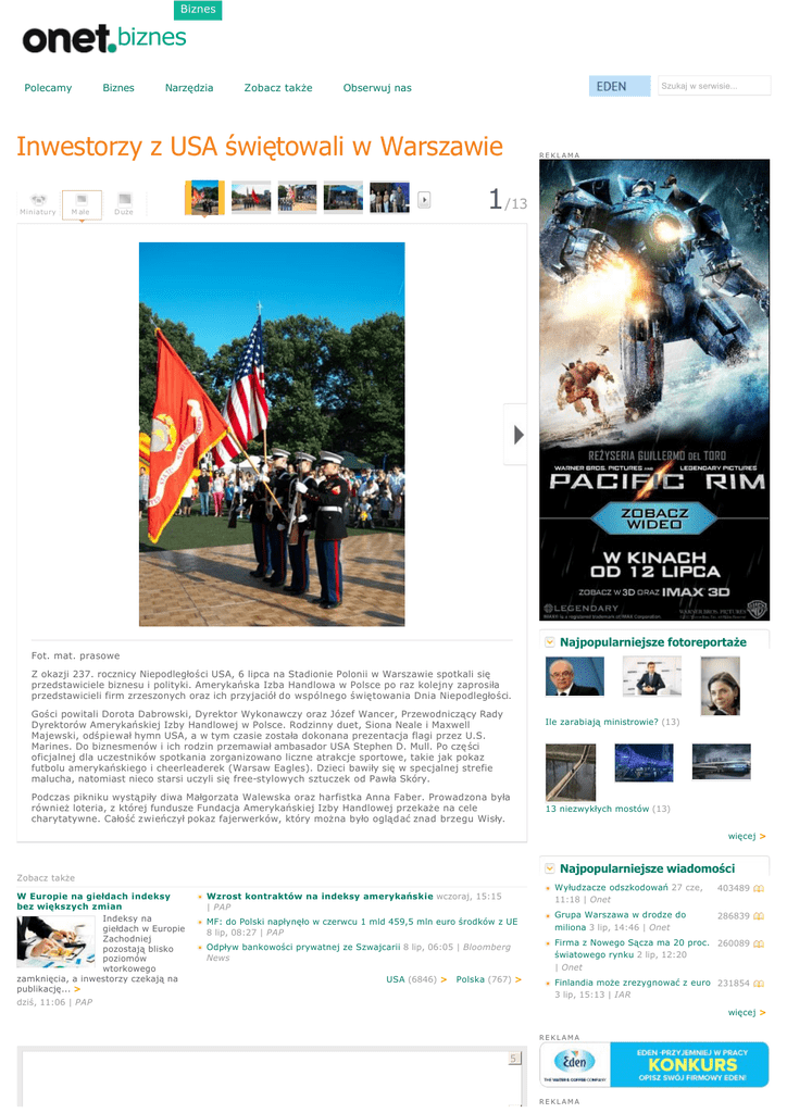 Onet Wiadomości Sport Biznes Rozrywka Plotki Gry Tech Moto Styl życia Wiedza zaloguj się biznes Polecamy Biznes Narzędzia Zobacz także Szukaj w serwisie... Obserwuj nas Inwestorzy z USA świętowali w Warszawie Miniatury M ałe D uże REKLAMA 1/13 Najpopularniejsze fotoreportaże Fot. mat. prasowe Z okazji 237. rocznicy Niepodległości USA, 6 lipca na Stadionie Polonii w Warszawie spotkali się przedstawiciele biznesu i polityki. Amerykańska Izba Handlowa w Polsce po raz kolejny zaprosiła przedstawicieli firm zrzeszonych oraz ich przyjaciół do wspólnego świętowania Dnia Niepodległości. Gości powitali Dorota Dabrowski, Dyrektor Wykonawczy oraz Józef Wancer, Przewodniczący Rady Dyrektorów Amerykańskiej Izby Handlowej w Polsce. Rodzinny duet, Siona Neale i Maxwell Majewski, odśpiewał hymn USA, a w tym czasie została dokonana prezentacja flagi przez U.S. Marines. Do biznesmenów i ich rodzin przemawiał ambasador USA Stephen D. Mull. Po czę ści oficjalnej dla uczestników spotkania zorganizowano liczne atrakcje sportowe, takie jak pokaz futbolu amerykańskiego i cheerleaderek (Warsaw Eagles). Dzieci bawiły się w specjalnej strefie malucha, natomiast nieco starsi uczyli się free-stylowych sztuczek od Pawła Skóry. Ile zarabiają ministrowie? (13) Podczas pikniku wystąpiły diwa Małgorzata Walewska oraz harfistka Anna Faber. Prowadzona była również loteria, z której fundusze Fundacja Amerykańskiej Izby Handlowej przekaże na cele charytatywne. Całość zwieńczył pokaz fajerwerków, który można było ogląd ać znad brzegu Wisły. 13 niezwykłych mostów (13) więcej > Najpopularniejsze wiadomości Zobacz także W Europie na giełdach indeksy bez większych zmian Indeksy na giełdach w Europie Zachodniej pozostają blisko poziomów wtorkowego zamknięcia, a inwestorzy czekają na publikację... > Wzrost kontraktów na indeksy amerykańskie wczoraj, 15:15 | PAP MF: do Polski napłynęło w czerwcu 1 mld 459,5 mln euro środków z UE 8 lip, 08:27 | PAP Odpływ bankowości prywatnej ze Szwajcarii 8 lip, 06:05 | Bloomberg News USA (6846) > Polska (767) > dziś, 11:06 | PAP Wyłudzacze odszkodowań 27 cze, 11:18 | Onet 403489 Grupa Warszawa w drodze do miliona 3 lip, 14:46 | Onet 286839 Firma z Nowego Sącza ma 20 proc. 260089 światowego rynku 2 lip, 12:20 | Onet Finlandia może zrezygnować z euro 231854 3 lip, 15:13 | IAR więcej > REKLAMA 5 REKLAMA 6 Co o tym sądzisz? Wypowiedz się na forum! REKLAMA Bądź pierwszy! Wyraź swoją opinię! REKLAMA Bądź na bieżąco z wiadomościami biznesowymi. NEWSLETTER Notowania: Dynamiczne Akcje GPW Narzędzia: Twój portfel Analiza techniczna Dla Ciebie: Konta osobiste Dla firmy: Konta Specjalne: Biznes.pl Źródła: Reuters Świat Kredyty mieszkaniowe Podatki dla firm KtoKogo.pl PAP Surowce Profile Wzory umów Nieruchomości ISBnews IAR Catalyst Wykresy Karty Waluty NBP Wskaźniki Lokaty Emerytura Bloomberg Firmy na mapie Forbes Copyright 1996 - 2013 Grupa Onet.pl SA - Wszystkie serwisy > Polityka prywatności > O firmie | Prywatność | Reklama | Praca w Onecie | Waluty on-line Gra giełdowa Deklaracje i druki podatkowe Praca Zapisz się Wpisz swój adres e-mail Newsweek Inwestycje Der Spiegel Fundusze Kalkulatory Prawnik radzi Porady prawne dowiedz się wię cej Porównywarka ubezpieczeń Dokumenty Office 365 The Guardian do góry 2013 Grupa Onet.pl SA