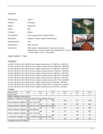 Carolina** Symbol oferty: 1953/111 Państwo: Chorwacja Region: Wyspa Rab Miasto: Rab Transport: Własny Profil wyjazdu: Pobyt wypoczynkowy, Wyjazd rodzinny Wyżywienie: śniadanie, Obiady, Kolacje, Obiadokolacje Zakwaterowanie: Hotel Wyposażenie: Brak informacji świadczenia: Cena zawiera: zakwaterowanie i wyżywienie wg opcji, ubezpieczenie. Cena nie zawiera: taksy klimatycznej: 12-18 lat - 0,5 Euro/dzień, <18 lat - 1 Euro/dzień Hotel Carolina** - Rab TERMINY: od: 2017-07-26 do: 2017-08-02 (8 dni), miejsca: zamów cena od: 1502 PLN = 345 EUR od: 2017-07-26 do: 2017-08-09 (15 dni), miejsca: zamów cena od: 3005 PLN = 690 EUR od: 2017-08-02 do: 2017-08-09 (8 dni), miejsca: zamów cena od: 1502 PLN = 345 EUR od: 2017-08-02 do: 2017-08-16 (15 dni), miejsca: zamów cena od: 2796 PLN = 642 EUR od: 2017-08-09 do: 2017-08-16 (8 dni), miejsca: zamów cena od: 1293 PLN = 297 EUR od: 2017-08-09 do: 2017-08-23 (15 dni), miejsca: zamów cena od: 2587 PLN = 594 EUR od: 2017-08-16 do: 2017-08-23 (8 dni), miejsca: zamów cena od: 1293 PLN = 297 EUR od: 2017-08-16 do: 2017-08-30 (15 dni), miejsca: zamów cena od: 2271 PLN = 522 EUR od: 2017-08-23 do: 2017-08-30 (8 dni), miejsca: zamów cena od: 978 PLN = 225 EUR od: 2017-08-23 do: 2017-09-06 (15 dni), miejsca: zamów cena od: 1955 PLN = 449 EUR od: 2017-08-30 do: 2017-09-06 (8 dni), miejsca: zamów cena od: 978 PLN = 225 EUR CENNIK: Długość pobytu: 15 dni 8 dni 15 dni 8 dni 8 dni 15 dni Grupa cenowa: A A C C B B 596 741 1482 354 427 854 467 612 1224 274 346 692 290 362 724 435 580 1160 Pobyt w obiekcie (do wyboru) pokój 2-os. z widokiem na morze+śn.,obiad,kolacja standardowo dla osób: 2 1674 837 1192 Pokój 1osobowy z widokiem na morze + śn, ob i kol 950 475 708 Pojkój 2-osobowy z widokiem na morze+śn. i ob-kol. standardowo dla osób: 2 1416 708 934 Pokój 1 osobowy z widokiem na morze+śniadanie 788 394 548 Pokój 1-osobowy z widokiem na morze + śn i ob-kol 822 411 580 (*) pokój 2os z widokiem na morze + śniadania standardowo dla osób: 2 1352 676 870 Ubezpieczenie (do wyboru) 1/2 (*) ubezpieczenie NW KL 14 Ubezpieczenie (opcjonalne) ubezpieczenie - od kosztów rezygnacji 2.4 % 7 14 7 7 14 2.4 % 2.4 % 2.4 % 2.4 % 2.4 % Waluta: EUR Aktualne ceny z systemu S.A.R.T. (-) - cena usługi, podatku kalkulowana przy osobie lub gratis (*) - kwota wliczona w cenę standardową 2/2