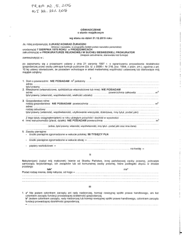 P<L(lA M2. .5". 2-O l.ę to T ¡UP-. 3-0-L Sjotb OŚWIADCZENIE o stanie majątkowym wg stanu na dzień 31.12.2015 roku Ja, niżej podpisany(a), ŁUKASZ KONRAD ŻURADZKI (imiona i nazwisko, w przypadku kobiet podać nazwisko panieńskie) urodzony(a) 7 SIERPNIA 1979 ROKU w PROSZOWICACH zatrudniony(a) w PROKURATURZE REJONOWEJ W SUCHEJ BESKIDZKIEJ, PROKURATOR (miejsce zatrudnienia, stanowisko lub funkcja) zamieszkały(a) w » po zapoznaniu się z przepisami ustawy z dnia 21 sierpnia 1997 r. o ograniczeniu prowadzenia działalności gospodarczej przez osoby pełniące funkcje publiczne (Dz. U. z 2006 r. Nr 216, poz. 1584, z późn. zm.), zgodnie z art. 10 tej ustawy oświadczam, że posiadam wchodzące w skład małżeńskiej wspólności ustawowej lub stanowiące mój majątek odrębny: I 1. Dom o powierzchni: NIE POSIADAM m2 położony..................................................................................................... adres:............................................................................................................................................................................... tytuł prawny:................................................................................................................................................................... 2. Mieszkanie (własnościowe, spółdzielcze własnościowe lub inne): NIE POSIADAM adres:.......................................................................................................powierzchnia całkowita:......................... m2 tytuł prawny (własność, współwłasność, wielkość udziału):.......................................................................................... 3. Gospodarstwo rolne: rodzaj gospodarstwa: NIE POSIADAM powierzchnia:.......................................................................................... m2 adres:.............................................................................................................................................................................. rodzaj zabudowy:............................................................................................................................................................ tytuł prawny (własność, współwłasność, użytkowanie wieczyste, dzierżawa, inny tytuł, podać ja k i):......................... Z tego tytułu osiągnąłem(ęłam) w roku ubiegłym przychód i dochód w wysokości:..................................................... 4. Inne nieruchomości (place, działki): NIE POSIADAM powierzchnia:.......................................................................m2 (adres, tytuł prawny: własność, współwłasność, inny tytuł - podać jaki oraz inne dane) 5. Zasoby pieniężne: - środki pieniężne zgromadzone w walucie polskiej: 98 TYSIĘCY PLN - środki pieniężne zgromadzone w walucie obcej: - - papiery wartościowe: ........................................................................................................................................... na kwotę: II Nabyłem(am) (nabył mój małżonek) mienie od Skarbu Państwa, innej państwowej osoby prawnej, jednostek samorządu terytorialnego, ich związków lub od komunalnej osoby prawnej, które podlegało zbyciu w drodze przetargu: tak* nie* Podać rodzaj mienia, datę nabycia, od kogo - ................................................................................................................... III 1. a* Nie jestem członkiem zarządu ani rady nadzorczej, komisji rewizyjnej spółki prawa handlowego, ani też członkiem zarządu fundacji prowadzącej działalność gospodarczą. b* Jestem członkiem zarządu, rady nadzorczej lub komisji rewizyjnej spółki prawa handlowego, członkiem zarządu fundacji prowadzącej działalność gospodarczą. 2 (wymienić pełnione funkcje i stanowiska wraz z nazwami spółek i fundacji) Z tego tytułu osiągnąłem(ęłam) w roku ubiegłym dochód w wysokości: - ................................................................... 2. a* Nie jestem zatrudniony(a) ani też nie wykonuję innych zajęć w spółkach prawa handlowego, które mogłyby wywołać podejrzenie o moją stronniczość lub interesowność, te* W spółkach prawa handlowego wykonuję niżej wymienione zajęcia: Z tego tytułu osiągnąłem(ęłam) w roku ubiegłym dochód w wysokości: - ................... 3. a* Nie jestem członkiem zarządu, rady nadzorczej ani komisji rewizyjnej spółdzielni.1) k* Jestem członkiem zarządu, rady nadzorczej lub komisji rewizyjnej spółdzielni: (podać pełnioną funkcję, nazwę i adres spółdzielni) Z tego tytułu osiągnąłem(ęłam) w roku ubiegłym dochód w wysokości: - ............................. 4. W następujących spółkach prawa handlowego posiadam niżej podane udziały lub akcje: - (nazwa spółki - adresy, wielkość udziałów, ilość akcji) Z tego tytułu osiągnąłem(ęłam) w roku ubiegłym dochód w wysokości: - ........... Równocześnie oświadczam, że w spółce - .......................................................... ..................................................................................................................moje udziały (lub akcje) przekraczają 10%. W pozostałych spółkach prawa handlowego posiadane udziały lub akcje nie stanowią 10% kapitału. IV 1. Nie prowadzę działalności gospodarczej na własny rachunek ani wspólnie z innymi osobami, nie zarządzam również taką działalnością ani nie jestem przedstawicielem czy też pełnomocnikiem w prowadzeniu takiej działalności.2' 2. Prowadzę w wyżej określony sposób działalność polegającą na: NIE PROWADZĘ Z tego tytułu osiągnąłem(ęłam) w roku ubiegłym dochód w wysokości: - ................................................................... V Składniki mienia ruchomego o wartości powyżej 10.000 złotych (w przypadku pojazdów mechanicznych należy podać markę, model i rok produkcji): HOND