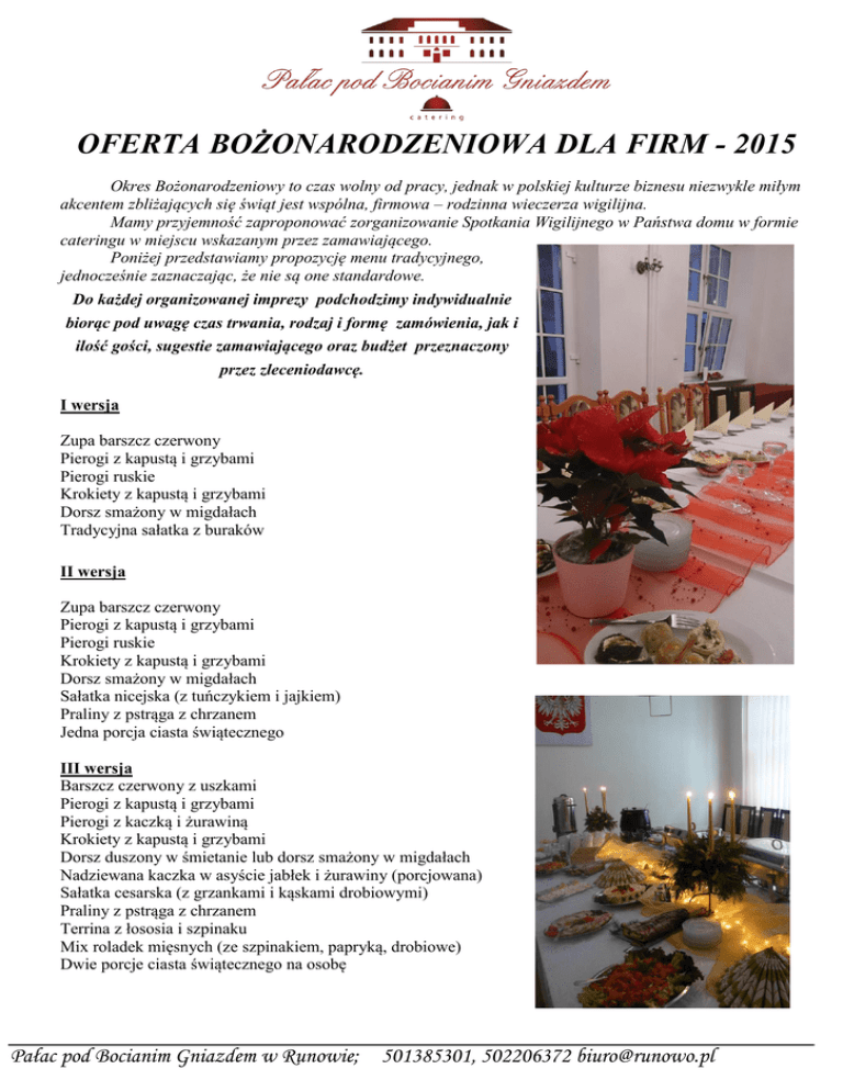 OFERTA BOŻONARODZENIOWA DLA FIRM - 2015 Okres Bożonarodzeniowy to czas wolny od pracy, jednak w polskiej kulturze biznesu niezwykle miłym akcentem zbliżających się świąt jest wspólna, firmowa – rodzinna wieczerza wigilijna. Mamy przyjemność zaproponować zorganizowanie Spotkania Wigilijnego w Państwa domu w formie cateringu w miejscu wskazanym przez zamawiającego. Poniżej przedstawiamy propozycję menu tradycyjnego, jednocześnie zaznaczając, że nie są one standardowe. Do każdej organizowanej imprezy podchodzimy indywidualnie biorąc pod uwagę czas trwania, rodzaj i formę zamówienia, jak i ilość gości, sugestie zamawiającego oraz budżet przeznaczony przez zleceniodawcę. I wersja Zupa barszcz czerwony Pierogi z kapustą i grzybami Pierogi ruskie Krokiety z kapustą i grzybami Dorsz smażony w migdałach Tradycyjna sałatka z buraków II wersja Zupa barszcz czerwony Pierogi z kapustą i grzybami Pierogi ruskie Krokiety z kapustą i grzybami Dorsz smażony w migdałach Sałatka nicejska (z tuńczykiem i jajkiem) Praliny z pstrąga z chrzanem Jedna porcja ciasta świątecznego III wersja Barszcz czerwony z uszkami Pierogi z kapustą i grzybami Pierogi z kaczką i żurawiną Krokiety z kapustą i grzybami Dorsz duszony w śmietanie lub dorsz smażony w migdałach Nadziewana kaczka w asyście jabłek i żurawiny (porcjowana) Sałatka cesarska (z grzankami i kąskami drobiowymi) Praliny z pstrąga z chrzanem Terrina z łososia i szpinaku Mix roladek mięsnych (ze szpinakiem, papryką, drobiowe) Dwie porcje ciasta świątecznego na osobę Pałac pod Bocianim Gniazdem w Runowie; 501385301, 502206372 [email protected]