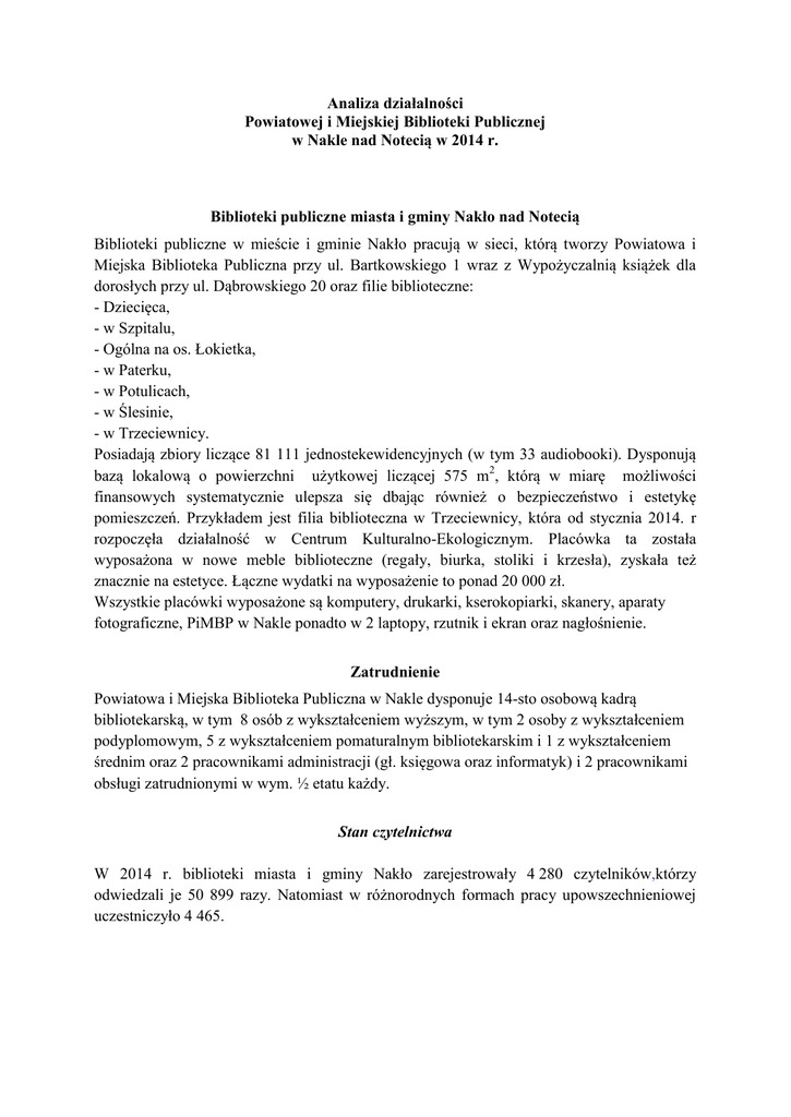 Analiza działalności Powiatowej i Miejskiej Biblioteki Publicznej w Nakle nad Notecią w 2014 r. Biblioteki publiczne miasta i gminy Nakło nad Notecią Biblioteki publiczne w mieście i gminie Nakło pracują w sieci, którą tworzy Powiatowa i Miejska Biblioteka Publiczna przy ul. Bartkowskiego 1 wraz z Wypożyczalnią książek dla dorosłych przy ul. Dąbrowskiego 20 oraz filie biblioteczne: - Dziecięca, - w Szpitalu, - Ogólna na os. Łokietka, - w Paterku, - w Potulicach, - w Ślesinie, - w Trzeciewnicy. Posiadają zbiory liczące 81 111 jednostekewidencyjnych (w tym 33 audiobooki). Dysponują bazą lokalową o powierzchni użytkowej liczącej 575 m2, którą w miarę możliwości finansowych systematycznie ulepsza się dbając również o bezpieczeństwo i estetykę pomieszczeń. Przykładem jest filia biblioteczna w Trzeciewnicy, która od stycznia 2014. r rozpoczęła działalność w Centrum Kulturalno-Ekologicznym. Placówka ta została wyposażona w nowe meble biblioteczne (regały, biurka, stoliki i krzesła), zyskała też znacznie na estetyce. Łączne wydatki na wyposażenie to ponad 20 000 zł. Wszystkie placówki wyposażone są komputery, drukarki, kserokopiarki, skanery, aparaty fotograficzne, PiMBP w Nakle ponadto w 2 laptopy, rzutnik i ekran oraz nagłośnienie. Zatrudnienie Powiatowa i Miejska Biblioteka Publiczna w Nakle dysponuje 14-sto osobową kadrą bibliotekarską, w tym 8 osób z wykształceniem wyższym, w tym 2 osoby z wykształceniem podyplomowym, 5 z wykształceniem pomaturalnym bibliotekarskim i 1 z wykształceniem średnim oraz 2 pracownikami administracji (gł. księgowa oraz informatyk) i 2 pracownikami obsługi zatrudnionymi w wym. ½ etatu każdy. Stan czytelnictwa W 2014 r. biblioteki miasta i gminy Nakło zarejestrowały 4 280 czytelników,którzy odwiedzali je 50 899 razy. Natomiast w różnorodnych formach pracy upowszechnieniowej uczestniczyło 4 465. Użytkownicy aktywnie wypożyczający wg wieku Ogółem 4280 do 5 lat 131 (3,1%) 6-12 13-15 16-19 20-24 25-44 45-60 pow. 60 765 396 508 379 940 764 397 (17,87%) (9,25%) (11,87%) (8,86%) (21,96%) (17,85%) (9,28%) wg zajęcia Ogółem Osoby uczące się Osoby pracujące Pozostali 4 280 1 991 1 258 1 031 W 2014 roku wypożyczono 65 604 książki, 3 181 gazet i czasopism, na miejscu udostępniono 677 książek i 5 645 gazet i czasopism, z wypożyczeo międzybibliotecznych skorzystało 33 osoby, z usług kserograficznych i wydruków komputerowych 729 osób, z bezpłatnego dostępu do Internetu 8 808 osób. Wypożyczalnia książek przy ul. Dąbrowskiego 20 realizuje formę udostępniania zbiorów ph.: „Książka na telefon” adresowaną do niepełnosprawnych i chorych mieszkańców Nakła. Na telefoniczne życzenie czytelnika bibliotekarz dostarcza literaturę do domu. W roku 2014 z tej formy korzystano 57 razy. Zakupy książek W 2014 r. zakupiono 2 684 książki oraz 5 audiobooków na kwotę 57 044 zł, w tym: - z dotacji gminnej – 516 książek a kwotę 15 000 zł - zdotacji powiatowej 486 książek. na kwotę 10 000,00 zł. - ze środków własnych – 550 na kwotę 10 000 - z dotacji Ministerstwa Kultury i Dziedzictwa Narodowego – 1 132 książki i 5 audiobooków na kwotę 22 044 zł. Pozyskane środki ze źródeł zewnętrznych Powiatowa i Miejska Biblioteka Publiczna w Nakle pozyskała: ▪ Z Ministerstwa Kultury i Dziedzictwa Narodowego w ramach Programu Biblioteki Narodowej „Zakup nowości wydawniczych do biblioteki” - 22 044 zł. Zrealizowano ze środków finansowych Biblioteki Narodowejw ramach Narodowego Programu Rozwoju Czytelnictwa. ▪ Z budżetu Gminnego Programu Profilaktyki, Rozwiązywania Problemów Alkoholowych i Przeciwdziałania Narkomanii, na realizację projektu „Akcja Lato 2014” - 2 500 zł. Projektem objętych zostało 6 filii bibliotecznych gminy Nakło, a jego realizacja przebiegała na przełomie lipca i sierpnia. ▪ Z Instytutu Książki w ramach Dyskusyjnych Klubów Książki - 24 egz. darów na wartość 615,80 zł oraz z innych źródeł 166 egz. darów na wartość 3 519,10zł. Łącznie 190 darów na wartość 4 134,90 zł Razem wysokość środków pozyskanych w formie rzeczowej i finansowej to kwota 28 678,90 zł. Ponadto PiMBP w Nakle wypracowuje własne dochody. W 2014 r. wyniosły one 16 183 zł Szkolenia pracowników ▪ W ramach Programu dotacyjnego "Szkolenia dla bibliotekarzy 2014" realizowanego przez Instytut Książki ze środków Ministerstwa Kultury i Dziedzictwa Narodowego w cyklu szkoleń uczestniczyło 7 pracowników merytorycznych. Szkolenia obejmowały następujące tematy: -Innowacyjne formy promocji książki i biblioteki - animacje przestrzeni np. FlashMob, Lipdub. - Wydłuż swoją dobę – zarządzanie sobą w czasie - Edukacja informacyjna oraz zbiory typu Open Access - Darmowe oraz oparte o wolne licencje zasoby graficzne do wykorzystania w pracy bibliotekarza – jak szukać i co można z nimi zrobić? ▪ 24 marca jeden bibliotekarz uczestniczył w szkoleniu ”Infografika – graficzne piękno – tworzenie i realizacja promocyjnych materiałów w bibliotece i o bibliotece”, zorganizowanym w ramach Programu Rozwoju Bibliotek przez Wojewódzką i Miejską Bibliotekę Publiczną w Bydgoszczy, finansowane przez Fundację Rozwoju Społeczeństwa Informacyjnego. ▪ 16 czerwca jeden bibliotekarz uczestniczył w prezentacji systemu ACADEMICA Biblioteki Narodowej umożliwiającym zastąpienie tradycyjnej formy wypożyczeń międzybibliotecznych wypożyczalnią publikacji w postaci cyfrowej. ▪ 25 czerwca dwóch bibliotekarzy uczestniczyło w spotkaniu moderatorów Dyskusyjnych Klubów Książki w WiMBP w Bydgoszczy. ▪ 17-18 września – główna księgowa uczestniczyła w seminarium dla dyrektorów i głównych księgowych instytucji kultury. ▪ 25 września trzech pracowników biblioteki uczestniczyło w wizycie studyjnej pn. „W partnerstwie z tradycją, kulturą i nowoczesnością” w Bibliotece Publicznej Miasta i