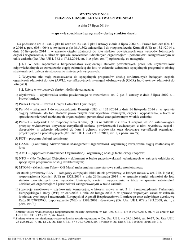 WYTYCZNE NR 8 PREZESA URZĘDU LOTNICTWA CYWILNEGO z dnia 27 lipca 2016 r. w sprawie specjalnych programów obsług strukturalnych Na podstawie art. 21 ust. 2 pkt 16 oraz art. 23 ust. 2 pkt 2 ustawy z dnia 3 lipca 2002 r. – Prawo lotnicze (Dz. U. z 2016 r. poz. 605 i 904) w związku z pkt M.A.302 załącznika I do rozporządzenia Komisji (UE) nr 1321/2014 z dnia 26 listopada 2014 r. w sprawie ciągłej zdatności do lotu statków powietrznych oraz wyrobów lotniczych, części i wyposażenia, a także w sprawie zatwierdzeń udzielanych organizacjom i personelowi zaangażowanym w takie zadania (Dz. Urz. UE L 362 z 17.12.2014, str. 1, z późn. zm.1)) ogłasza się, co następuje: § 1. 1. W celu zapewnienia bezpieczeństwa eksploatacji statków powietrznych przez ich użytkowników odpowiedzialnych za zarządzanie ciągłą zdatnością do lotu w zakresie wdrożenia specjalnych programów obsług strukturalnych, zaleca się stosowanie niniejszych wytycznych. 2. Wytyczne nie mają zastosowania do specjalnych programów obsług strukturalnych będących częścią ograniczeń zdatności do lotu (AWL), certyfikacyjnych wymagań obsługowych (CMR) lub dyrektyw zdatności do lotu (AD). § 2. Użyte w wytycznych skróty i definicje oznaczają: 1) użytkownik – użytkownika statku powietrznego w rozumieniu art. 2 pkt 3 ustawy z dnia 3 lipca 2002 r. – Prawo lotnicze; 2) Prezes Urzędu – Prezesa Urzędu Lotnictwa Cywilnego; 3) Part-M – załącznik I do rozporządzenia Komisji (UE) nr 1321/2014 z dnia 26 listopada 2014 r. w sprawie ciągłej zdatności do lotu statków powietrznych oraz wyrobów lotniczych, części i wyposażenia, a także w sprawie zatwierdzeń udzielanych organizacjom i personelowi zaangażowanym w takie zadania; 4) Part-21 – załącznik I do rozporządzenia Komisji (UE) nr 748/2012 z dnia 3 sierpnia 2012 r. ustanawiające przepisy wykonawcze dotyczące certyfikacji statków powietrznych i związanych z nimi wyrobów, części i akcesoriów w zakresie zdatności do lotu i ochrony środowiska oraz dotyczące certyfikacji organizacji projektujących i produkujących (Dz. Urz. UE L 224 z 21.8.2012, str. 1, z późn. zm.2)); 5) POT – program obsługi technicznej; 6) CAMO (Continuing Airworthiness Management Organization) organizację zarządzania ciągłą zdatnością do lotu; 7) AMO – (Approved Maintenance Organization) organizację obsługi technicznej i napraw; 8) NTO – (No Technical Objection) – dokument o braku przeciwwskazań technicznych w zakresie odejścia od specjalnych programów obsług strukturalnych; 9) MTOM – (Maximum Take – Off Mass) maksymalną masę startową statku powietrznego; 10) statek powietrzny ELA1 – załogowy europejski lekki statek powietrzny, o którym mowa w art. 2 lit. k pkt (i) rozporządzenia Komisji (UE) nr 1321/2014 z dnia 26 listopada 2014 r. w sprawie ciągłej zdatności do lotu statków powietrznych oraz wyrobów lotniczych, części i wyposażenia, a także w sprawie zatwierdzeń udzielanych organizacjom i personelowi zaangażowanym w takie zadania; 11) operacje zarobkowe – użytkowanie komercyjne, o którym mowa w art. 3 lit. i rozporządzenia Parlamentu Europejskiego i Rady (WE) nr 216/2008 z dnia 20 lutego 2008 r. w sprawie wspólnych zasad w zakresie lotnictwa cywilnego i utworzenia Europejskiej Agencji Bezpieczeństwa Lotniczego oraz uchylające dyrektywę Rady 91/670/EWG, rozporządzenie (WE) nr 1592/2002 i dyrektywę (Dz. Urz. UE L 079 z 19.3.2008, str. 1, z późn. zm.3)); 1) Zmiany tekstu wymienionego rozporządzenia zostały ogłoszone w Dz. Urz. UE L 176 z 07.07.2015, str. 4-28 oraz w Dz. Urz. UE L 241 z 17.9.2015, str. 16-48. 2) Zmiany tekstu wymienionego rozporządzenia zostały ogłoszone w Dz. Urz. UE L 4 z 09.01.2016, str. 36-37, Dz. Urz. UE L 23 z 28.01.2014, str. 12-24, Dz. Urz. UE L167 z 01.07.2015, str. 1-9 oraz w Dz. Urz. UE L 3 z 06.01.2016, str. 3-4. Id: B0FF4774-EA88-4610-B3AB-ECEE314F74C2. Uchwalony Strona 1 12) operacje zarobkowego transportu lotniczego – operacje wykonywane statkiem powietrznym, których celem jest przewóz pasażerów, ładunku lub poczty za wynagrodzeniem lub na zasadzie innego świadczenia wzajemnego. § 3. Zaleca się łączne przeprowadzenie działań, o których mowa w § 5 oraz w § 6, w przypadku nieuwzględnienia w całości lub w części specjalnych programów obsług strukturalnych, o których mowa w instrukcjach w zakresie ciągłej zdatności do lotu publikowanymi przez posiadacza certyfikatu typu zgodnie z Part21 w POT szybowca, motoszybowca lub samolotu o MTOM mniejszym lub równym 2730 kg niewykorzystywanego w operacjach zarobkowego transportu lotniczego. § 4. 1. Zaleca się łączne przeprowadzenie działań, o których mowa w § 5 pkt 1–3, w przypadku nieuwzględnienia w całości lub w części specjalnych programów obsług strukturalnych, o których mowa w instrukcjach w zakresie ciągłej zdatności do lotu publikowanymi przez posiadacza certyfikatu typu zgodnie z Part21 przez użytkownika w zadeklarowanym, zgodnie z pkt M.A.302 lit. h pkt 4 Part-M, POT statku powietrznego ELA 1 niewykorzystywanego w operacjach zarobkowych. 2. Zastosowanie się do niniejszych wytycznych nie zwalnia właściciela statku powietrznego ELA 1 niewykorzystywanego w operacjach zarobkowych z obowiązku spełnienia wymagań przepisu pkt M.A.302 lit. h pkt 4 Part-M, zgodnie z którym właściciel deklaruje pełną odpowiedzialności za treść POT, a w szczególności za wszelkie odstępstwa od zaleceń posiadacza zatwierdzenia projektu. § 5. W przypadku nieuwzględnienia w całości lub w części specjalnych programów obsług strukturalnych w POT użytkownik lub CAMO podejmuje następujące działania: 1) w ramach obsługi rocznej lub równoważnej zleca AMO wykonanie przeglądu weryfikacyjnego struktury statku powietrznego, o którym mowa w pkt I załącznika nr 1 do wytycznych, na okoliczność występowania korozji oraz pęknięć zmęczeniowych w celu uzyskania NT