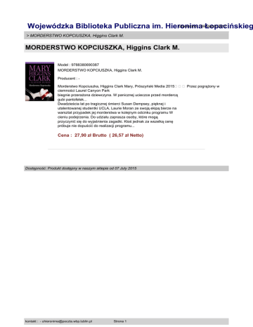 Utworzono : 08Łopacińskieg March 2017 Wojewódzka Biblioteka Publiczna im. Hieronima > MORDERSTWO KOPCIUSZKA, Higgins Clark M. MORDERSTWO KOPCIUSZKA, Higgins Clark M. Model : 9788380690387 MORDERSTWO KOPCIUSZKA, Higgins Clark M. Producent : Morderstwo Kopciuszka, Higgins Clark Mary, Prószyński Media 2015��� Przez pogrążony w ciemności Laurel Canyon Park biegnie przerażona dziewczyna. W panicznej ucieczce przed mordercą gubi pantofelek... Dwadzieścia lat po tragicznej śmierci Susan Dempsey, pięknej i utalentowanej studentki UCLA, Laurie Moran ze swoją ekipą bierze na warsztat przypadek jej morderstwa w kolejnym odcinku programu W cieniu podejrzenia. Do udziału zaprasza osoby, które mogą przyczynić się do wyjaśnienia zagadki. Ktoś jednak za wszelką cenę próbuje nie dopuścić do realizacji programu... Cena : 27,90 zł Brutto ( 26,57 zł Netto) Dostępność: Produkt dostępny w naszym sklepie od 07 July 2015 kontakt : - [email protected] Strona 1