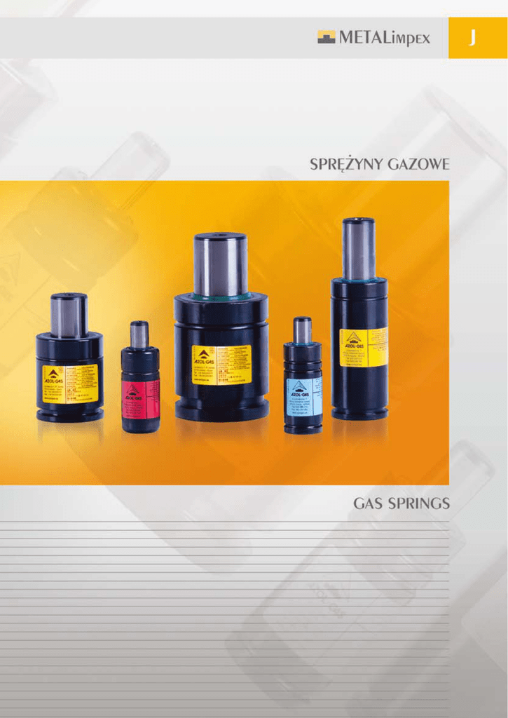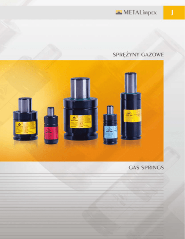 J/2 Spis produktów Table of contents Strona Page AFB Sprężyna gazowa „Micro” Micro gas spring AFJ Sprężyna gazowa „Micro” Micro gas spring AFD Sprężyna gazowa „Micro” Micro gas spring AF Sprężyna gazowa „Micro” Micro gas spring AFN Sprężyna gazowa „Micro” Micro gas spring AFK Sprężyna gazowa „Micro” Micro gas spring AFC Sprężyna gazowa „Micro” Micro gas spring AP Sprężyna gazowa „Micro” Micro gas spring AG Sprężyna gazowa „Micro” Micro gas spring APF Sprężyna gazowa standardowa Standard gas spring AG FD Sprężyna gazowa standardowa Standard gas spring AG XCF Sprężyna gazowa standardowa Standard gas spring J/14 J/15 J/16 J/17 J/18 J/19 J/20 J/21 J/22 J/23 J/24 J/25 J/26 J/27 J/28 J/33 Strona Page CM Sprężyna gazowa „Optimal” Optimal gas spring CK Sprężyna gazowa „Optimal+” Optimal+ gas spring CT Sprężyna gazowa „Optimal++” Optimal++ gas spring CTC Sprężyna gazowa „Optimal++” Optimal++ gas spring CW Sprężyna gazowa „Power” Power gas spring CS Sprężyna gazowa kompaktowa Compact gas spring EF Odklejacz gazowy Gas plunger MB Odklejacz sprężynowy Spring plunger J/62 J/79 J/80 J/95 J/96 J/113 J/114 J/125 J/126 J/147 J/148 J/165 J/166 J/172 J/173 J/176 J/34 J/35 Panele kontrolne i rozdzielacze Control panels and distribution blocks J/184 J/189 J/36 J/41 Instalacje 1/8” Hose systems 1/8” J/190 J/193 J/42 J/55 Instalacje M8x1 Hose systems M8x1 J/194 J/195 J/44 J/61 Akcesoria do napełniania i kontroli Accessories for filling and controls J/198 J/205 J/3 Wykaz sprężyn gazowych Gas springs specification SPRĘŻYNY „OPTIMAL” OPTIMAL GAS SPRINGS SPRĘŻYNY STANDARDOWE STANDARD GAS SPRINGS SPRĘŻYNY „MICRO” MICRO GAS SPRINGS Typ Type J/4 Średnica Średnica korpusu tłoka Body dia. Rod dia. [mm] [mm] Symbol Ref Siła Force [daN] AFB 20 - 50 12 AFJ 25 - 90 AFD Skok / (Długość całkowita) Strokes / (Total lenght) Strona Page 6 7(56), 10(62), 13(68), 15(72), 19(80), 25(92), 38(118), 50(142), 63,5(169), 75(195), 80(205) J/14 19 8 7(56), 10(62), 13(68), 15(72), 25(92), 38(118), 50(142), 63(168), 80(205) J/16 50 - 200 25 12 7(56), 10(62), 13(68), 15(72), 25(92), 38(118), 50(142), 63,5(172), 80(205), 100(245) J/18 AF 50 - 200 25 12 15(84), 25(104), 38(130), 50(154), 80(214), 100(254) J/20 AFN 50 - 200 25 12 10(65), 12.7(70,4), 16(77), 25(95), 38(121), 50(145), 63.5(172), 80(205), 100(245), 125(295) J/22 AFK 25 - 100 20 9 10(74), 12,7(79,4), 16(86), 25(104), 38(130), 50(154), 63,5(181), 80(214) J/24 J/26 AFC 50 - 200 25 12 10(62), 12,7(67,4), 15(72), 16(74), 20(82), 25(92), 30(102), 38(118), 50(142), 63,5(172), 80(205), 100(245), 125(295) AP 250 250 36 16 15(84), 25(104), 38(130), 50(154), 63,5(181), 80(214) J/28 AP 300 300 32 16 12(84), 25(110), 38(136), 50(160), 63(186), 80(220) J/30 AP 500 500 45 22 15(84), 25(104), 38(130), 50(154), 63,5(181), 80(214), 100(254) J/32 AG 250 250 M38 x 1.5 16 12,7(77,4), 25(102), 38(128), 50(152), 63,5(179), 80(212), 100(252) J/34 APF 150 150 32 12 10(70), 12,7(75,4), 16(82), 25(100), 38(126), 50(150), 63,5(177), 80(210), 100(250), 125(300) J/36 APF 250 250 38 16 10(70), 12,7(75,4), 16(82), 25(100), 38(126), 50(150), 63,5(177), 80(210), 100(250), 125(300) J/38 J/40 APF 500 500 45 20 10(105), 12,7(110,4), 16(117), 25(135), 38(161), 50(185), 63,5(212), 80(245), 100(285), 125(335), 160(405) AG 500 FD 500 45 20 6(62), 12,7(75,4), 19(88), 25(100), 38(126), 50(150), 63,5(177), 80(210), 100(250), 125(300) J/42 J/44 AG 750 XCF 750 50 25 12,7(120,4), 25(145), 38(171), 50(195), 63,5(222), 80(255), 100(295), 125(345), 160(415), 200(495), 250(595), 300(695) AG 750 FD 750 50 25 6(62), 12,7(75,4), 19(88), 25(100), 38(126), 50(150), 63,5(177), 80(210), 100(250), 125(300) J/46 12,7(135,4), 25(160), 38(186), 50(210), 63,5(237), 80(270), 100(310), 125(360), 160(430), 200(510), 250(610), 300(710) J/48 AG 1500 XCF 1500 75 36 AG 1500 FD 1500 75 36 25(110), 38(136), 50(160), 63,5(187), 80(220), 100(260) J/50 12,7(145,4), 25(170), 38(196), 50(220), 63,5(247), 80(280), 100(320), 125(370), 160(440), 200(520), 250(620), 300(720) J/52 25(120), 38(146), 50(170), 63,5(197), 80(230), 100(270) J/54 AG 3000 XCF 3000 95 50 AG 3000 FD 3000 95 50 AG 5000 XCF AG 7500 XCF AG 10000 XCF 12,7(165,4), 25(190), 38(216), 125(390), 160(460), 12,7(180,4), 25(205), 38(231), 125(405), 160(475), 12,7(185,4), 25(210), 38(236), 125(410), 160(480), 50(240), 200(540), 50(255), 200(555), 50(260), 200(560), 63,5(267), 250(640), 63,5(282), 250(655), 63,5(287), 250(660), 80(300), 100(340), 300(740) 80(315), 100(355), 300(755) 80(320), 100(360), 300(760) 5000 120 65 7500 150 80 10000 195 95 CM 200 200 25 12 10(80), 15(90), 25(110), 38(136), 50(160), 63(186,5), 80(220) J/62 CM 350 350 32 18 10(70), 15(80), 25(100), 38(126), 50(150), 63(176), 80(210) J/64 CM 500 500 38 22 10(75), 15(85), 25(105), 38(131), 50(155), 63(186), 80(220), 100(260) J/66 CM 1000 1000 50 28 10(105), 15(115), 25(135), 38(161), 50(185), 63(211), 80(245), 100(295), 125(345), 160(415), 200(495) J/68 CM 1500 1500 63 36 10(105), 25(135), 38(161), 50(185), 63(211), 80(245), 100(285), 125(345), 160(415), 200(495) J/70 CM 2500 2500 75 45 10(115), 25(145), 38(171), 50(195), 63(221), 80(255), 100(300), 125(350), 160(425), 200(510) J/72 CM 4000 4000 95 60 25(155), 38(181), 50(205), 63(236), 80(270), 100(310), 125(370), 160(440), 200(530) J/74 CM 6500 6500 120 75 25(165), 38(191), 50(215), 63(241), 80(275), 100(315), 125(375), 160(450), 200(540) J/76 CM 10000 10000 150 90 25(186), 38(212), 50(236), 63(262), 80(296), 100(336), 125(386), 160(456), 200(536) J/78 CK 200 200 25 12 5(42), 7(46), 10(52), 12(56), 16(64), 19(70), 25(82), 32(96), 38(108), 50(132), 63(158) J/80 CK 300 300 32 16 7(53), 12(63), 16(71), 25(89), 38(115), 50(139), 63(165), 80(199), 100(239) J/82 CK 570 570 38 22 5(47), 10(57), 12(61), 25(87), 38(113), 50(137), 63(163), 80(197), 100(237) J/84 CK 750 750 45 25 12(74), 25(100), 38(126), 50(150), 63(176), 80(210), 100(250) J/86 CK 1000 1000 50 28 12