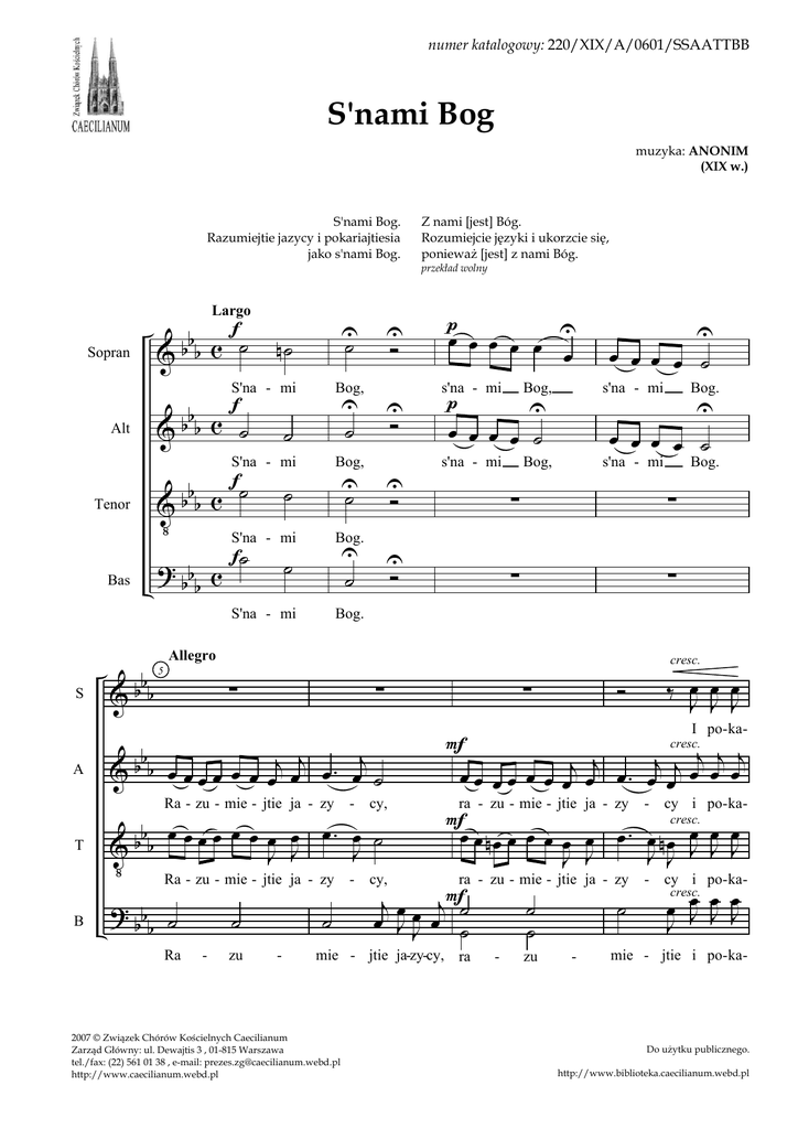 numer katalogowy: 220/XIX/A/0601/SSAATTBB S'nami Bog muzyka: ANONIM (XIX w.) S'nami Bog. Razumiejtie jazycy i pokariajtiesia jako s'nami Bog. Z nami [jest] Bóg. Rozumiejcie języki i ukorzcie się, poniewaŜ [jest] z nami Bóg. przekład wolny b c f˙ b & b Largo Sopran n˙ f S'na - mi Alt Tenor Bas S A T B b &bb b &bb c ˙ ˙ b Vbb c ˙ ? bb c b f˙ f˙ U U U s'na - mi U̇ U s'na - mi U U Ó Bog, Ó ˙ S'na - mi Bog, S'na - mi Ó ˙ S'na - mi p U œ œ œ œ ˙ Ó Bog. ˙ p œ œ œ œ œ U œ U̇ Bog, U œ œ œ œ ˙ s'na - mi Bog, s'na - mi ∑ b & b b œ œ œ œ œ œ œj œj œ . œj ˙ Ra - zu - mie - jtie ja - zy - cy, Ra - zu - mie - jtie ja - zy - cy, b œ œ œ. œ ˙ V b b œ œ œ œ œJ œJ J Ra - ˙ zu - Bog. ∑ ∑ ∑ ∑ Bog. ∑ ? bb ˙ b U œ œ œ œ ˙ Allegro 5 Bog. ˙ ∑ ‰ Jœ Jœ œJ Ó cresc. F j j j j j j j œ œ œ œ œ œ œ œ œ œ. œ œ œ œ I po- ka- cresc. F œ œ n œ œ œ œ œ œ œ . œ n œ Jœ Jœ œJ J J J J ra - zu - mie - jtie ja - zy j œ œ jF˙ œ JJ œ ˙ ra - zu - mie - jtie ja - zy mie - jtie ja-zy-cy, ra 2007 © Związek Chórów Kościelnych Caecilianum Zarząd Główny: ul. Dewajtis 3 , 01-815 Warszawa tel./fax: (22) 561 01 38 , e-mail: [email protected] http://www.caecilianum.webd.pl cresc. - ˙ ˙ zu ˙ - - cy i po- ka- - cy i po- ka- cresc. œ Jœ Jœ œJ J mie - jtie i po- ka- Do uŜytku publicznego. http://www.biblioteka.caecilianum.webd.pl S'nami Bog - ANONIM S b & b b œ. œ œ œ œ nœ œ J J J J J œ œ œ J J 10 œ ˙ ria - jtie-sia i po - ka - ria - jtie-sia ja - ko A b & b b œ. j j j j œ œ œj œ œ œ j j œ œ œ œ œ œ ria - jtie-sia i po - ka - ria - jtie-sia ja - ko T B S b œ. Vbb ? bb œ. œ œ œj œ œ œ œ œJ œ œ J J J J J ria - jtie-sia i po - ka - ria - jtie-sia ja - ko b bb b œœ œœ œœ œœ œœ Œ & b &bb œ œ s'na - mi T B S b Vbb Ó ? bb Ó b b & b b ˙ n˙ b &bb ˙ ˙ b ˙ Vbb ˙ s'na - mi T s'na - mi B ? bb ˙ b Bog, œ Œ ˙ s'na - mi Œ ˙˙ n œœ U̇ Bog, U ˙ Bog, U ˙ U Bog, ˙ Bog, 15 ja - ko Œ ˙ ja > > œœ œœ œœ Œ Ó > > S'na - mi Bog! > > n œœ œœ n œœ Œ Ó > > Bog, S'na - mi s'na - mi A œ ria - jtie-sia i po - ka - ria - jtie-sia ja - ko s'na - mi A œ œ œ œ œ œ J J œ œ œ J œJ œJ Jœ J œ ko ˙ rall. ˙ s'na - mi ˙ rall. ˙ rall. Bog, ja s'na - mi œ œ s'na - mi ˙ ˙. ˙ Bog. s'na - mi Bog, ja - ko œ œ J J œ œ œ œ ja - ko s'na - mi Bog, ja - ko œ œ J J j j œ œ ˙ ˙ ˙˙ ja - ko s'na - mi -2- ˙. Bog, œ œJ Jœ s'na - mi Bog, ja - ko ˙. Bog, j j œ œ œ ja - ko ˙˙ ˙. œ œJ Jœ Bog, ja - ko j j œ œ œ œ œ ja - ko s'na - mi Bog, ko œ Œ Ó Bog, ja - ko s'na - mi - œ Bog. ja - ko s'na - mi π Œ œJ œJ ˙ n ˙ ja - ko s'na - mi πœj œj ˙ ˙ Œ œ œ ˙ ˙ J J ko s'na - Bog, Bog, ja - ko Œ 20 - Bog, ja - ko Œ Bog! œœ œ Œ Ó s'na - mi ˙ > ˙ œ ˙ > Bog, ja >˙ œ œœ œœ œœ œ œœ j j œ nœ nœ œ nœ Ó π Œ œj œj ˙ s'na - mi s'na - mi Ó π Œ œj œj ˙ n˙ rall. j j œ œ ˙ ja - ko s'na - mi œ œ ˙ n˙ J J ja - ko s'na - mi j j œ œ ˙ ˙ œ œ ˙ ˙ J J ja - ko s'na - mi œ œJ Jœ U w Bog. U w Bog. U w Bog. U w Bog. http://www.biblioteka.caecilianum.webd.pl