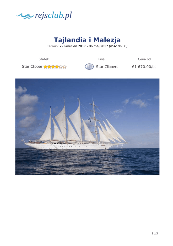 Tajlandia i Malezja Termin: 29 kwiecień 2017 - 06 maj 2017 (ilość dni: 8) Statek: Star Clipper Linia: Star Clippers Cena od: €1 670.00/os. 1 z3 TRASA REJSU Data Port Wpłynięcie Wypłynięcie Legenda dzień 1 sobota 29.04.2017 Phuket Tajlandia --:-- --:-- dzień 2 niedziela 30.04.2017 Wyspy Ko Similan Tajlandia --:-- --:-- dzień 3 poniedziałek 01.05.2017 Phang Nga Tajlandia --:-- --:-- dzień 3 poniedziałek 01.05.2017 Ko Hong Tajlandia --:-- --:-- dzień 4 wtorek 02.05.2017 Ko A Dang Tajlandia --:-- --:-- dzień 5 środa 03.05.2017 Penang Malezja --:-- --:-- dzień 6 czwartek 04.05.2017 Dzień na morzu --:-- --:-- dzień 7 piątek 05.05.2017 Malakka Malezja --:-- --:-- dzień 8 sobota 06.05.2017 Singapur Singapur --:-- --:-- 2 z3 CENNIK Cena katalogowa Kabina wewnętrzna od €1 670.00 Kabina zewnętrzna z oknem od €1 865.00 Suite (apartament) €3 670.00 Kabina jednoosobowa €2 150.00 3 osoba dorosła w kabinie €600.00 dziecko do 18 lat jako 3 i 4 osoba w kabinie €600.00 Opłaty portowe €195.00 Cena promocyjna Uwaga! Ceny za osobę w kabinie dwuosobowej. Cena zawiera: zakwaterowanie w kabinie wybranej kategorii; wyżywienie - 3 główne posiłki, przekąski między posiłkami, bufet lub przekąski o północy; napoje serwowane do śniadania i w bufetach samoobsługowych; serwis bagażowy podczas wejścia i zejścia ze statku; serwis kabinowy; korzystanie ze wszystkich urządzeń sportowo - rekreacyjnych znajdujących się na pokładzie statku (basen, jacuzzi, sala fitness, itp.); udział we wszystkich imprezach organizowanych na statku (przedstawienia w teatrze, koncerty, programy animacyjne itp.). Cena nie zawiera: kosztów dojazdu do portu; ewentualnych noclegów w hotelu przed/po rejsie i transferów; wycieczek fakultatywnych w trakcie rejsu; korzystania z barów, mini baru w kabinie oraz napojów zamawianych w restauracji; korzystania z punktów usługowych (fryzjer, pralnia, fotograf, salon piękności i odnowy biologicznej, internet) i wydatków osobistych; napiwków dla obsługi na statku (kwota uzależniona od długości rejsu); ubezpieczenia KL, NNW i bagaż, kosztów wiz (tam gdzie wymagane). 3 z3