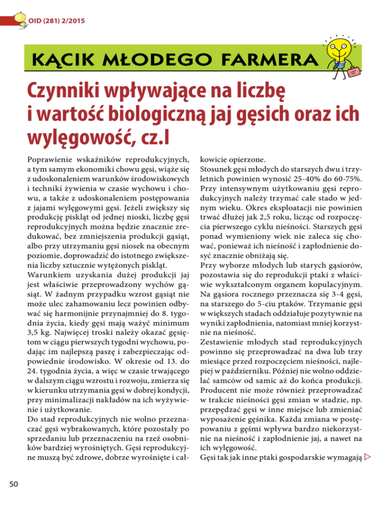 OID (281) 2/2015 Czynniki wpływające na liczbę i wartość biologiczną jaj gęsich oraz ich wylęgowość, cz.I Poprawienie wskaźników reprodukcyjnych, a tym samym ekonomiki chowu gęsi, wiąże się z udoskonaleniem warunków środowiskowych i techniki żywienia w czasie wychowu i chowu, a także z udoskonaleniem postępowania z jajami wylęgowymi gęsi. Jeżeli zwiększy się produkcję piskląt od jednej nioski, liczbę gęsi reprodukcyjnych można będzie znacznie zredukować, bez zmniejszenia produkcji gąsiąt, albo przy utrzymaniu gęsi niosek na obecnym poziomie, doprowadzić do istotnego zwiększenia liczby sztucznie wytężonych piskląt. Warunkiem uzyskania dużej produkcji jaj jest właściwie przeprowadzony wychów gąsiąt. W żadnym przypadku wzrost gąsiąt nie może ulec zahamowaniu lecz powinien odbywać się harmonijnie przynajmniej do 8. tygodnia życia, kiedy gęsi mają ważyć minimum 3,5 kg. Najwięcej troski należy okazać gęsiętom w ciągu pierwszych tygodni wychowu, podając im najlepszą paszę i zabezpieczając odpowiednie środowisko. W okresie od 13. do 24. tygodnia życia, a więc w czasie trwającego w dalszym ciągu wzrostu i rozwoju, zmierza się w kierunku utrzymania gęsi w dobrej kondycji, przy minimalizacji nakładów na ich wyżywienie i użytkowanie. Do stad reprodukcyjnych nie wolno przeznaczać gęsi wybrakowanych, które pozostały po sprzedaniu lub przeznaczeniu na rzeź osobników bardziej wyrośniętych. Gęsi reprodukcyjne muszą być zdrowe, dobrze wyrośnięte i cał50 kowicie opierzone. Stosunek gęsi młodych do starszych dwu i trzyletnich powinien wynosić 25-40% do 60-75%. Przy intensywnym użytkowaniu gęsi reprodukcyjnych należy trzymać całe stado w jednym wieku. Okres eksploatacji nie powinien trwać dłużej jak 2,5 roku, licząc od rozpoczęcia pierwszego cyklu nieśności. Starszych gęsi ponad wymieniony wiek nie zaleca się chować, ponieważ ich nieśność i zapłodnienie dosyć znacznie obniżają się. Przy wyborze młodych lub starych gąsiorów, pozostawia się do reprodukcji ptaki z właściwie wykształconym organem kopulacyjnym. Na gąsiora rocznego przeznacza się 3-4 gęsi, na starszego do 5-ciu ptaków. Trzymanie gęsi w większych stadach oddziałuje pozytywnie na wyniki zapłodnienia, natomiast mniej korzystnie na nieśność. Zestawienie młodych stad reprodukcyjnych powinno się przeprowadzać na dwa lub trzy miesiące przed rozpoczęciem nieśności, najlepiej w październiku. Później nie wolno oddzielać samców od samic aż do końca produkcji. Producent nie może również przeprowadzać w trakcie nieśności gęsi zmian w stadzie, np. przepędzać gęsi w inne miejsce lub zmieniać wyposażenie gęśnika. Każda zmiana w postępowaniu z gęśmi wpływa bardzo niekorzystnie na nieśność i zapłodnienie jaj, a nawet na ich wylęgowość. Gęsi tak jak inne ptaki gospodarskie wymagają OID (281) 2/2015 określonych warunków środowiskowych. Pomieszczenia dla nich powinny być połączone z wybiegami o powierzchni przynajmniej takiej samej jak gęśnik. Wybiegi można urządzić po obu stronach budynku. Utrzymaniu czystości i porządku służy utwardzenie wybiegu i pomieszczenia, wyposażenie ich w wodę i kanalizację, usytuowanie na glebach lekkich i przepuszczalnych. Odległość gęśnika od zabudowań gospodarskich musi wynosić minimum 200 m. Przed umieszczeniem jednodniówek lub gęsi dorosłych w budynku myje się pomieszczenie dokładnie gorącą wodą, najlepiej pod ciśnieniem, a następnie przeprowadza się pierwszą dezynfekcję. Po ustawieniu sprzętu oraz kojcy i ich zaścieleniu, dezynfekuje się pomieszczenie po raz drugi. W czasie dezynfekcji temperatura pomieszczenia powinna wynosić 20°C. Dezynfekcję wybiegów w zależności od ich rodzaju (utwardzone, słomiaste, piaskowe), przeprowadza się w różny sposób. Dezynfekcja taka jest bardzo ważna ze względu na zawsze występujące niebezpieczeństwo robaczyc. W okresie nieśności optymalna temperatura pomieszczenia dla gęsi to 15-18°C. Temperatura ta może być niższa i wynosić 10-15°C. Bardzo szkodliwe są natomiast wahania temperatury, przy których aktywność płciowa gąsiorów spada lub całkowicie zanika. Aktywność płciowa samców zanika też poniżej -2°C i powyżej 25°C. Ptaki można zatem wypuszczać na wybieg w sposób kontrolowany pomiędzy godziną 10:00 a 16:00, kiedy na dworze nie jest zbyt mroźno. Ptaków nie wolno również przegrzewać. Uzyskuje się to przez osłonięcie wybiegów daszkami przeciwsłonecznymi, a gęśników materiałem dobrze chroniącym przed nadmiernym nagrzaniem. Gęsi potrzebują dużo świeżego powietrza. Brak albo niedostatek wentylacji powoduje nagromadzenie się pary wodnej oraz szkodliwych dla gęsi gazów. Staje się to bezpośrednim powodem zmniejszenia się liczby zniesionych jaj, 52 pogorszenia jakości ich skorupy i zubożenia treści jaj w składniki pokarmowe, a tym samym obniżenia ich zdolności wylęgowej. Najkorzystniejsza dla gęsi jest wilgotność względna w granicach 65-75%. Na miesiąc przed rozpoczęciem nieśności, a nawet wcześniej, należy gęsiom zapewnić 1415 godzinny dzień świetlny. Ma on zasadniczy wpływ na liczbę oraz zdolność wylęgową jaj gęsi. Moc zainstalowanych w gęśniku żarówek powinna wynosić 5-7 W na 1m² podłogi, znajdujących się w odległości 2,5 m od siebie. W gęśnikach zaleca się także zastosować oświetlenie nocne koloru czerwonego. Ułatwia ono składanie jaj w gniazdach i pobieranie paszy przez ptaki również w nocy. Zwykle dzień świetlny przedłuża się rano od godziny 6:00 do 8:00, co zmusza gęsi do rozpoczęcia wczesnego żerowania. Ma to znaczenie w mniej ogrzewanym gęśniku. Po południu zapala się światło około godziny 16:00 i gasi je o godzinie 20:00. Dzień świetlny dłuższy niż 16 godzin na dobę nie przyczynia się do wzrostu produkcji jaj. W przypadku korzystania przez gęsi