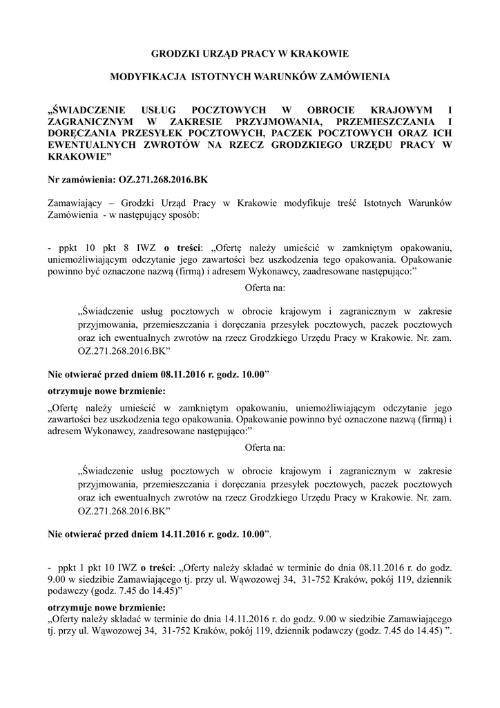 GRODZKI URZĄD PRACY W KRAKOWIE MODYFIKACJA ISTOTNYCH WARUNKÓW ZAMÓWIENIA „ŚWIADCZENIE USŁUG POCZTOWYCH W OBROCIE KRAJOWYM I ZAGRANICZNYM W ZAKRESIE PRZYJMOWANIA, PRZEMIESZCZANIA I DORĘCZANIA PRZESYŁEK POCZTOWYCH, PACZEK POCZTOWYCH ORAZ ICH EWENTUALNYCH ZWROTÓW NA RZECZ GRODZKIEGO URZĘDU PRACY W KRAKOWIE” Nr zamówienia: OZ.271.268.2016.BK Zamawiający – Grodzki Urząd Pracy w Krakowie modyfikuje treść Istotnych Warunków Zamówienia - w następujący sposób: - ppkt 10 pkt 8 IWZ o treści: „Ofertę należy umieścić w zamkniętym opakowaniu, uniemożliwiającym odczytanie jego zawartości bez uszkodzenia tego opakowania. Opakowanie powinno być oznaczone nazwą (firmą) i adresem Wykonawcy, zaadresowane następująco:” Oferta na: „Świadczenie usług pocztowych w obrocie krajowym i zagranicznym w zakresie przyjmowania, przemieszczania i doręczania przesyłek pocztowych, paczek pocztowych oraz ich ewentualnych zwrotów na rzecz Grodzkiego Urzędu Pracy w Krakowie. Nr. zam. OZ.271.268.2016.BK” Nie otwierać przed dniem 08.11.2016 r. godz. 10.00” otrzymuje nowe brzmienie: „Ofertę należy umieścić w zamkniętym opakowaniu, uniemożliwiającym odczytanie jego zawartości bez uszkodzenia tego opakowania. Opakowanie powinno być oznaczone nazwą (firmą) i adresem Wykonawcy, zaadresowane następująco:” Oferta na: „Świadczenie usług pocztowych w obrocie krajowym i zagranicznym w zakresie przyjmowania, przemieszczania i doręczania przesyłek pocztowych, paczek pocztowych oraz ich ewentualnych zwrotów na rzecz Grodzkiego Urzędu Pracy w Krakowie. Nr. zam. OZ.271.268.2016.BK” Nie otwierać przed dniem 14.11.2016 r. godz. 10.00”. - ppkt 1 pkt 10 IWZ o treści: „Oferty należy składać w terminie do dnia 08.11.2016 r. do godz. 9.00 w siedzibie Zamawiającego tj. przy ul. Wąwozowej 34, 31-752 Kraków, pokój 119, dziennik podawczy (godz. 7.45 do 14.45)” otrzymuje nowe brzmienie: „Oferty należy składać w terminie do dnia 14.11.2016 r. do godz. 9.00 w siedzibie Zamawiającego tj. przy ul. Wąwozowej 34, 31-752 Kraków, pokój 119, dziennik podawczy (godz. 7.45 do 14.45) ”. - ppkt 3 pkt 10 IWZ o treści: „Otwarcie ofert jest jawne i nastąpi tego samego dnia tj 08 .11.2016 r. o godz. 10.00 w pok. 217 w siedzibie Zamawiającego przy ul. Wawozowej 34.” otrzymuje nowe brzmienie: „Otwarcie ofert jest jawne i nastąpi tego samego dnia tj 14.11.2016 r. o godz. 10.00 w pok. 217 w siedzibie Zamawiającego przy ul. Wawozowej 34.” - w załączniku nr 5 do IWZ – wzór umowy, § 7 o treści: „Kary umowne 1. Strony ustalają, że zapłacą kary umowne: 1) Zamawiający w przypadku odstąpienia przez Wykonawcę od umowy z przyczyn, leżących po stronie Zamawiającego – 10% maksymalnego wynagrodzenia brutto określonego w § 6 ust. 1 niniejszej umowy. 2) Wykonawca w przypadku: a) utraty, ubytku, uszkodzenia przesyłki lub paczki bądź niewykonania lub nienależytego wykonania przedmiotu umowy – zapłaci Zamawiającemu należne odszkodowanie zgodnie z przepisami rozdziału 8 ustawy z dnia 23 listopada 2012 r. Prawo pocztowe (Dz. U. Z 2016. 1113 ze zm. ). b) nie odebrania od Zamawiającego przesyłek w dniu lub czasie, o których mowa w § 2 niniejszej umowy zapłaci każdorazowo Zamawiającemu karę pieniężną w wysokości 500,00 zł (słownie: pięćset złotych 00/100). W takim przypadku Wykonawca zostanie dodatkowo obciążony kosztami z tytułu zastępczego wykonania przedmiotowej usługi, jeżeli Zamawiający zleci jej zastępcze wykonanie innemu operatorowi. c) odstąpienia przez Zamawiającego od umowy z przyczyn leżących po stronie Wykonawcy – 10% maksymalnego wynagrodzenia brutto określonego w § 6 ust. 1 niniejszej umowy. 2. Strony zastrzegają sobie prawo dochodzenia na zasadach ogólnych odszkodowania uzupełniającego do wysokości rzeczywiście poniesionej szkody”. otrzymuje nowe brzmienie: „Kary umowne i siła wyższa 1. Strony ustalają, że zapłacą kary umowne: 1) Zamawiający w przypadku odstąpienia przez Wykonawcę od umowy z przyczyn, leżących po stronie Zamawiającego – 10% maksymalnego wynagrodzenia brutto określonego w § 6 ust. 1 niniejszej umowy. 2) Wykonawca w przypadku: a) utraty, ubytku, uszkodzenia przesyłki lub paczki bądź niewykonania lub nienależytego wykonania przedmiotu umowy – zapłaci Zamawiającemu należne odszkodowanie zgodnie z przepisami rozdziału 8 ustawy z dnia 23 listopada 2012 r. Prawo pocztowe (Dz. U. Z 2016. 1113 ze zm. ). b) nie odebrania od Zamawiającego przesyłek w dniu lub czasie, o których mowa w § 2 niniejszej umowy zapłaci każdorazowo Zamawiającemu karę pieniężną w wysokości 300,00 zł (słownie: trzysta złotych 00/100). W takim przypadku Wykonawca zostanie dodatkowo obciążony kosztami z tytułu zastępczego wykonania przedmiotowej usługi, jeżeli Zamawiający zleci jej zastępcze wykonanie innemu operatorowi. c) odstąpienia przez Zamawiającego od umowy z przyczyn leżących po stronie Wykonawcy – 10% maksymalnego wynagrodzenia brutto określonego w § 6 ust. 1 niniejszej umowy. 2. Strony zastrzegają sobie prawo dochodzenia na zasadach ogólnych odszkodowania uzupełniającego do wysokości rzeczywiście poniesionej szkody. 3. Strony nie są odpowiedzialne za naruszenie obowiązków wynikających z Umowy w przypadku, gdy wyłączną przyczyną naruszenia jest działanie siły wyższej. 4. Przez siłę wyższą rozumie się zdarzenie bądź połączenie zdarzeń lub okoliczności, niezależnych od Stron, które zasadniczo utrudniają lub uniemożliwiają wykonywanie zobowiązań danej Strony wynikających z Umowy, a których dana Strona nie mogła przewidzieć ani im zapobiec lub przezwyciężyć poprzez działanie z dochowaniem należytej staranności. 5. W przypadku zaistnienia siły wyższej Strona, której dotyczy działanie siły wyższej, zobowiązana jest poinformować drugą Stronę na piśmie o wystąpieniu siły wyższej, ze wskazaniem 