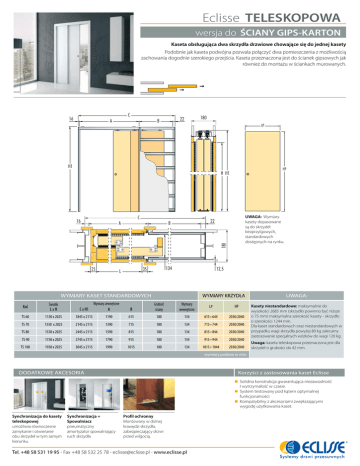 Eclisse TELESKOPOWA wersja do ŚCIANY GIPS-KARTON Kaseta obsługująca dwa skrzydła drzwiowe chowające się do jednej kasety Podobnie jak kaseta podwójna pozwala połączyć dwa pomieszczenia z możliwością zachowania dogodnie szerokiego przejścia. Kaseta przeznaczona jest do ścianek gipsowych jak również do montażu w ściankach murowanych. 16 C A 180 22 B LP H1 HP H H1 16 C UWAGA: Wymiary kasety dopasowane są do skrzydeł bezprzylgowych, standardowych dostępnych na rynku. 22 B 180 A 25 134 35 L 12,5 WYMIARY KASET STANDARDOWYCH Wymiary zewnętrzne WYMIARY KRZYDŁA LxH C x H1 A B Grubość ściany Wymiary wewnętrzne LP HP TS 60 1130 x 2025 1845 x 2115 1190 615 180 134 615÷644 2030/2040 TS 70 1330 x 2025 2145 x 2115 1390 715 180 134 715÷744 2030/2040 TS 80 1530 x 2025 2445 x 2115 1590 815 180 134 815÷844 2030/2040 TS 90 1730 x 2025 2745 x 2115 1790 915 180 134 915÷944 2030/2040 TS 100 1930 x 2025 3045 x 2115 1990 1015 180 134 1015÷1044 2030/2040 Kod Światło Uwaga: Kasety niestandardowe: maksymalnie do wysokości 2685 mm (skrzydło powinno być niższe o 75 mm) maksymalna szerokość kasety - skrzydło o szerokości 1244 mm. Dla kaset standardowych oraz niestandardowych w przypadku wagi skrzydła powyżej 80 kg zalecamy zastosowanie specjalnych wózków do wagi 120 kg. Uwaga: kaseta teleskopowa przeznaczona jest dla skrzydeł o grubości do 42 mm. wymiary podano w mm. Dodatkowe akcesoria Korzyści z zastosowania kaset Eclisse Solidna konstrukcja gwarantująca niezawodność I wytrzymałość w czasie. System testowany pod kątem optymalnej funkcjonalności Kompatybilny z akcesoriami zwiększającymi wygodę użytkowania kaset. Synchronizacja do kasety teleskopowej umożliwia równoczesne zamykanie i otwieranie obu skrzydeł w tym samym kierunku. Synchronizacja + Spowalniacz pneumatyczny amortyzator spowalniający ruch skrzydła Profil ochronny Montowany w dolnej krawędzi skrzydła, zabezpieczający drzwi przed wilgocią. Tel. +48 58 531 19 95 - Fax +48 58 532 25 78 - [email protected] - www.eclisse.pl Systemy drzwi przesuwnych