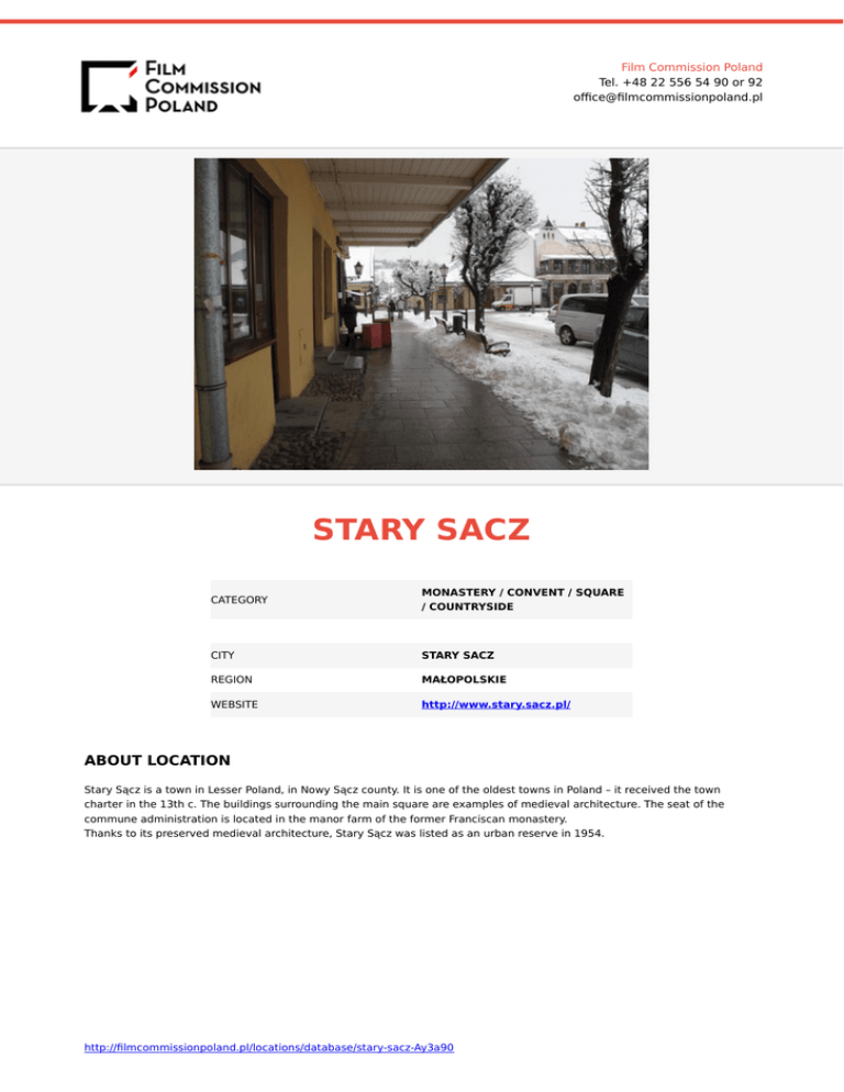 Film Commission Poland Tel. +48 22 556 54 90 or 92 office@filmcommissionpoland.pl STARY SACZ CATEGORY MONASTERY / CONVENT / SQUARE / COUNTRYSIDE CITY STARY SACZ REGION MAŁOPOLSKIE WEBSITE http://www.stary.sacz.pl/ ABOUT LOCATION Stary Sącz is a town in Lesser Poland, in Nowy Sącz county. It is one of the oldest towns in Poland – it received the town charter in the 13th c. The buildings surrounding the main square are examples of medieval architecture. The seat of the commune administration is located in the manor farm of the former Franciscan monastery. Thanks to its preserved medieval architecture, Stary Sącz was listed as an urban reserve in 1954. http://filmcommissionpoland.pl/locations/database/stary-sacz-Ay3a90