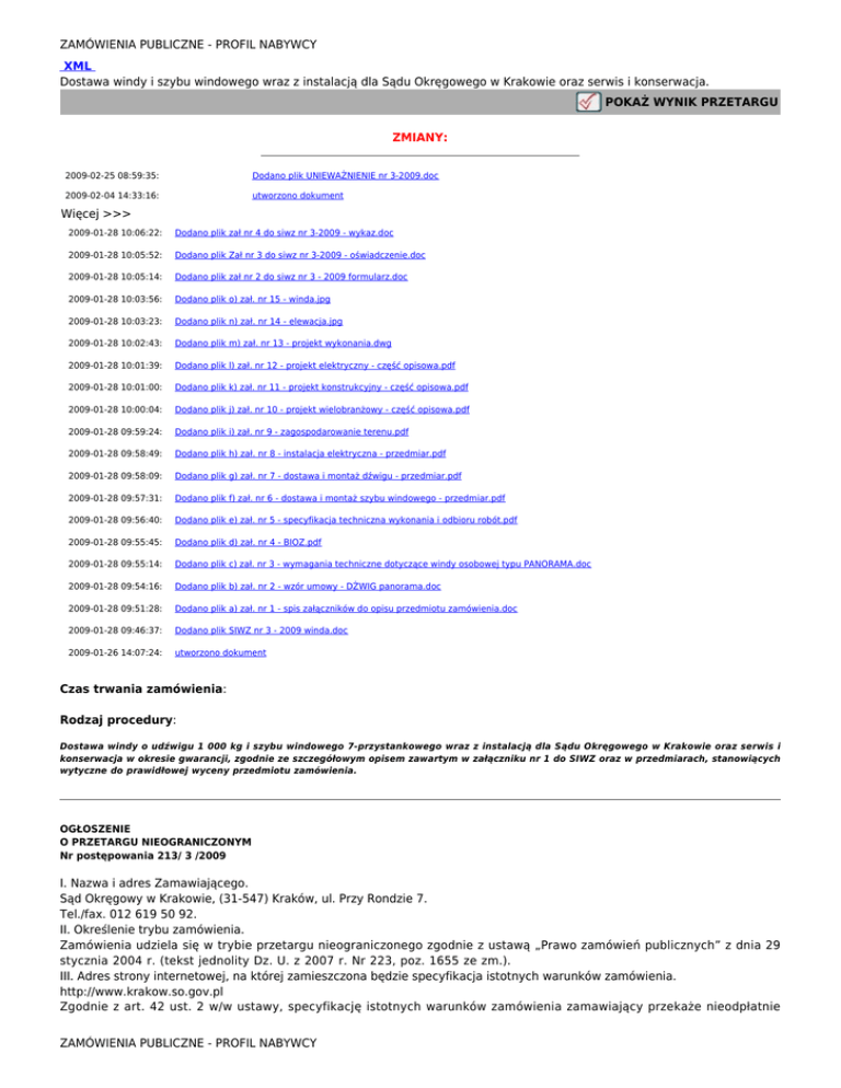ZAMÓWIENIA PUBLICZNE - PROFIL NABYWCY XML Dostawa windy i szybu windowego wraz z instalacją dla Sądu Okręgowego w Krakowie oraz serwis i konserwacja. POKAŻ WYNIK PRZETARGU ZMIANY: 2009-02-25 08:59:35: Dodano plik UNIEWAŻNIENIE nr 3-2009.doc 2009-02-04 14:33:16: utworzono dokument Więcej >>> 2009-01-28 10:06:22: Dodano plik zał nr 4 do siwz nr 3-2009 - wykaz.doc 2009-01-28 10:05:52: Dodano plik Zał nr 3 do siwz nr 3-2009 - oświadczenie.doc 2009-01-28 10:05:14: Dodano plik zał nr 2 do siwz nr 3 - 2009 formularz.doc 2009-01-28 10:03:56: Dodano plik o) zał. nr 15 - winda.jpg 2009-01-28 10:03:23: Dodano plik n) zał. nr 14 - elewacja.jpg 2009-01-28 10:02:43: Dodano plik m) zał. nr 13 - projekt wykonania.dwg 2009-01-28 10:01:39: Dodano plik l) zał. nr 12 - projekt elektryczny - część opisowa.pdf 2009-01-28 10:01:00: Dodano plik k) zał. nr 11 - projekt konstrukcyjny - część opisowa.pdf 2009-01-28 10:00:04: Dodano plik j) zał. nr 10 - projekt wielobranżowy - część opisowa.pdf 2009-01-28 09:59:24: Dodano plik i) zał. nr 9 - zagospodarowanie terenu.pdf 2009-01-28 09:58:49: Dodano plik h) zał. nr 8 - instalacja elektryczna - przedmiar.pdf 2009-01-28 09:58:09: Dodano plik g) zał. nr 7 - dostawa i montaż dźwigu - przedmiar.pdf 2009-01-28 09:57:31: Dodano plik f) zał. nr 6 - dostawa i montaż szybu windowego - przedmiar.pdf 2009-01-28 09:56:40: Dodano plik e) zał. nr 5 - specyfikacja techniczna wykonania i odbioru robót.pdf 2009-01-28 09:55:45: Dodano plik d) zał. nr 4 - BIOZ.pdf 2009-01-28 09:55:14: Dodano plik c) zał. nr 3 - wymagania techniczne dotyczące windy osobowej typu PANORAMA.doc 2009-01-28 09:54:16: Dodano plik b) zał. nr 2 - wzór umowy - DŻWIG panorama.doc 2009-01-28 09:51:28: Dodano plik a) zał. nr 1 - spis załączników do opisu przedmiotu zamówienia.doc 2009-01-28 09:46:37: Dodano plik SIWZ nr 3 - 2009 winda.doc 2009-01-26 14:07:24: utworzono dokument Czas trwania zamówienia: Rodzaj procedury: Dostawa windy o udźwigu 1 000 kg i szybu windowego 7-przystankowego wraz z instalacją dla Sądu Okręgowego w Krakowie oraz serwis i konserwacja w okresie gwarancji, zgodnie ze szczegółowym opisem zawartym w załączniku nr 1 do SIWZ oraz w przedmiarach, stanowiących wytyczne do prawidłowej wyceny przedmiotu zamówienia. OGŁOSZENIE O PRZETARGU NIEOGRANICZONYM Nr postępowania 213/ 3 /2009 I. Nazwa i adres Zamawiającego. Sąd Okręgowy w Krakowie, (31-547) Kraków, ul. Przy Rondzie 7. Tel./fax. 012 619 50 92. II. Określenie trybu zamówienia. Zamówienia udziela się w trybie przetargu nieograniczonego zgodnie z ustawą „Prawo zamówień publicznych” z dnia 29 stycznia 2004 r. (tekst jednolity Dz. U. z 2007 r. Nr 223, poz. 1655 ze zm.). III. Adres strony internetowej, na której zamieszczona będzie specyfikacja istotnych warunków zamówienia. http://www.krakow.so.gov.pl Zgodnie z art. 42 ust. 2 w/w ustawy, specyfikację istotnych warunków zamówienia zamawiający przekaże nieodpłatnie ZAMÓWIENIA PUBLICZNE - PROFIL NABYWCY ZAMÓWIENIA PUBLICZNE - PROFIL NABYWCY wykonawcy na jego wniosek w terminie 5 dni. IV. Określenie przedmiotu oraz wielkości lub zakresu zamówienia, z podaniem informacji o możliwości składania ofert częściowych. Przedmiotem zamówienia o szacunkowej wartości powyżej kwoty 133 000 euro jest: dostawa windy o udźwigu 1 000 kg i szybu windowego 7-przystankowego wraz z instalacją dla Sądu Okręgowego w Krakowie oraz serwis i konserwacja w okresie gwarancji, zgodnie ze szczegółowym opisem zawartym w załączniku nr 1 do SIWZ oraz w przedmiarach, stanowiących wytyczne do prawidłowej wyceny przedmiotu zamówienia. CPV 42416100-6. Zakres zamówienia obejmuje: 1- dostawę z instalacją konstrukcji nośnej i obudowy szybu windowego 7-przystankowego, 2- dostawę z instalacją układu napędowego windy i kabiny typu „panorama” o udźwigu 1 000 kg, 3- dostawę wszystkich materiałów budowlanych, elektrycznych, montażowych oraz sprzętu niezbędnych do realizacji zamówienia, 4- prace pomocnicze, a w szczególności: a) uzupełnienie stropów podwieszanych, uzupełnienie i przecieranie tynków, malowanie; b) mechaniczne wykonywanie otworów w betonie i cegle; c) drobne prace murarskie związane z posadowieniem urządzeń; d) wykonanie wszystkich połączeń i montaż niezbędnych urządzeń do prawidłowej pracy windy; 5- uruchomienie windy i wykonanie dokumentacji powykonawczej prac instalacyjnych. Okres gwarancji: 5 lat. Zamawiający nie dopuszcza możliwości składania ofert częściowych. Pod uwagę będą brane wyłącznie oferty obejmujące całość zamówienia. Zamawiający nie dopuszcza możliwości składania ofert wariantowych. W niniejszym postępowaniu Zamawiający nie przewiduje zamówień uzupełniających, o których mowa w art. 67 ust. 1 pkt 6 i 7 lub art. 134 ust. 6 pkt 3 i 4. V. Informację o możliwości złożenia oferty wariantowej. Zamawiający nie dopuszcza możliwość składania ofert wariantowych (odmienny niż określony przez Zamawiającego sposób wykonania zamówienia publicznego nie będzie brany pod uwagę). VI. Termin wykonania zamówienia. Termin wykonania zamówienia: – 4 m-ce od podpisania umowy. VII. Opis warunków udziału w postępowaniu oraz opis sposobu dokonywania oceny spełnienia tych warunków. 1. O udzielenie zamówienia mogą ubiegać się wykonawcy, którzy spełniają warunki określone w art. 22 ust. 1 ustawy z dnia 29 stycznia 2004 r. Prawo zamówień publicznych (tekst jednolity Dz. U. z 2007 r. Nr 223, poz. 1655 ze zm.), tj.: 1.1- posiadają uprawnienia do wykonywania określonej działalności lub czynności, jeżeli ustawy nakładają obowiązek posiadania takich uprawnień, 1.2- posiadają niezbędną wiedzę i doświadczenie oraz dysponują potencjałem technicznym i osobami zdolnymi do wykonania zamówienia lub przedstawią pisemne zobowiązanie innych podmiotów do udostępnienia potencjału technicznego i osób zdolnych do wykonania zamówienia, tz