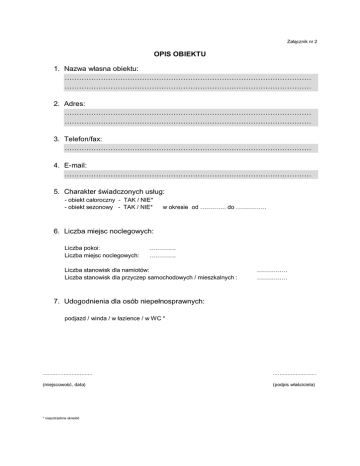 Załącznik nr 2 OPIS OBIEKTU 1. Nazwa własna obiektu: ………………………………………………………………………………………… ………………………………………………………………………………………… 2. Adres: ………………………………………………………………………………………… ………………………………………………………………………………………… 3. Telefon/fax: ………………………………………………………………………………………… 4. E-mail: ………………………………………………………………………………………… 5. Charakter świadczonych usług: - obiekt całoroczny - TAK / NIE* - obiekt sezonowy - TAK / NIE* w okresie od …………. do …………… 6. Liczba miejsc noclegowych: Liczba pokoi: Liczba miejsc noclegowych: …………. …………. Liczba stanowisk dla namiotów: Liczba stanowisk dla przyczep samochodowych / mieszkalnych : …………… …………… 7. Udogodnienia dla osób niepełnosprawnych: podjazd / winda / w łazience / w WC * …………………………. ……………………… (miejscowość, data) (podpis właściciela) * niepotrzebne skreślić