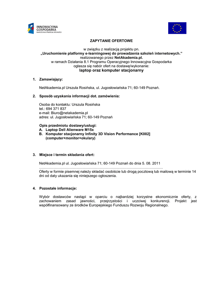 ZAPYTANIE OFERTOWE w związku z realizacją projektu pn. „Uruchomienie platformy e-learningowej do prowadzenia szkoleń internetowych.” realizowanego przez NetAkademia.pl. w ramach Działania 8.1 Programu Operacyjnego Innowacyjna Gospodarka ogłasza się nabór ofert na dostawę/wykonanie: laptop oraz komputer stacjonarny 1. Zamawiający: NetAkademia.pl Urszula Rosińska, ul. Jugosłowiańska 71; 60-149 Poznań. 2. Sposób uzyskania informacji dot. zamówienia: Osoba do kontaktu: Urszula Rosińska tel.: 694 371 837 e-mail: [email protected] adres: ul. Jugosłowiańska 71; 60-149 Poznań Opis przedmiotu dostawy/usługi: A. Laptop Dell Alienware M15x B. Komputer stacjonarny Infinity 3D Vision Performance [K002] (computer+monitor+okulary) 3. Miejsce i termin składania ofert: NetAkademia.pl ul. Jugosłowiańska 71; 60-149 Poznań do dnia 5. 08. 2011 ………………………………………………………………………………………… Oferty w formie pisemnej należy składać osobiście lub drogą pocztową lub mailową w terminie 14 dni od daty ukazania się niniejszego ogłoszenia. 4. Pozostałe informacje: Wybór dostawców nastąpi w oparciu o najbardziej korzystne ekonomicznie oferty, z zachowaniem zasad jawności, przejrzystości i uczciwej konkurencji. Projekt jest współfinansowany ze środków Europejskiego Funduszu Rozwoju Regionalnego.