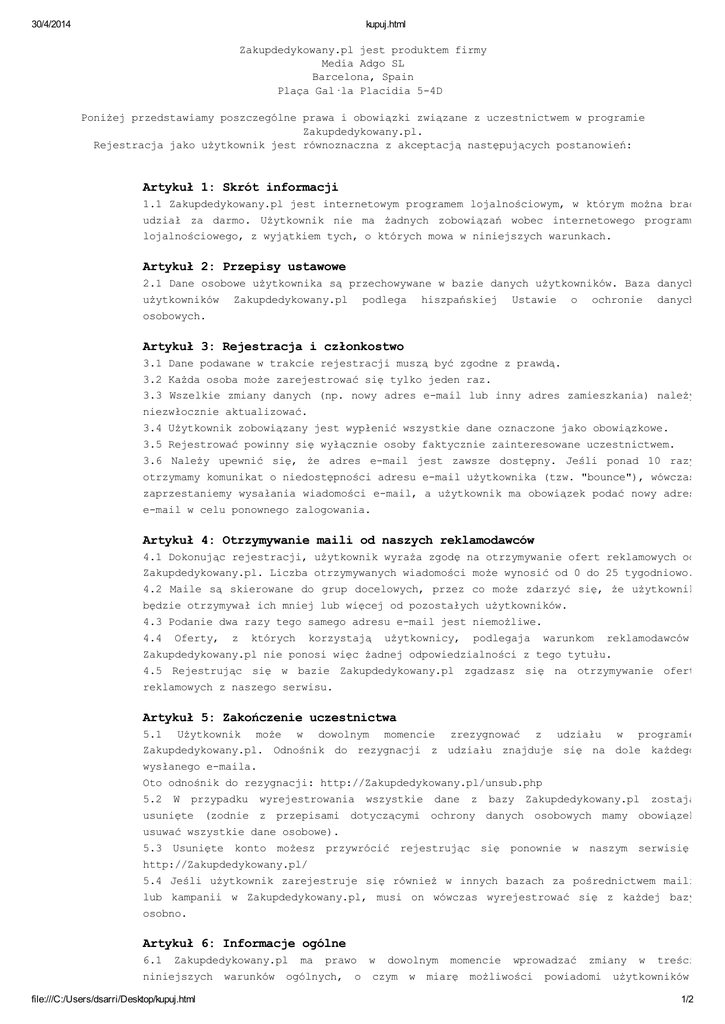 30/4/2014 kupuj.html Zakupdedykowany.pl jest produktem firmy Media Adgo SL Barcelona, Spain Plaça Gal·la Placidia 5-4D Poniżej przedstawiamy poszczególne prawa i obowiązki związane z uczestnictwem w programie Zakupdedykowany.pl. Rejestracja jako użytkownik jest równoznaczna z akceptacją następujących postanowień: Artykuł 1: Skrót informacji 1.1 Zakupdedykowany.pl jest internetowym programem lojalnościowym, w którym można brać udział za darmo. Użytkownik nie ma żadnych zobowiązań wobec internetowego programu lojalnościowego, z wyjątkiem tych, o których mowa w niniejszych warunkach. Artykuł 2: Przepisy ustawowe 2.1 Dane osobowe użytkownika są przechowywane w bazie danych użytkowników. Baza danych użytkowników Zakupdedykowany.pl podlega hiszpańskiej Ustawie o ochronie danych osobowych. Artykuł 3: Rejestracja i członkostwo 3.1 Dane podawane w trakcie rejestracji muszą być zgodne z prawdą. 3.2 Każda osoba może zarejestrować się tylko jeden raz. 3.3 Wszelkie zmiany danych (np. nowy adres e-mail lub inny adres zamieszkania) należy niezwłocznie aktualizować. 3.4 Użytkownik zobowiązany jest wypłenić wszystkie dane oznaczone jako obowiązkowe. 3.5 Rejestrować powinny się wyłącznie osoby faktycznie zainteresowane uczestnictwem. 3.6 Należy upewnić się, że adres e-mail jest zawsze dostępny. Jeśli ponad 10 razy otrzymamy komunikat o niedostępności adresu e-mail użytkownika (tzw. "bounce"), wówczas zaprzestaniemy wysałania wiadomości e-mail, a użytkownik ma obowiązek podać nowy adres e-mail w celu ponownego zalogowania. Artykuł 4: Otrzymywanie maili od naszych reklamodawców 4.1 Dokonując rejestracji, użytkownik wyraża zgodę na otrzymywanie ofert reklamowych od Zakupdedykowany.pl. Liczba otrzymywanych wiadomości może wynosić od 0 do 25 tygodniowo. 4.2 Maile są skierowane do grup docelowych, przez co może zdarzyć się, że użytkownik będzie otrzymywał ich mniej lub więcej od pozostałych użytkowników. 4.3 Podanie dwa razy tego samego adresu e-mail jest niemożliwe. 4.4 Oferty, z których korzystają użytkownicy, podlegaja warunkom reklamodawców. Zakupdedykowany.pl nie ponosi więc żadnej odpowiedzialności z tego tytułu. 4.5 Rejestrując się w bazie Zakupdedykowany.pl zgadzasz się na otrzymywanie ofert reklamowych z naszego serwisu. Artykuł 5: Zakończenie uczestnictwa 5.1 Użytkownik może w dowolnym momencie zrezygnować z udziału w programie Zakupdedykowany.pl. Odnośnik do rezygnacji z udziału znajduje się na dole każdego wysłanego e-maila. Oto odnośnik do rezygnacji: http://Zakupdedykowany.pl/unsub.php 5.2 W przypadku wyrejestrowania wszystkie dane z bazy Zakupdedykowany.pl zostają usunięte (zodnie z przepisami dotyczącymi ochrony danych osobowych mamy obowiązek usuwać wszystkie dane osobowe). 5.3 Usunięte konto możesz przywrócić rejestrując się ponownie w naszym serwisię: http://Zakupdedykowany.pl/ 5.4 Jeśli użytkownik zarejestruje się również w innych bazach za pośrednictwem maili lub kampanii w Zakupdedykowany.pl, musi on wówczas wyrejestrować się z każdej bazy osobno. Artykuł 6: Informacje ogólne 6.1 Zakupdedykowany.pl ma prawo w dowolnym momencie wprowadzać zmiany w treści niniejszych warunków ogólnych, o czym w miarę możliwości powiadomi użytkowników. file:///C:/Users/dsarri/Desktop/kupuj.html 1/2 30/4/2014 kupuj.html Aktualna wersje warunków ogólnych można znaleźć na portalu Zakupdedykowany.pl. Po wprowadzeniu zmian w treści niniejszych warunków ogólnych poprzednie warunki przestają obowiązywać. Ewentualne spory rozstrzygane będą wyłącznie przed właściwym sadem w Hiszpanii. W zakresię internetowego programu lojalnościowego i niniejszych warunków ogólnych obowiązuje prawo hiszpańskie. 6.2 Zakupdedykowany.pl może w każdej chwili wprowadzać zmiany dotyczące tego internetowego programu lojalnościowego. 6.3 Jeśli użytkownik nie akceptuje ewentualnych zmian warunków ogólnych, powinien on samodzielnie wyrejestrować się. Pozostanie użytkownikiem oznacza automatyczną akceptację ewentualnych zmian warunków. Artykuł 7: Informacje końcowe 7.1 Zakupdedykowany.pl nie wysyła wiadomości niepożądanych, które możesz traktować jako spam. Posiadamy wewnętrzną politykę anty-spamową oraz dobre praktyki tak, aby każdy użytkownik mógł otrzymywać najciekawsze oferty że świata online. 7.2 Umieszczanie niepożądanych wiadomości lub wysałanie wiadomości bez wymaganej zgody odbiorcy traktowane jest jako SPAM. Nasi partnerzy: Playmillion file:///C:/Users/dsarri/Desktop/kupuj.html 2/2