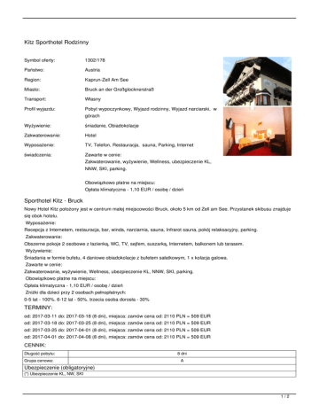 Kitz Sporthotel Rodzinny Symbol oferty: 1302/178 Państwo: Austria Region: Kaprun-Zell Am See Miasto: Bruck an der Großglocknerstraß Transport: Własny Profil wyjazdu: Pobyt wypoczynkowy, Wyjazd rodzinny, Wyjazd narciarski, w Wyżywienie: śniadanie, Obiadokolacje Zakwaterowanie: Hotel Wyposażenie: TV, Telefon, Restauracja, sauna, Parking, Internet świadczenia: Zawarte w cenie: górach Zakwaterowanie, wyżywienie, Wellness, ubezpieczenie KL, NNW, SKI, parking. Obowiązkowo płatne na miejscu: Opłata klimatyczna - 1,10 EUR / osobę / dzień Sporthotel Kitz - Bruck Nowy Hotel Kitz położony jest w centrum małej miejscowości Bruck, około 5 km od Zell am See. Przystanek skibusu znajduje się obok hotelu. Wyposażenie: Recepcja z Internetem, restauracja, bar, winda, narciarnia, sauna, Infrarot sauna, pokój relaksacyjny, parking. Zakwaterowanie: Obszerne pokoje 2 osobowe z łazienką, WC, TV, sejfem, suszarką, Internetem, balkonem lub tarasem. Wyżywienie: Śniadania w formie bufetu, 4 daniowe obiadokolacje z bufetem sałatkowym, 1 x kolacja galowa. Zawarte w cenie: Zakwaterowanie, wyżywienie, Wellness, ubezpieczenie KL, NNW, SKI, parking. Obowiązkowo płatne na miejscu: Opłata klimatyczna - 1,10 EUR / osobę / dzień Zniżki dla dzieci przy 2 osobach pełnopłatnych: 0-5 lat - 100%. 6-12 lat - 50%. trzecia osoba dorosła - 30% TERMINY: od: 2017-03-11 do: 2017-03-18 (8 dni), miejsca: zamów cena od: 2110 PLN = 509 EUR od: 2017-03-18 do: 2017-03-25 (8 dni), miejsca: zamów cena od: 2110 PLN = 509 EUR od: 2017-03-25 do: 2017-04-01 (8 dni), miejsca: zamów cena od: 2110 PLN = 509 EUR od: 2017-04-01 do: 2017-04-08 (8 dni), miejsca: zamów cena od: 2110 PLN = 509 EUR CENNIK: Długość pobytu: 8 dni Grupa cenowa: A Ubezpieczenie (obligatoryjne) (*) Ubezpieczenie KL, NW, SKI 1/2 14 (*) Turystyczny Fundusz Gwarancyjny Pobyt w obiekcie (do wyboru) 2.5 (*) Pokój rodzinny standardowo dla osób: 4 minimalnie: 2 Rodzaj osoby (do wyboru) Dziecko 0-5 (*) Osoba dorosła Dziecko 6-12 Rodzaj osoby (opcjonalny) 3 osoba dorosła na dostawce (-) (-) 495 248 347 Waluta: EUR Aktualne ceny z systemu S.A.R.T. (-) - cena usługi, podatku kalkulowana przy osobie lub gratis (*) - kwota wliczona w cenę standardową 2/2