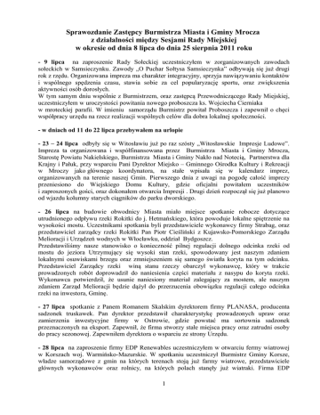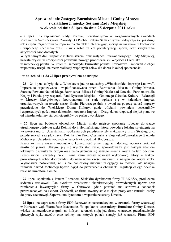 Sprawozdanie Zastępcy Burmistrza Miasta i Gminy Mrocza z działalności między Sesjami Rady Miejskiej w okresie od dnia 8 lipca do dnia 25 sierpnia 2011 roku - 9 lipca na zaproszenie Rady Sołeckiej uczestniczyłem w zorganizowanych zawodach sołeckich w Samsieczynku. Zawody „O Puchar Sołtysa Samsieczynka” odbywają się już drugi rok z rzędu. Organizowana impreza ma charakter integracyjny, sprzyja nawiązywaniu kontaktów i wspólnego spędzenia czasu, stawia sobie za cel popularyzację sportu, oraz zwiększenia aktywności osób dorosłych. W tym samym dniu wspólnie z Burmistrzem, oraz zastępcą Przewodniczącego Rady Miejskiej, uczestniczyłem w uroczystości powitania nowego proboszcza ks. Wojciecha Cierniaka w mroteckiej parafii. W imieniu samorządu Burmistrz powitał Proboszcza i zapewnił o chęci współpracy urzędu na rzecz realizacji wspólnych celów dla dobra lokalnej społeczności. - w dniach od 11 do 22 lipca przebywałem na urlopie - 23 – 24 lipca odbyły się w Witosławiu już po raz szósty „Witosławskie Impresje Ludowe”. Impreza ta organizowana i współfinansowana przez Burmistrza Miasta i Gminy Mrocza, Starostę Powiatu Nakielskiego, Burmistrza Miasta i Gminy Nakło nad Notecią, Partnerstwa dla Krajny i Pałuk, przy wsparciu Pani Dyrektor Miejsko – Gminnego Ośrodka Kultury i Rekreacji w Mroczy jako głównego koordynatora, na stałe wpisała się w kalendarz imprez, organizowanych na terenie naszej Gmin. Pierwszego dnia z uwagi na pogodę całość imprezy przeniesiono do Wiejskiego Domu Kultury, gdzie oficjalni powitałem uczestników i zaproszonych gości, oraz dokonałem otwarcia Impresji . Drugi dzień rozpoczął się już planowo od wjazdu kolumny starych ciągników do parku dworskiego. - 26 lipca na budowie obwodnicy Miasta miało miejsce spotkanie robocze dotyczące utrudnionego odpływu rzeki Rokitki do j. Hetmańskiego, która powoduje lokalne spiętrzenie na wysokości mostu. Uczestnikami spotkania byli przedstawiciele wykonawcy firmy Strabag, oraz przedstawiciel zarządcy rzeki Rokitki Pan Piotr Cieśliński z Kujawsko-Pomorskiego Zarządu Melioracji i Urządzeń wodnych w Włocławku, oddział Bydgoszcz. Przedstawiliśmy nasze stanowisko o konieczność pilnej regulacji dolnego odcinka rzeki od mostu do jeziora Utrzymujący się wysoki stan rzeki, spowodowany jest naszym zdaniem lokalnymi osuwiskami brzegu oraz zmniejszeniem się samego światła koryta na tym odcinku. Przedstawiciel Zarządcy rzeki winą stanu rzeczy obarczył wykonawcę, który w trakcie prowadzonych robót doprowadził do naniesienia części materiału z nasypu do koryta rzeki. Wykonawca potwierdził, że usunie naniesiony materiał zalegający za mostem, ale naszym zdaniem Zarząd Melioracji będzie dążył do przerzucenia obowiązku regulacji całego odcinka rzeki na inwestora, Gminę. - 27 lipca spotkanie z Panem Romanem Skalskim dyrektorem firmy PLANASA, producenta sadzonek truskawek. Pan dyrektor przedstawił charakterystykę prowadzonych upraw oraz zamierzenia inwestycyjne firmy w Ostrowie, gdzie powstać ma sortownia sadzonek przeznaczonych na eksport. Zapewnił, że firma stworzy stałe miejsca pracy oraz zatrudni osoby do pracy sezonowej. Zapewniłem dyrektora o wsparciu ze strony Urzędu. - 28 lipca na zaproszenie firmy EDP Renewables uczestniczyłem w otwarciu fermy wiatrowej w Korszach woj. Warmińsko-Mazurskie. W spotkaniu uczestniczył Burmistrz Gminy Korsze, władze samorządowe z gmin na których terenach stoją już farmy wiatrowe, przedstawiciele głównych wykonawców oraz rolnicy, na których polach stanęły już wiatraki. Firma EDP 1 zaprezentowała siebie jako potentata w dziedzinie energii odnawialnej i przedstawiła strategię rozwoju ferm wiatrowych w Polsce. - 30 lipca z inicjatywy Spółdzielni Socjalnej „Wspólnota” działającej w Mroczy, uczestniczyłem w zorganizowanym I Regionalnym Spotkaniu z Ekonomią Społeczną w Witosławiu. Jednym z wielu zaproszonych gości, był Pan Henryk Wujec – doradca Prezydenta RP, który podał przykład spółdzielni socjalnej działającej w gminie Debrzno powiat Człuchowski gdzie dziewięć lat temu samorząd, przedstawiciele lokalnego biznesu, lokalni liderzy, osoby bezrobotne zawarły społeczne porozumienie. Dzisiaj bezrobotni zakładają firmy, a gmina zaczyna się rozwijać. Na spotkaniu mówiliśmy o potrzebie tworzenia, trudnościach przy tworzeniu oraz o perspektywach rozwoju spółdzielni socjalnych w Polsce. W pojęcie ekonomii społecznej wpisują się instytucje zarówno tzw. starej ekonomii społecznej (takie jak spółdzielnie), jak i nowej (np. spółdzielnie socjalne). Łączy je fakt, że starają się przy użyciu instrumentów ekonomicznych bezpośrednio lub pośrednio przeciwdziałać zjawiskom wykluczenia społecznego i działać na rzecz szerzej rozumianego rozwoju społeczności lokalnych. Następnie w parku dworskim odbył się festyn, gdzie mieszkańcy mogli podziwiać pokaz rycerski w wykonaniu Bractwa Rycerskiego Zamku Radzyńskiego. Głównym organizatorem pokazu była Spółdzielnia Socjalna „Wspólnota” przy pomocy Miejsko – Gminnego Ośrodka Kultury i Rekreacji w Mroczy oraz Referatu Promocji Urzędu Miasta i Gminy w Mroczy. - 3 sierpnia Pani Hannie Polewczyńskiej Dyrektor Gminnego Zespołu Obsługi Oświaty w Mroczy, która obchodziła swój jubileusz 30 – lecia pracy zawodowej wręczyłem list gratulacyjny. Przekazałem również wyrazy uznania oraz serdeczne podziękowania za wieloletnią, pełną poświęceń i zaangażowania pracę. - 4 sierpnia spotkanie z Panem Markiem Machnikowskim zastępcą Regionalnego Dyrektora Ochrony Środowiska w Bydgoszczy. Celem spotkania było omówienie spraw związanych z planowanymi przez Gminę inwestycjami w obrębie rezerwatu przyrody „Jezioro Wieleckie”, oraz przedstawienie naszych zastrzeżeń i obaw, co do projektu planu ochrony dla rezerwatu przyrody „Jezioro Wieleckie”. Nie udało nam się zn