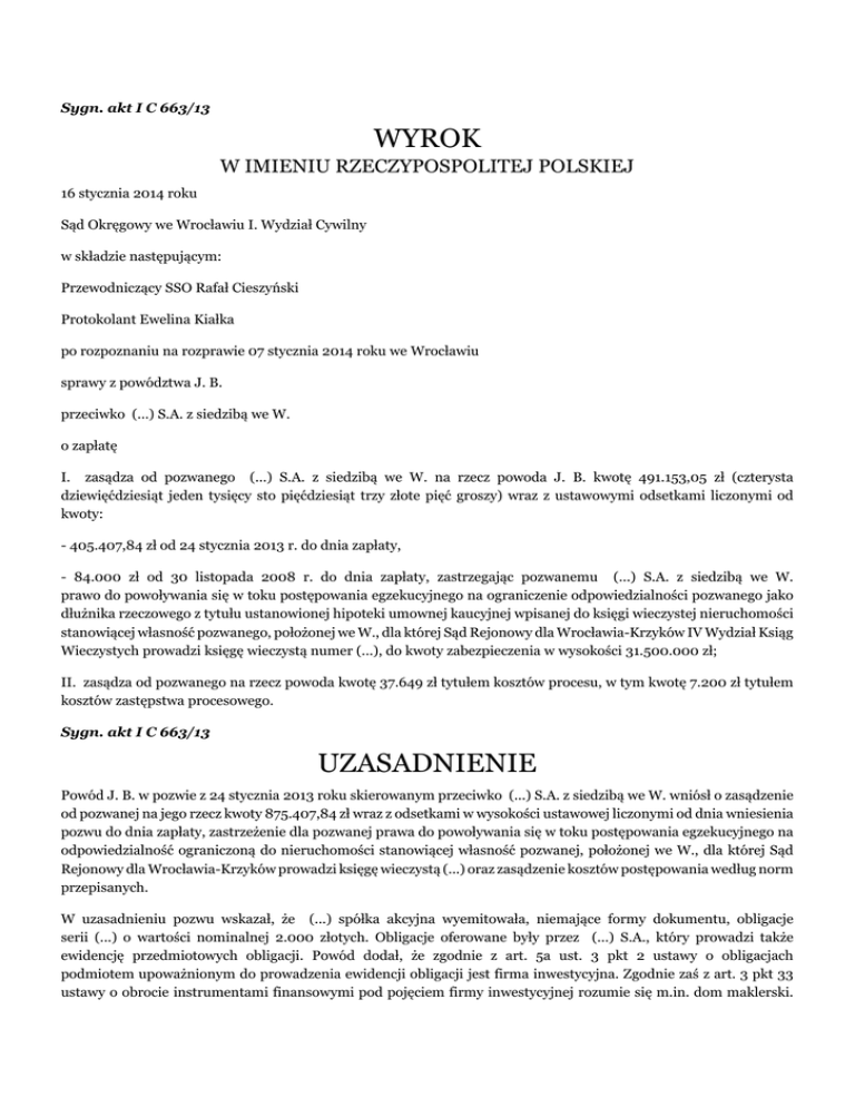 Sygn. akt I C 663/13 WYROK W IMIENIU RZECZYPOSPOLITEJ POLSKIEJ 16 stycznia 2014 roku Sąd Okręgowy we Wrocławiu I. Wydział Cywilny w składzie następującym: Przewodniczący SSO Rafał Cieszyński Protokolant Ewelina Kiałka po rozpoznaniu na rozprawie 07 stycznia 2014 roku we Wrocławiu sprawy z powództwa J. B. przeciwko (...) S.A. z siedzibą we W. o zapłatę I. zasądza od pozwanego (...) S.A. z siedzibą we W. na rzecz powoda J. B. kwotę 491.153,05 zł (czterysta dziewięćdziesiąt jeden tysięcy sto pięćdziesiąt trzy złote pięć groszy) wraz z ustawowymi odsetkami liczonymi od kwoty: - 405.407,84 zł od 24 stycznia 2013 r. do dnia zapłaty, - 84.000 zł od 30 listopada 2008 r. do dnia zapłaty, zastrzegając pozwanemu (...) S.A. z siedzibą we W. prawo do powoływania się w toku postępowania egzekucyjnego na ograniczenie odpowiedzialności pozwanego jako dłużnika rzeczowego z tytułu ustanowionej hipoteki umownej kaucyjnej wpisanej do księgi wieczystej nieruchomości stanowiącej własność pozwanego, położonej we W., dla której Sąd Rejonowy dla Wrocławia-Krzyków IV Wydział Ksiąg Wieczystych prowadzi księgę wieczystą numer (...), do kwoty zabezpieczenia w wysokości 31.500.000 zł; II. zasądza od pozwanego na rzecz powoda kwotę 37.649 zł tytułem kosztów procesu, w tym kwotę 7.200 zł tytułem kosztów zastępstwa procesowego. Sygn. akt I C 663/13 UZASADNIENIE Powód J. B. w pozwie z 24 stycznia 2013 roku skierowanym przeciwko (...) S.A. z siedzibą we W. wniósł o zasądzenie od pozwanej na jego rzecz kwoty 875.407,84 zł wraz z odsetkami w wysokości ustawowej liczonymi od dnia wniesienia pozwu do dnia zapłaty, zastrzeżenie dla pozwanej prawa do powoływania się w toku postępowania egzekucyjnego na odpowiedzialność ograniczoną do nieruchomości stanowiącej własność pozwanej, położonej we W., dla której Sąd Rejonowy dla Wrocławia-Krzyków prowadzi księgę wieczystą (...) oraz zasądzenie kosztów postępowania według norm przepisanych. W uzasadnieniu pozwu wskazał, że (...) spółka akcyjna wyemitowała, niemające formy dokumentu, obligacje serii (...) o wartości nominalnej 2.000 złotych. Obligacje oferowane były przez (...) S.A., który prowadzi także ewidencję przedmiotowych obligacji. Powód dodał, że zgodnie z art. 5a ust. 3 pkt 2 ustawy o obligacjach podmiotem upoważnionym do prowadzenia ewidencji obligacji jest firma inwestycyjna. Zgodnie zaś z art. 3 pkt 33 ustawy o obrocie instrumentami finansowymi pod pojęciem firmy inwestycyjnej rozumie się m.in. dom maklerski. Wyemitowane przez (...) S.A. obligacje serii (...) zostały zabezpieczone hipoteką ustanowioną m.in. na nieruchomości oznaczonej jako działka nr (...), objęta księgą wieczystą (...), w której to księdze w dziale II ujawnione jest aktualnie prawo własności (...) S.A. Powód podniósł, że nabył wyemitowane przez (...) S.A. obligacje serii (...) o numerach od (...) do (...), od (...) do (...) oraz od (...) do (...) i jest aktualnie ich posiadaczem. Powołując się na przepis art. 5a ustawy o obligacjach, powód podniósł, że prawa z obligacji niemających formy dokumentu powstają z chwilą dokonania zapisu w ewidencji i przysługują osobie w niej wskazanej jako posiadacz tych obligacji, przy czym umowa zobowiązująca do przeniesienia praw z obligacji niemających formy dokumentu przenosi te prawa z chwilą dokonania w ewidencji zapisu wskazującego osobę nabywcy i liczbę nabytych obligacji. Jako podstawę swoich roszczeń wskazał także przepis art. 509 § 2 k.c. Powód podał dalej, że (...) S.A. nie wypłaciła oprocentowania za ostatni kwartał (od 29 sierpnia 2008 roku do 29 listopada 2008 roku), nie wykupiła obligacji w terminie określonym w warunkach emisji, ani nie osiągnęła wyników finansowych określonych w punkcie 17 uchwały nr(...) (...) S.A. z 22 maja 2007 roku, zaś aktualnie (...) S.A. pozostaje w upadłości likwidacyjnej. Z uwagi na powyższe oraz warunki emisji określone w powołanych w pozwie dokumentach, w ocenie powoda według stanu na 31 grudnia 2012 roku przysługuje mu wobec pozwanej roszczenie o zapłatę kwoty 470.000 zł tytułem wykupu 270 obligacji po ich cenie nominalnej, o zapłatę kwoty 11.846,58 zł tytułem oprocentowania w wysokości 10% za okres od 30 sierpnia 2008 roku do 29 listopada 2008 roku, o zapłatę kwoty 94.000 zł tytułem dodatkowej premii w wysokości 20% ceny emisyjnej obligacji, o zapłatę kwoty 249.634,38 zł tytułem odsetek w wysokości ustawowej za opóźnienie w wykupie obligacji obliczonych od 30 listopada 2008 roku do 31 grudnia 2012 roku oraz o zapłatę kwoty 49.926,88 zł tytułem odsetek w wysokości ustawowej za opóźnienie w zapłacie dodatkowej premii obliczonych od 30 listopada 2008 roku do 31 grudnia 2012 roku, tj. łącznie o zapłatę kwoty 875.407,84 zł. Powód wyjaśnił, że roszczenie o zapłatę wskazanej wyżej premii było wymagalne w dniu wykupu obligacji tj. 29 listopada 2008 roku i dotyczyło spełnienia świadczenia pieniężnego, stąd żądanie zapłaty odsetek w wysokości ustawowej za opóźnienie w zapłacie tejże premii oraz w wykupie obligacji jest uzasadnione dyspozycją art. 481 § 1 k.c. Żądanie zapłaty odsetek od wskazanych skapitalizowanych odsetek za opóźnienie uzasadnione jest natomiast art. 482 § 1 k.c. roszczenia dochodzone pozwem są wymagalne i nie uległy przedawnieniu, którego termin w ustawie o obligacjach został określony na 10 lat. Odnośnie żądania dotyczącego przyznania pozwanej prawa do powoływania się w toku postępowania egzekucyjnego na ograniczenie jej odpowiedzialności zgodnie z przepisem art. 319 k.p.c. powód podniósł, że pozwana jest właścicielem nieruchomości, na której ustanowiono hipotekę zabezpieczającą obligacje, a więc odpowiada za zobowiązania wynikające z obligacji jako dłużnik rzeczowy. Nakazem zapłaty w postępowaniu upominawczym z 02 kwietnia 2013 roku w sprawi