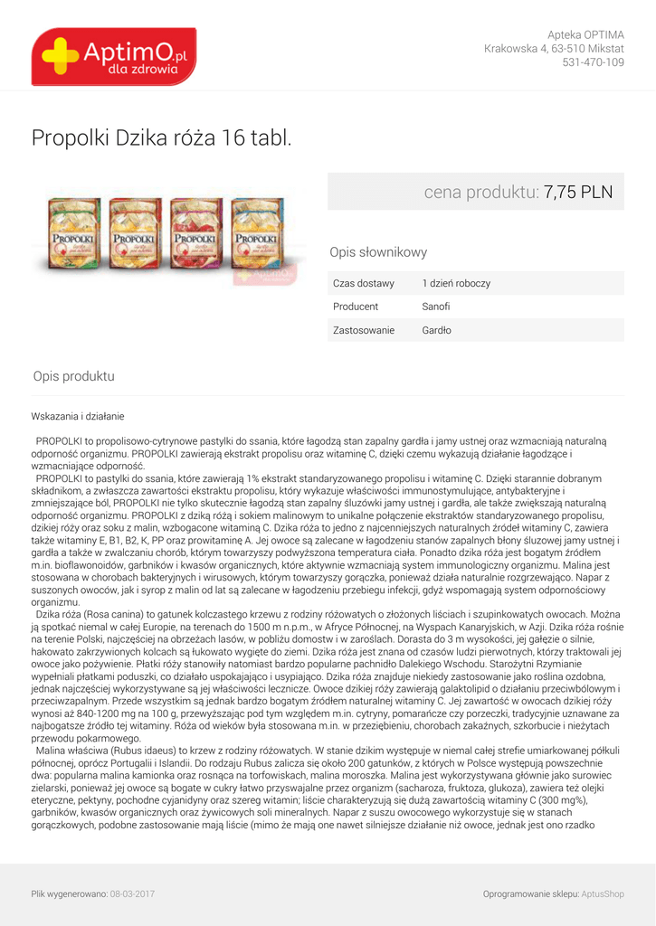 Apteka OPTIMA Krakowska 4, 63-510 Mikstat 531-470-109 Propolki Dzika róża 16 tabl. cena produktu: 7,75 PLN Opis słownikowy Czas dostawy 1 dzień roboczy Producent Sanofi Zastosowanie Gardło Opis produktu Wskazania i działanie PROPOLKI to propolisowo-cytrynowe pastylki do ssania, które łagodzą stan zapalny gardła i jamy ustnej oraz wzmacniają naturalną odporność organizmu. PROPOLKI zawierają ekstrakt propolisu oraz witaminę C, dzięki czemu wykazują działanie łagodzące i wzmacniające odporność. PROPOLKI to pastylki do ssania, które zawierają 1% ekstrakt standaryzowanego propolisu i witaminę C. Dzięki starannie dobranym składnikom, a zwłaszcza zawartości ekstraktu propolisu, który wykazuje właściwości immunostymulujące, antybakteryjne i zmniejszające ból, PROPOLKI nie tylko skutecznie łagodzą stan zapalny śluzówki jamy ustnej i gardła, ale także zwiększają naturalną odporność organizmu. PROPOLKI z dziką różą i sokiem malinowym to unikalne połączenie ekstraktów standaryzowanego propolisu, dzikiej róży oraz soku z malin, wzbogacone witaminą C. Dzika róża to jedno z najcenniejszych naturalnych źródeł witaminy C, zawiera także witaminy E, B1, B2, K, PP oraz prowitaminę A. Jej owoce są zalecane w łagodzeniu stanów zapalnych błony śluzowej jamy ustnej i gardła a także w zwalczaniu chorób, którym towarzyszy podwyższona temperatura ciała. Ponadto dzika róża jest bogatym źródłem m.in. bioflawonoidów, garbników i kwasów organicznych, które aktywnie wzmacniają system immunologiczny organizmu. Malina jest stosowana w chorobach bakteryjnych i wirusowych, którym towarzyszy gorączka, ponieważ działa naturalnie rozgrzewająco. Napar z suszonych owoców, jak i syrop z malin od lat są zalecane w łagodzeniu przebiegu infekcji, gdyż wspomagają system odpornościowy organizmu. Dzika róża (Rosa canina) to gatunek kolczastego krzewu z rodziny różowatych o złożonych liściach i szupinkowatych owocach. Można ją spotkać niemal w całej Europie, na terenach do 1500 m n.p.m., w Afryce Północnej, na Wyspach Kanaryjskich, w Azji. Dzika róża rośnie na terenie Polski, najczęściej na obrzeżach lasów, w pobliżu domostw i w zaroślach. Dorasta do 3 m wysokości, jej gałęzie o silnie, hakowato zakrzywionych kolcach są łukowato wygięte do ziemi. Dzika róża jest znana od czasów ludzi pierwotnych, którzy traktowali jej owoce jako pożywienie. Płatki róży stanowiły natomiast bardzo popularne pachnidło Dalekiego Wschodu. Starożytni Rzymianie wypełniali płatkami poduszki, co działało uspokajająco i usypiająco. Dzika róża znajduje niekiedy zastosowanie jako roślina ozdobna, jednak najczęściej wykorzystywane są jej właściwości lecznicze. Owoce dzikiej róży zawierają galaktolipid o działaniu przeciwbólowym i przeciwzapalnym. Przede wszystkim są jednak bardzo bogatym źródłem naturalnej witaminy C. Jej zawartość w owocach dzikiej róży wynosi aż 840-1200 mg na 100 g, przewyższając pod tym względem m.in. cytryny, pomarańcze czy porzeczki, tradycyjnie uznawane za najbogatsze źródło tej witaminy. Róża od wieków była stosowana m.in. w przeziębieniu, chorobach zakaźnych, szkorbucie i nieżytach przewodu pokarmowego. Malina właściwa (Rubus idaeus) to krzew z rodziny różowatych. W stanie dzikim występuje w niemal całej strefie umiarkowanej półkuli północnej, oprócz Portugalii i Islandii. Do rodzaju Rubus zalicza się około 200 gatunków, z których w Polsce występują powszechnie dwa: popularna malina kamionka oraz rosnąca na torfowiskach, malina moroszka. Malina jest wykorzystywana głównie jako surowiec zielarski, ponieważ jej owoce są bogate w cukry łatwo przyswajalne przez organizm (sacharoza, fruktoza, glukoza), zawiera też olejki eteryczne, pektyny, pochodne cyjanidyny oraz szereg witamin; liście charakteryzują się dużą zawartością witaminy C (300 mg%), garbników, kwasów organicznych oraz żywicowych soli mineralnych. Napar z suszu owocowego wykorzystuje się w stanach gorączkowych, podobne zastosowanie mają liście (mimo że mają one nawet silniejsze działanie niż owoce, jednak jest ono rzadko Plik wygenerowano: 08-03-2017 Oprogramowanie sklepu: AptusShop Apteka OPTIMA Krakowska 4, 63-510 Mikstat 531-470-109 wykorzystywane). Malina jest uprawiana od średniowiecza ze względu na smaczne owoce, z których robi się m.in. soki, dżemy, konfitury. Napar z suszonych owoców lub syrop ze świeżych (syrop malinowy podaje się zwłaszcza dzieciom) pobudzają czynność gruczołów potowych i w stanach gorączkowych wywołują po pół godzinie (do godziny) obfite wydzielanie potu. Napary z malin działają ściągająco i wzmacniająco ogólnie, a jako dodatek do mieszanek herbacianych znakomicie je aromatyzują. Susz z liści malin stosuje się w postaci naparu przeciw biegunkom, przy zaburzeniach menstruacyjnych, przy wysypkach i egzemach oraz jako płukanka przy stanach zapalnych jamy ustnej i gardła. PROPOLKI z dziką różą i sokiem malinowym – pastylki, które łagodzą podrażnienia w obrębie jamy ustnej i gardła, zawierają ekstrakt standaryzowanego propolisu i witaminę C oraz naturalne wyciągi z dzikiej róży i malin. Plik wygenerowano: 08-03-2017 Powered by TCPDF (www.tcpdf.org) Oprogramowanie sklepu: AptusShop