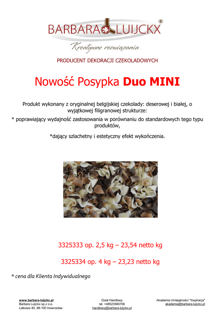 PRODUCENT DEKORACJI CZEKOLADOWYCH Nowość Posypka Duo MINI Produkt wykonany z oryginalnej belgijskiej czekolady: deserowej i białej, o wyjątkowej filigranowej strukturze: * poprawiający wydajność zastosowania w porównaniu do standardowych tego typu produktów, *dający szlachetny i estetyczny efekt wykończenia. 3325333 op. 2,5 kg – 23,54 netto kg 3325334 op. 4 kg – 23,23 netto kg * cena dla Klienta Indywidualnego www.barbara-luijckx.pl Barbara Luijckx sp.z o.o. Latkowo 40, 88-100 Inowrocław Dział Handlowy tel. +48523580706 [email protected] Akademia Umiejętności "Inspiracja" [email protected]
