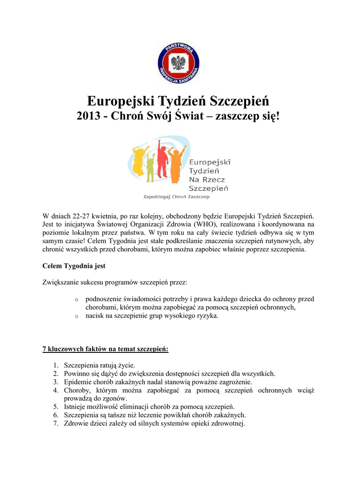 Europejski Tydzień Szczepień 2013 - Chroń Swój Świat – zaszczep się! W dniach 22-27 kwietnia, po raz kolejny, obchodzony będzie Europejski Tydzień Szczepień. Jest to inicjatywa Światowej Organizacji Zdrowia (WHO), realizowana i koordynowana na poziomie lokalnym przez państwa. W tym roku na cały świecie tydzień odbywa się w tym samym czasie! Celem Tygodnia jest stałe podkreślanie znaczenia szczepień rutynowych, aby chronić wszystkich przed chorobami, którym można zapobiec właśnie poprzez szczepienia. Celem Tygodnia jest Zwiększanie sukcesu programów szczepień przez: o o podnoszenie świadomości potrzeby i prawa każdego dziecka do ochrony przed chorobami, którym można zapobiegać za pomocą szczepień ochronnych, nacisk na szczepienie grup wysokiego ryzyka. 7 kluczowych faktów na temat szczepień: Szczepienia ratują życie. Powinno się dążyć do zwiększenia dostępności szczepień dla wszystkich. Epidemie chorób zakaźnych nadal stanowią poważne zagrożenie. Choroby, którym można zapobiegać za pomocą szczepień ochronnych wciąż prowadzą do zgonów. 5. Istnieje możliwość eliminacji chorób za pomocą szczepień. 6. Szczepienia są tańsze niż leczenie powikłań chorób zakaźnych. 7. Zdrowie dzieci zależy od silnych systemów opieki zdrowotnej. 1. 2. 3. 4. Główne Fakty dla Europy: 1. Epidemie odry występują w Europie a. Region Europejski zanotował ponad 90 000 przypadków odry w ostatnich trzech latach. b. Tylko w samym 2012 roku zanotowano ponad 20 000 przypadków różyczki. c. 80% przypadków odry zarejestrowano w krajach Unii Europejskiej. d. Ponad 50% chorych to młodzież i młodzi dorośli. e. Jedynym sposobem zatrzymania tych epidemii i zapobieżenia im w przyszłości to zapewnienie, że osoby będą się szczepić zgodnie z zaleceniami. Dotyczy to także szczepień przeciwko odrze. f. Nadal należy edukować wszystkich o tym, że należy szczepić się przeciwko odrze. g. Możemy osiągną cel eliminacji odry i różyczki w Europie poprzez zwiększanie powszechnej uwagi na ten problem, zapewnienia finansowania i silnego zaangażowania politycznego. 2. Dajmy dojść do głosu osobom, które zachorowały na choroby, którym można było zapobiec za pomocą szczepień. Choroby zakaźne, którym można zapobiec dzięki szczepieniom są chorobami groźnym, mogącymi prowadzić do hospitalizacji, długotrwałej, nawet na całe życie niepełnosprawności, a nawet do śmierci. Wszystkie państwa powinny rozważać pokazywanie prawdziwych historii o zagrożeniach ze strony tych chorób przede wszystkim odrze, różyczce i polio. Szczegółowych informacji dotyczących szczepień ochronnych udzielają lekarze podstawowej opieki zdrowotnej. Ponadto w dniu 26.04.2013 r. w ramach Europejskiego Tygodnia Szczepień w Powiatowej Stacji Sanitarno-Epidemiologicznej w Kluczborku w godzinach 1000-1200 pracownicy będą udzielali zainteresowanym informacji na temat szczepień ochronnych. Powyższe informacje będzie także można uzyskać pod nr telefonu 77-4472001. Ponadto informacje dotyczące szczepień można znaleźć na stronie: szczepienia.pzh.gov.pl