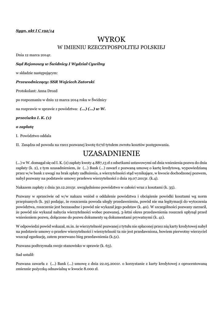 Sygn. akt I C 192/14 WYROK W IMIENIU RZECZYPOSPOLITEJ POLSKIEJ Dnia 12 marca 2014r. Sąd Rejonowy w Świdnicy I Wydział Cywilny w składzie następującym: Przewodniczący: SSR Wojciech Zatorski Protokolant: Anna Drozd po rozpoznaniu w dniu 12 marca 2014 roku w Świdnicy na rozprawie w sprawie z powództwa: (...) (...) w W. przeciwko I. K. (1) o zapłatę I. Powództwo oddala II. Zasądza od powoda na rzecz pozwanej kwotę 617zł tytułem zwrotu kosztów postępowania. UZASADNIENIE (...) w W. domagał się od I. K. (2) zapłaty kwoty 4.887,13 zł z odsetkami ustawowymi od dnia wniesienia pozwu do dnia zapłaty (k. 2), z tym uzasadnieniem, że (...) Bank (...) zawarł z pozwaną umowę o kartę kredytową, wypowiedzianą przez w/w bank z uwagi na brak spłaty zadłużenia, a wierzytelności stąd wynikające, w kwocie dochodzonej pozwem, nabył pozwany na podstawie umowy przelewu wierzytelności z dnia 19.07.2013r. (k.4). Nakazem zapłaty z dnia 30.12.2013r. uwzględniono powództwo w całości wraz z kosztami (k. 35). Pozwany w sprzeciwie od w/w nakazu wniósł o oddalenie powództwa i obciążenie powódki kosztami wg norm przepisanych (k. 39) podając, że roszczenia powoda uległy przedawnieniu, powód nie ma legitymacji do wytoczenia powództwa, roszczenie jest bezzasadne i powód nie wykazał jego podstaw (k. 40). W szczególności pozwany zarzucił, że powód nie wykazał nabycia wierzytelności wobec pozwanej, 3-letni okres przedawnienia roszczeń upłynął przed wniesieniem pozwu, dołączone do pozwu dokumenty są dokumentami prywatnymi (k. 41). W odpowiedzi powód wskazał, m.in. że wierzytelność pozwanej z tytułu nie spłaconej przez nią karty kredytowej nabył na podstawie umowy o przelew wierzytelności i wierzytelność ta nie jest przedawniona, bowiem pierwotny wierzyciel wszczął egzekucję, zatem przerwano bieg przedawnienia (k.51). Pozwana podtrzymała swoje stanowisko w sprawie (k. 63). Sad ustalił: Pozwana zawarła z (...) Bank (...) umowę z dnia 22.05.2001r. o korzystanie z karty kredytowej z oprocentowaną zmiennie pożyczką odnawialną w kwocie 8.000 zł. Dnia 03.07.2002r. wobec zadłużenia wynikającego z w/w umowy bank wystawił bankowy tytuł egzekucyjne na kwotę 9.566,61 zł. W tej samej dacie bank sporządził wniosek o nadanie w/w tytułowi klauzuli wykonalności a w dniu 20.09.2002r. SR w Świdnicy wniosek uwzględnił. W dniu 25.11.2002r. bank sporządził wniosek o wszczęcie egzekucji, zaś komornik sądowy postanowieniem z dnia 16.12.2010r. umorzył postepowanie egzekucyjne z powodu bezskuteczności. Umową z dnia 19.07.2013r. bank przeniósł na rzecz powoda wszystkie wierzytelności wchodzące w skład (...) i wymienione w załączniku nr 1 do umowy. W załączniku tym figuruje pozwana I. K.. Dnia 19.07.2013r. bank zawiadomił pozwaną o przelewie swych wierzytelności na rzecz powoda, zaś dnia 16.08.2013r. ten wezwał pozwaną do zapłaty zadłużenia wynikającego z tej umowy w kwocie 4.887,13 zł. Dowód: - umowa o korzystanie z karty – k. 27-28, - bankowy tytuł egzekucyjny – k. 30, - wniosek i postanowienie – k. 54-55, - wniosek i postanowienie – k. 56-57, - wezwanie do zapłaty – k. 25, - zawiadomienie – k. 24, - umowa przelewu – k. 13-15, - załącznik do umowy przelewu – k.17. Sąd zważył : Powództwo nie zasługuje na uwzględnienie. Zgodnie z art. 6 Kc kto z faktu wywodzi skutki prawne ponosi ciężar udowodnienia tego faktu. Powoda obciąża zatem obowiązek wykazania istnienia i wysokości długu pozwanej wobec pierwotnego wierzyciela pozwanej, w tym też co do żądanych odsetek, jak też skuteczne jego zbycia na swoją rzecz. Analiza akt sprawy wskazuje natomiast, że brak jednoznacznych dowodów potwierdzających w.w okoliczności. W pierwszym rzędzie należy jednak zakwestionować skuteczność zarzutu przedawnienia, zgłoszonego przez pozwaną. Jeżeli bowiem wobec pozwanej skierowano egzekucję w 2002r. a postepowanie egzekucyjne umorzono w XII 2010r. to wobec daty wniesienia pozwu (XI 2013r.) zarzut ten, w świetle przepisów art. 118 i art. 123 Kc, jest chybiony Oceniając natomiast meritum żądań pozwu zauważyć należy, iż powódka nie przedstawiła dowodu wypowiedzenia pozwanej przez bank umowy kredytowej; w sprawie brak dowodu wprost stwierdzającego tę czynność, jak też nie wynika ona z pozostałych dowodów złożonych przez powódkę, np. bankowego tytułu egzekucyjnego, zawiadomienia o przelewie lub wezwania do zapłaty. W efekcie nie wiadomo zatem, w jakiej dacie nastąpiła wymagalność całości zadłużenia (k. 28 - § 5), a więc jak naliczać odsetki. Brak też dowodu wysokości dochodzonej kwoty. Jedynie z wezwania do zapłaty (k. 25) wynika, że chodzi o kwotę żądaną pozwem, a także, jaka jest struktura długu. Wobec zakwestionowania przez pozwaną swej odpowiedzialności w ogólności, jak i co do wysokości długu, zauważyć należy, iż poza w/w dokumentem, żaden dowód nie wskazuje na odpowiedzialność pozwanej w takiej właśnie wysokości. Umowa kredytowa i ogólne warunki udzielania kredytu (k. 27-28) z natury rzeczy stanowią tylko dowód podstaw odpowiedzialności pozwanej. Kwota dochodzona pozwem nie wynika z zawiadomienia o przelewie (k. 24), tytułu wykonawczego (k. 52), czy dokumentów egzekucyjnych (k. 56-57). Ponadto wykaz wierzytelności (załącznik do umowy przelewu wierzytelności – k. 17) również wskazuje, pomijając już nawet formę przedstawienia w procesie tak istotnego dokumentu, kwoty nie odpowiadające dochodzonej obecnie pozwem, co wobec niewiedzy w zakresie pozostałych okoliczności spornych, uniemożliwia weryfikację kwestii zarzucanych przez pozwaną , w tym prawidłowości obliczania pozostałości należności głównej i odsetek. Ponadto arkusz wykazu odnoszący się do pozwanej nie zawiera - w odróżnieniu od innych arkuszy (np. k. 16) -poświadczenia notarialnego, zatem stanowi, przynajmniej w tym zakresie, poświadczony prz