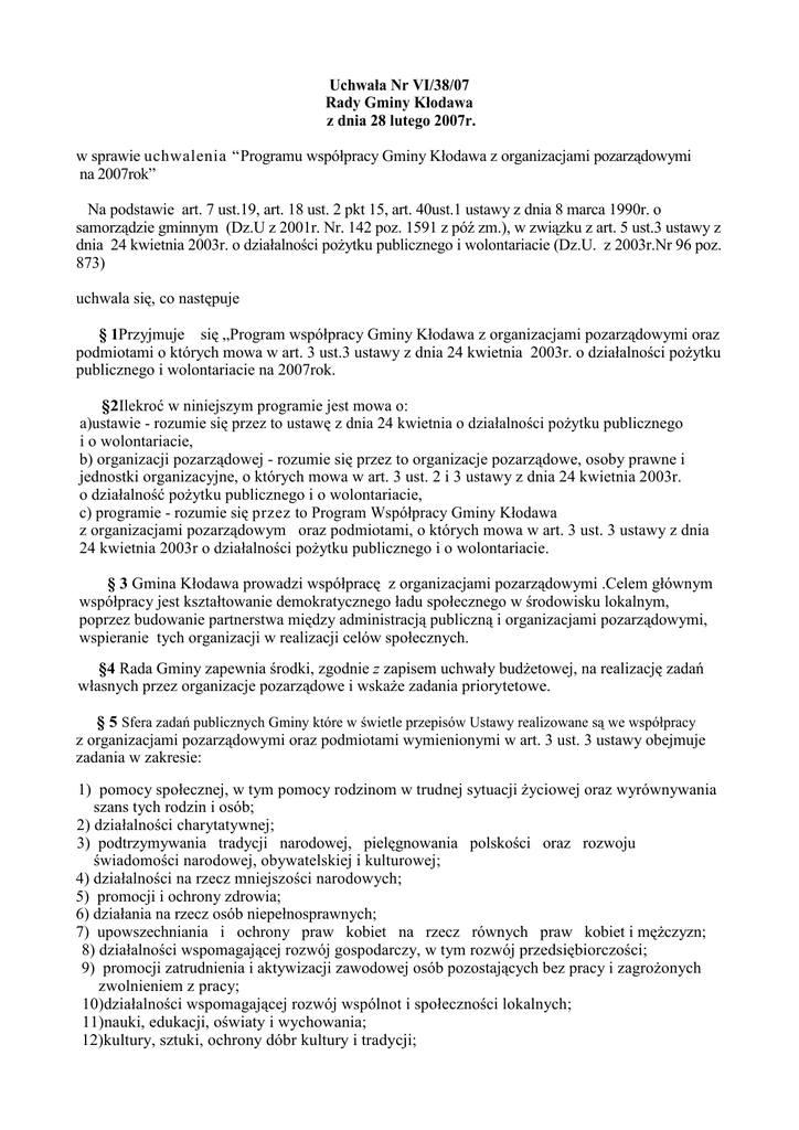 Uchwała Nr VI/38/07 Rady Gminy Kłodawa z dnia 28 lutego 2007r. w sprawie uchwalenia “Programu współpracy Gminy Kłodawa z organizacjami pozarządowymi na 2007rok” Na podstawie art. 7 ust.19, art. 18 ust. 2 pkt 15, art. 40ust.1 ustawy z dnia 8 marca 1990r. o samorządzie gminnym (Dz.U z 2001r. Nr. 142 poz. 1591 z póź zm.), w związku z art. 5 ust.3 ustawy z dnia 24 kwietnia 2003r. o działalności poŜytku publicznego i wolontariacie (Dz.U. z 2003r.Nr 96 poz. 873) uchwala się, co następuje § 1Przyjmuje się „Program współpracy Gminy Kłodawa z organizacjami pozarządowymi oraz podmiotami o których mowa w art. 3 ust.3 ustawy z dnia 24 kwietnia 2003r. o działalności poŜytku publicznego i wolontariacie na 2007rok. §2Ilekroć w niniejszym programie jest mowa o: a)ustawie - rozumie się przez to ustawę z dnia 24 kwietnia o działalności poŜytku publicznego i o wolontariacie, b) organizacji pozarządowej - rozumie się przez to organizacje pozarządowe, osoby prawne i jednostki organizacyjne, o których mowa w art. 3 ust. 2 i 3 ustawy z dnia 24 kwietnia 2003r. o działalność poŜytku publicznego i o wolontariacie, c) programie - rozumie się przez to Program Współpracy Gminy Kłodawa z organizacjami pozarządowym oraz podmiotami, o których mowa w art. 3 ust. 3 ustawy z dnia 24 kwietnia 2003r o działalności poŜytku publicznego i o wolontariacie. § 3 Gmina Kłodawa prowadzi współpracę z organizacjami pozarządowymi .Celem głównym współpracy jest kształtowanie demokratycznego ładu społecznego w środowisku lokalnym, poprzez budowanie partnerstwa między administracją publiczną i organizacjami pozarządowymi, wspieranie tych organizacji w realizacji celów społecznych. §4 Rada Gminy zapewnia środki, zgodnie z zapisem uchwały budŜetowej, na realizację zadań własnych przez organizacje pozarządowe i wskaŜe zadania priorytetowe. § 5 Sfera zadań publicznych Gminy które w świetle przepisów Ustawy realizowane są we współpracy z organizacjami pozarządowymi oraz podmiotami wymienionymi w art. 3 ust. 3 ustawy obejmuje zadania w zakresie: 1) pomocy społecznej, w tym pomocy rodzinom w trudnej sytuacji Ŝyciowej oraz wyrównywania szans tych rodzin i osób; 2) działalności charytatywnej; 3) podtrzymywania tradycji narodowej, pielęgnowania polskości oraz rozwoju świadomości narodowej, obywatelskiej i kulturowej; 4) działalności na rzecz mniejszości narodowych; 5) promocji i ochrony zdrowia; 6) działania na rzecz osób niepełnosprawnych; 7) upowszechniania i ochrony praw kobiet na rzecz równych praw kobiet i męŜczyzn; 8) działalności wspomagającej rozwój gospodarczy, w tym rozwój przedsiębiorczości; 9) promocji zatrudnienia i aktywizacji zawodowej osób pozostających bez pracy i zagroŜonych zwolnieniem z pracy; 10)działalności wspomagającej rozwój wspólnot i społeczności lokalnych; 11)nauki, edukacji, oświaty i wychowania; 12)kultury, sztuki, ochrony dóbr kultury i tradycji; 13)krajoznawstwa oraz wypoczynku dzieci i młodzieŜy; 14)upowszechniania kultury fizycznej i sportu; 15)ekologii i ochrony zwierząt oraz ochrony dziedzictwa przyrodniczego; 16)porządku i bezpieczeństwa publicznego oraz przeciwdziałania patologiom społecznym; 17)upowszechniania wiedzy i umiejętności na rzecz obronności państwa; 18) upowszechniania i ochrony wolności i praw człowieka oraz swobód obywatelskich, a takŜe działań wspomagających rozwój demokracji; 19)ratownictwa i ochrony ludności; 20)pomocy ofiarom katastrof, klęsk Ŝywiołowych, konfliktów zbrojnych i wojen w kraju i zagranicą; 21)upowszechniania i ochrony praw konsumentów; 22)działań na rzecz integracji europejskiej oraz rozwijania kontaktów i współpracy między społeczeństwami; 23)promocji i organizacji wolontariatu; 24)działalności wspomagającej technicznie, szkoleniowo, informacyjnie lub finansowo organizacje pozarządowe oraz podmioty, o których mowa w art. 3 ust. 3 ustawy o działalności poŜytku publicznego i o wolontariacie. §6 Współpraca ta moŜe odbywać się w szczególności w formach: 1) zlecania organizacjom pozarządowym oraz podmiotom wymienionym w art. 3 ust. 3 ustawy, zadań publicznych, poprzez wspieranie takich zadań szczegółowo opisanych w § 4 wraz z udzielaniem dotacji na dofinansowanie ich realizacji, 2) wzajemnego informowania się o planowanych kierunkach działalności i współdziałania w celu zharmonizowania tych kierunków 3) konsultowania z organizacjami pozarządowymi oraz podmiotami wymienionymi w art. 3 ust. 3 ustawy, odpowiednio do zakresu ich działania, projektów aktów normatywnych w dziedzinach dotyczących działalności statutowej tych organizacji, 4) tworzenia wspólnych zespołów o charakterze doradczym i inicjatywnym, złoŜonych z przedstawicieli organizacji pozarządowych, innych podmiotów oraz przedstawicieli właściwych organów administracji publicznej. Współpraca odbywać się będzie na zasadach: pomocniczości, suwerenności stron, partnerstwa, efektywności, uczciwej konkurencji i jawności. § 7 Współpraca ta moŜe odbywać się w szczególności w zakresie: a)upowszechniania kultury fizycznej i sportu, b) kultury, c)wzajemnego informowania się o planowanych kierunkach działalności i współdziałania w celu zharmonizowania tych kierunków poprzez: - udział przedstawicieli organizacji pozarządowych na sesjach Rady Gminy, - przekazywanie przez organizacje pozarządowe informacji o przewidywanych lub realizowanych zadaniach sfery publicznej; d)konsultowania projektów aktów normatywnych w dziedzinach dotyczących działalności statutowej organizacji a takŜe informowania przedstawicieli organizacji o planowanych sesjach Rady Gminy, na których będą dyskutowane projekty uchwał odnoszących się do zagadnień związanych z profilem działalności tych organizacji, e) tworzenia w razie potrzeb wspólnych zespołów o charakterze doradczym i inicjatywnym; f)umieszczania na stron