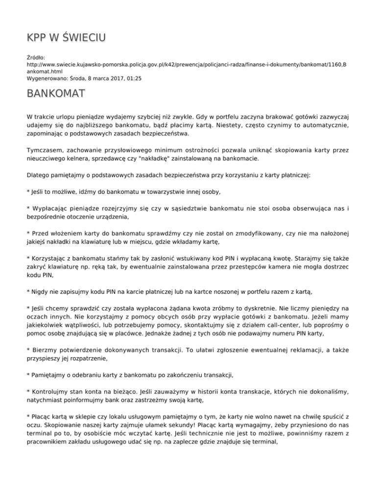 KPP W ŚWIECIU Źródło: http://www.swiecie.kujawsko-pomorska.policja.gov.pl/k42/prewencja/policjanci-radza/finanse-i-dokumenty/bankomat/1160,B ankomat.html Wygenerowano: Środa, 8 marca 2017, 01:25 BANKOMAT W trakcie urlopu pieniądze wydajemy szybciej niż zwykle. Gdy w portfelu zaczyna brakować gotówki zazwyczaj udajemy się do najbliższego bankomatu, bądź płacimy kartą. Niestety, często czynimy to automatycznie, zapominając o podstawowych zasadach bezpieczeństwa. Tymczasem, zachowanie przysłowiowego minimum ostrożności pozwala uniknąć skopiowania karty przez nieuczciwego kelnera, sprzedawcę czy "nakładkę" zainstalowaną na bankomacie. Dlatego pamiętajmy o podstawowych zasadach bezpieczeństwa przy korzystaniu z karty płatniczej: * Jeśli to możliwe, idźmy do bankomatu w towarzystwie innej osoby, * Wypłacając pieniądze rozejrzyjmy się czy w sąsiedztwie bankomatu nie stoi osoba obserwująca nas i bezpośrednie otoczenie urządzenia, * Przed włożeniem karty do bankomatu sprawdźmy czy nie został on zmodyfikowany, czy nie ma nałożonej jakiejś nakładki na klawiaturę lub w miejscu, gdzie wkładamy kartę, * Korzystając z bankomatu stańmy tak by zasłonić wstukiwany kod PIN i wypłacaną kwotę. Starajmy się także zakryć klawiaturę np. ręką tak, by ewentualnie zainstalowana przez przestępców kamera nie mogła dostrzec kodu PIN, * Nigdy nie zapisujmy kodu PIN na karcie płatniczej lub na kartce noszonej w portfelu razem z kartą, * Jeśli chcemy sprawdzić czy została wypłacona żądana kwota zróbmy to dyskretnie. Nie liczmy pieniędzy na oczach innych. Nie korzystajmy z pomocy obcych osób przy wypłacie gotówki z bankomatu. Jeżeli mamy jakiekolwiek wątpliwości, lub potrzebujemy pomocy, skontaktujmy się z działem call-center, lub poprośmy o pomoc osobę znajdującą się w placówce. Jednakże żadnej z tych osób nie podawajmy numeru PIN karty, * Bierzmy potwierdzenie dokonywanych transakcji. To ułatwi zgłoszenie ewentualnej reklamacji, a także przyspieszy jej rozpatrzenie, * Pamiętajmy o odebraniu karty z bankomatu po zakończeniu transakcji, * Kontrolujmy stan konta na bieżąco. Jeśli zauważymy w historii konta transkacje, których nie dokonaliśmy, natychmiast poinformujmy bank oraz zastrzeżmy swoją kartę, * Płacąc kartą w sklepie czy lokalu usługowym pamiętajmy o tym, że karty nie wolno nawet na chwilę spuścić z oczu. Skopiowanie naszej karty zajmuje ułamek sekundy! Płacąc kartą wymagajmy, żeby przyniesiono do nas terminal po to, by osobiście móc wczytać kartę. Jeśli technicznie nie jest to możliwe, powinniśmy razem z pracownikiem zakładu usługowego udać się np. na zaplecze gdzie znajduje się terminal, * Jeśli terminal, zachowanie kelnera, sprzedawcy lub bankomat budzą nasz niepokój, natychmiast powiadommy o tym Policję. źródło: www.policja.pl Autor: Publikacja: Ocena: 0/5 (0) Tweetnij