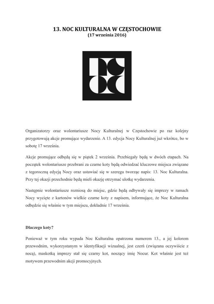 13. NOC KULTURALNA W CZĘSTOCHOWIE (17 września 2016) Organizatorzy oraz wolontariusze Nocy Kulturalnej w Częstochowie po raz kolejny przygotowują akcje promujące wydarzenie. A 13. edycja Nocy Kulturalnej już wkrótce, bo w sobotę 17 września. Akcje promujące odbędą się w piątek 2 września. Przebiegały będą w dwóch etapach. Na początek wolontariusze przebrani za czarne koty będą odwiedzać kluczowe miejsca związane z tegoroczną edycją Nocy oraz ustawiać się w szeregu tworząc napis: 13. Noc Kulturalna. Przy tej okazji przechodnie będą mieli okazję otrzymać ulotkę wydarzenia. Następnie wolontariusze rozniosą do miejsc, gdzie będą odbywały się imprezy w ramach Nocy wycięte z kartonów wielkie czarne koty z napisem, informujące, że Noc Kulturalna odbędzie się właśnie w tym miejscu, dokładnie 17 września. Dlaczego koty? Ponieważ w tym roku wypada Noc Kulturalna opatrzona numerem 13., a jej kolorem przewodnim, wykorzystanym w identyfikacji wizualnej, jest czerń (związana oczywiście z nocą), maskotką imprezy stał się czarny kot, noszący imię Nocur. Kot właśnie jest też motywem przewodnim akcji promocyjnych. Chcemy tym samym podkreślić wyjątkowość Nocy, jej charakter w rozumieniu kulturowym, odwołując się między innymi do przesądów, funkcjonujących w społeczeństwie skojarzeń i wyobrażeń. Połączenie czerni, kota i trzynastki ma z jednej strony przyciągnąć uwagę uczestników imprezy, wytworzyć aurę tajemniczości, a z drugiej pokazać, że niekoniecznie kryją się za tym negatywne (pechowe) wartości. Dla organizatorów i wolontariuszy jest to szczęśliwe połączenie, mające przyczynić się do jak największego wypromowania wydarzenia jakim jest Noc Kulturalna. Chcemy, aby jej uczestnicy i sympatycy również oswoili przesądy i wzięli razem z nami udział w zabawie. Akcja promocyjna od 5 do 17 września Akcja będzie polegała na umiejscowieniu w 13 miejscach (w których odbędą się imprezy w ramach 13. Nocy Kulturalnej) ponumerowanych kotów (małych czarnych skrzynek w kształcie kota). Chętni będą mieli okazję wrzucić tam karteczkę ze swoim imieniem, nazwiskiem i e-mailem. Stos małych karteczek z formularzem do wypełnienia umieszczony zostanie na ladzie w miejscach widocznym dla zainteresowanych. Z każdej skrzynki zostanie wylosowana jedna osoba, która otrzyma karnet na tegoroczną edycję Nocy Kulturalnej. Akcja będzie trwała oczywiście przez 13 dni. Miejsce: zainteresowani muszą sami wyszukać miejsce. Czas: od 5 do 17 września. Prosimy o pomoc w promocji akcji i zamieszczenie informacji w Państwa mediach. Co do samej Nocy Kulturalnej, prosimy kontaktować się z Ośrodkiem Promocji Kultury „Gaude Mater”: [email protected] lub telefonicznie pod numerami: 34 324-36-38 / 34 365-17-60, czy też [email protected]. bezpośrednio z koordynatorką projektu, Katarzyną Strojec: