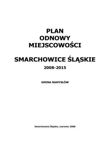 PLAN ODNOWY MIEJSCOWOŚCI SMARCHOWICE ŚLĄSKIE 2008-2015 GMINA NAMYSŁÓW Smarchowice Śląskie, czerwiec 2008 Plan Odnowy Miejscowości Smarchowice Śląskie Wstęp Rozwój i odnowa obszarów wiejskich to jedno z kluczowych wyzwań, jakie stoją przed Polską w okresie integracji z Unią Europejską. Zasadniczym jej celem jest wzmocnienie działań słuŜących zmniejszaniu istniejących dysproporcji i róŜnic w poziomie rozwoju obszarów wiejskich w stosunku do terenów miejskich. Plan Odnowy Miejscowości jest jednym z najwaŜniejszych elementów odnowy wsi, jej rozwoju oraz poprawy warunków pracy i Ŝycia mieszkańców. Celem działania jest poprawa jakości Ŝycia na obszarach wiejskich poprzez zaspokojenie potrzeb społecznych i kulturalnych mieszkańców wsi oraz promowanie obszarów wiejskich. Działanie umoŜliwi rozwój toŜsamości społeczności wiejskiej, zachowanie dziedzictwa kulturowego i specyfiki obszarów wiejskich oraz wpłynie na wzrost ich atrakcyjności turystycznej i inwestycyjnej. Obszarem realizacji Planu Odnowy Miejscowości Smarchowice Śląskie jest obszar tej miejscowości. Niniejsze opracowanie zawiera charakterystykę miejscowości, inwentaryzację zasobów słuŜącą ujęciu stanu rzeczywistego, analizę SWOT czyli mocne i słabe strony miejscowości. Plan Odnowy Miejscowości Smarchowice Śląskie to dokument, który określa strategię działań w sferze społeczno-gospodarczej na najbliŜsze lata. Niniejszy plan jest planem otwartym stwarzającym moŜliwość aktualizacji w zaleŜności od potrzeb społecznych i uwarunkowań finansowych. Oznacza to, Ŝe mogą być dopisywane nowe zadania, a takŜe to, Ŝe moŜe zmienić się kolejność ich realizacji w zaleŜności od uruchomienia i dostępu do funduszy UE. Wprowadzenie Uwarunkowania Planu Odnowy Miejscowości polegają na tym, Ŝe ma on zdecentralizowany, lokalny charakter, obejmuje ograniczony teren jednej miejscowości i przygotowywany z inicjatywy i przez mieszkańców miejscowości. Specyfika planu polega na tym, Ŝe jest on ukierunkowany na zagadnienia cywilizacyjno-kulturowe, koncentruje się na prostych, lokalnych przedsięwzięciach, które prowadzić mają do poprawy standardu i jakości Ŝycia mieszkańców. Ma mniej pro-gospodarczy, a bardziej pro-społeczny i pro-kulturowy charakter. I dzięki temu moŜe stanowić doskonałe uzupełnienie strategii rozwoju całej gminy, która zazwyczaj koncentruje się na zagadnieniach infrastrukturalnych i gospodarczych. Celem planu jest podtrzymanie lub odtworzenie atrakcyjności wsi jako miejsca zamieszkania i zaplanowanie oraz przeprowadzenie tego w sposób dostępny, oczekiwany i popierany oraz wykonalny dla lokalnej społeczności. Jest to szczególnie waŜne w dzisiejszej sytuacji, gdy miasta oferują konkurencyjną alternatywę zamieszkania, a rolnictwo traci swą atrakcyjność jako źródło 2 Plan Odnowy Miejscowości Smarchowice Śląskie utrzymania, co prowadzi m.in. do migracji młodych ludzi, szczególnie tych lepiej wykształconych ze wsi do miasta. Idea odnowy wsi wyrasta z przekonania, Ŝe odnowiona, doinwestowana i oŜywiona kulturowo wieś odzyska swoją atrakcyjność jako miejsce zamieszkania, zapewni swoim mieszkańcom godziwy standard i jakość Ŝycia oraz zdoła zatrzymać młodzieŜ na miejscu. Plan Odnowy ma więc charakter „planu małych kroków”, ale w kierunku wielkich celów. Małych kroków, które podejmowane przez mieszkańców przy finansowym i organizacyjnym wsparciu gminy doprowadzić mają do trwałej poprawy miejscowych warunków Ŝycia. Plan odnowy sołectwa ma teŜ pobudzić mieszkańców do wspólnego działania. Plan jest dokumentem strategicznym, stworzonym przy znacznym udziale mieszkańców. Określa najwaŜniejsze działania, które sami zainteresowani uznali za istotne dla swojej miejscowości, działania, które pomogą im rozwiązać problemy, pokonać bariery i osiągnąć stawiane sobie przez nich cele. Proponowane przedsięwzięcia mieszkańcy uznali za realne, moŜliwe do zrealizowania, przy załoŜeniu takŜe ich własnej aktywności oraz przy zaangaŜowaniu władz samorządowych Gminy Namysłów . Plan odnowy sołectwa pozwolił takŜe na uświadomienie sobie przez mieszkańców ich roli w tworzeniu pomysłów na własny rozwój i poprawę warunków Ŝycia. Korzyści wynikające z posiadania Planu Odnowy: 1. Plan umoŜliwia efektywne gospodarowanie zasobami takimi, jak środowisko, ludzie, infrastruktura i środki finansowe. 2. Zapisanie tego procesu w formie dokumentu umoŜliwia stałą ocenę postępów i korygowanie błędów przez wszystkich członków społeczności lokalnej. 3. Dokument umoŜliwia zaangaŜowanie władz lokalnych oraz mieszkańców w planowanie swojej przyszłości. Uwzględnienie róŜnych opinii, pomysłów i koncepcji często wymaga consensusu. Osiągnięty na drodze otwartej dyskusji pozwala na wypracowanie strategii, z którą będzie identyfikowała się społeczność lokalna. 4. Tworzenie Planu Odnowy sprzyja realistycznej ocenie mocnych i słabych stron miejscowości a przez to przyjrzenie się moŜliwościom oraz potencjalnym problemom, które mogą się pojawić w przyszłości. W ten sposób moŜna uniknąć wielu trudności. Projekt wprowadzonych do Planu zadań powstał w oparciu o wytyczne środowiska lokalnego i konsultacji społecznych. 3 Plan Odnowy Miejscowości Smarchowice Śląskie I. Charakterystyka miejscowości 1. PołoŜenie Wieś Smarchowice Śląskie połoŜona jest w odległości 7 km od Namysłowa Smarchowice Śląskie leŜą w województwie opolskim, w powiecie namysłowskim. Administracyjnie naleŜy do Gminy Namysłów. PołoŜenie wsi w atrakcyjnej malowniczej okolicy, wśród lasów a jednocześnie stosunkowo blisko od Namysłowa, daje szanse na rozwój mieszkalnictwa w przyjaznej, spokojnej okolicy. 2. Rys historyczny Nie ma jednoznacznie określonej daty powstania miejscowości , jej powstanie datuje się XIV/ XV wiek. Wojny husyckie 