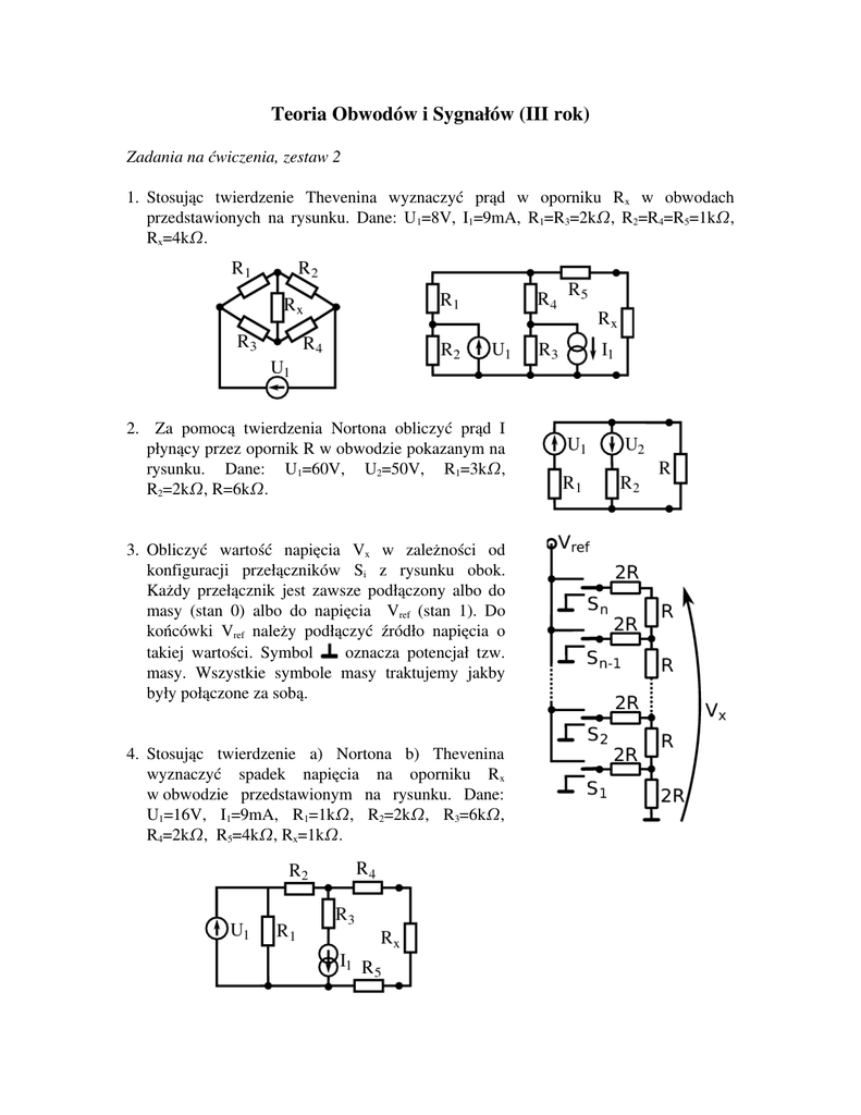 Teoria Obwodów i Sygnałów (III rok) Zadania na ćwiczenia, zestaw 2 1. Stosując twierdzenie Thevenina wyznaczyć prąd w oporniku Rx w obwodach przedstawionych na rysunku. Dane: U1=8V, I1=9mA, R1=R3=2k, R2=R4=R5=1k, Rx=4k. 2. Za pomocą twierdzenia Nortona obliczyć prąd I płynący przez opornik R w obwodzie pokazanym na rysunku. Dane: U1=60V, U2=50V, R1=3k, R2=2k, R=6k. 3. Obliczyć wartość napięcia Vx w zależności od konfiguracji przełączników Si z rysunku obok. Każdy przełącznik jest zawsze podłączony albo do masy (stan 0) albo do napięcia Vref (stan 1). Do końcówki Vref należy podłączyć źródło napięcia o takiej wartości. Symbol oznacza potencjał tzw. masy. Wszystkie symbole masy traktujemy jakby były połączone za sobą. 4. Stosując twierdzenie a) Nortona b) Thevenina wyznaczyć spadek napięcia na oporniku Rx w obwodzie przedstawionym na rysunku. Dane: U1=16V, I1=9mA, R1=1k, R2=2k, R3=6k, R4=2k, R5=4k, Rx=1k.