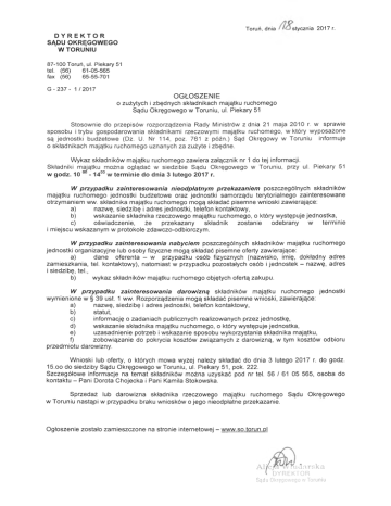 Toruń, dnia stycznia 2017 r. DYREKTOR SĄDU OKRĘGOWEGO W TORUNIU 87-100 Toruń, ul. Piekary 51 tel. (56) 61-05-565 fax (56) 65-55-701 G - 2 3 7 - 1 /2 01 7 OGŁOSZENIE o zużytych i zbędnych składnikach majątku ruchomego Sądu Okręgowego w Toruniu, ul. Piekary 51 Stosownie do przepisów rozporządzenia Rady Ministrów z dnia 21 maja 2010 r. w sprawie sposobu i trybu gospodarowania składnikami rzeczowymi majątku ruchomego, w który wyposażone są jednostki budżetowe (Dz. U. Nr 114, poz. 761 z póżn.) Sąd Okręgowy w Toruniu informuje 0 składnikach majątku ruchomego uznanych za zużyte i zbędne. Wykaz składników majątku ruchomego zawiera załącznik nr 1 do tej informacji. Składniki m^ątku można oglądać w siedzibie Sądu Okręgowego w Toruniu, przy ul. Piekary 51 w godz. 10 ° -14°° w terminie do dnia 3 lutego 2017 r. W przypadku zainteresowania nieodpłatnym przekazaniem poszczególnych składników majątku ruchomego jednostki budżetowe oraz jednostki samorządu terytorialnego zainteresowane otrzymaniem ww. składnika majątku ruchomego mogą składać pisemne wnioski zawierające: a) nazwę, siedzibę i adres jednostki, telefon kontaktowy, b) wskazanie składnika rzeczowego majątku ruchomego, o który występuje jednostka, c) oświadczenie, że przekazany składnik zostanie odebrany w terminie 1miejscu wskazanym w protokole zdawczo-odbiorczym. W przypadku zainteresowania nabyciem poszczególnych składników majątku ruchomego jednostki organizacyjne lub osoby fizyczne mogą składać pisemne oferty zawierające: a) dane oferenta - w przypadku osób fizycznych (nazwisko, imię, dokładny adres zamieszkania, tel. kontaktowy), natomiast w przypadku pozostałych osób i jednostek - nazwę, adres i siedzibę, tel., b) wykaz składników majątku ruchomego objętych ofertą zakupu. W przypadku zainteresowania darowizną składników majątku ruchomego jednostki wymienione w § 39 ust. 1 ww. Rozporządzenia mogą składać pisemne wnioski, zawierające: a) nazwę, siedzibę i adres jednostki, telefon kontaktowy, b) statut, c) informację o zadaniach publicznych realizowanych przez jednostkę, d) wskazanie składnika majątku ruchomego, o który występuje jednostka, e) uzasadnienie potrzeb i wskazanie sposobu wykorzystania składnika majątku, f) zobowiązanie do pokrycia kosztów związanych z darowizną, w tym kosztów odbioru przedmiotu darowizny. Wnioski lub oferty, o których mowa wyżej należy składać do dnia 3 lutego 2017 r. do godz. 15.00 do siedziby Sądu Okręgowego w Toruniu, ul. Piekary 51, pok. 222. Szczegółowe informacje na temat składników można uzyskać pod nr tel. 56 / 61 05 565, osoba do kontaktu - Pani Dorota Chojecka i Pani Kamila Stokowska. Sprzedaż lub darowizna składnika rzeczowego majątku ruchomego Sądu Okręgowego w Toruniu nastąpi w przypadku braku wniosków o jego nieodpłatne przekazanie. Ogłoszenie zostało zamieszczone na stronie internetowej - www.so.torun.pl Tudarska DYREKTOR Sądu Okręgowego w Toruniu