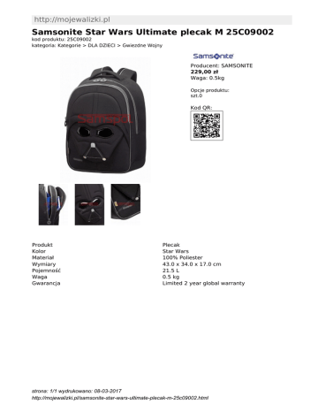 http://mojewalizki.pl Samsonite Star Wars Ultimate plecak M 25C09002 kod produktu: 25C09002 kategoria: Kategorie > DLA DZIECI > Gwiezdne Wojny Producent: SAMSONITE 229,00 zł Waga: 0.5kg Opcje produktu: szt.0 Kod QR: Produkt Kolor Materiał Wymiary Pojemność Waga Gwarancja Plecak Star Wars 100% Poliester 43.0 x 34.0 x 17.0 cm 21.5 L 0.5 kg Limited 2 year global warranty strona: 1/1 wydrukowano: 08-03-2017 http://mojewalizki.pl/samsonite-star-wars-ultimate-plecak-m-25c09002.html