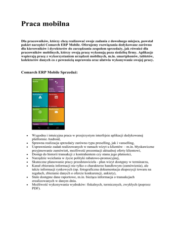 Praca mobilna Dla pracowników, którzy chcą realizować swoje zadania z dowolnego miejsca, powstał pakiet narzędzi Comarch ERP Mobile. Oferujemy rozwiązania dedykowane zarówno dla kierowników i dyrektorów do zarządzania zespołem sprzedaży, jak również dla pracowników mobilnych, którzy swoją pracę wykonują poza siedzibą firmy. Aplikacje wspierają pracę z wykorzystaniem urządzeń mobilnych, m.in. smartphonów, tabletów, kolektorów danych co z pewnością usprawnia oraz ułatwia wykonywanie swojej pracy. Comarch ERP Mobile Sprzedaż: Wygodna i intuicyjna praca w przejrzystym interfejsie aplikacji dedykowanej platformie Android, Sprawna realizacja sprzedaży zarówno typu preselling, jak i vanselling, Usprawnienie zadań realizowanych w ramach wizyt u klientów – m.in. błyskawiczne przyjmowanie zamówień, możliwość prezentacji aktualnej oferty klientowi, Dostęp do historii transakcji z kontrahentem czy stanu jego płatności, Narzędzie wcielania w życie polityki rabatowo-promocyjnej, Skuteczne planowanie pracy przedstawiciela - plan wizyt dostępny w terminarzu, Kanał zbierania informacji nie tylko o charakterze handlowym (zamówienia), ale także informacji rynkowych (np. fotograficzna dokumentacja ekspozycji towaru na regałach, zbieranie danych o ofercie konkurencji, ankiety), Stale dostępne dane raportowe, m.in. bieżąca informacja o transakcjach zrealizowanych w danym dniu. Możliwość wykonywania wydruków: fiskalnych, termicznych, zwykłych (poprzez PDF). Comarch ERP Mobile Flota: Monitoring tras przejazdów pracowników z perspektywy mapy. Informacja o korkach drogowych, awariach, czy utracie sygnału GPS. Określać statusy pracy, np. załadunek, otwarcie klapy. Wygodna komunikacja, zarówno kierownika z podległymi przedstawicielami, jak i przedstawicieli między sobą. Comarch ERP Mobile Magazyn: Realizacja dyspozycji magazynowych - możliwość edycji dokumentów przygotowanych po stronie systemu ERP, jak i dodawania nowych dokumentów bezpośrednio z poziomu kolektora danych. Szybkie przygotowanie towarów do wydania. Sprawna realizacja przyjęć magazynowych. Możliwość dokonywania przesunięć magazynowych. Obsługa inwentaryzacji z wykorzystaniem czytnika kodów. Stały dostęp do informacji o kontrahentach i towarach (kartoteki kontrahentów i towarowe). Możliwość weryfikacji towaru na podstawie sczytanego kodu EAN. Komfortowe przeglądanie raportów i analiz na urządzeniu mobilnym wyposażonym w system operacyjny Android, Możliwość analizy danych w różnej formie (tabele lub wykresy), Dynamiczna praca na raportach – możliwość zmiany sposobu prezentacji informacji, Zapewnienie bezpieczeństwa wrażliwych informacji dzięki mechanizmom ochrony hasłem.