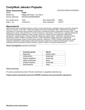 Certyfikat Jakości Pojazdu DCO/C20/19539-CJP/280916 Dane samochodu Marka Model/Typ Numer nadwozia FORD Fiesta 12-/Fiesta 1.25 Gold X WF0DXXGAKDEP56629 Poj. silnika [ccm] Data 1. rej. 1242 15-09-2014 Moc silnika [kW] Kolor nadwozia 82/60 ZŁOTY Wyposażenie ABS; Airbag 6 sztuk: poduszki powietrzne czołowe i boczne dla kierowcy i pasażera, kurtyny powietrzne; Dywaniki welurowe z przodu i z tyłu; EBA - układ wspomagania hamowania awaryjnego; EBD - elektroniczny rozdział sił hamowania; El. sterowane szyby przednie, opuszczane / podnoszone jednym naciśnięciem przycisku; ESP - układ stabilizacji toru jazdy; Felgi aluminiowe 15 (wzór 5-ramienny) z ogumieniem; Fotel kierowcy z regulacją lędźwiową; Klimatyzacja; Komputer pokładowy; Lakier metalik; Lakier Uni; Lusterka boczne regulowane elektrycznie i ogrzewane; Lusterka boczne w kolorze nadwozia; Ogrzewana szyba przednia - Quickclear i ogrzewane dysze spryskiwaczy; Radio CD/MP3 z gniazdem AUX-IN + USB, 6 głośników, zdalnie sterowane; Sygnalizacja hamowania awaryjnego; System monitorowania ciśnienia w ogumieniu (TPMS); Światła przeciwmgielne, przód; Tapicerka materiałowa; Wspomaganie układu kierowniczego, elektryczne; Wyłącznik deaktywujący czołową poduszkę powietrzną pasażera; Zamek centralny z pilotem; Zestaw do naprawy przebitej opony. Ocena szczegółowa (wg listy kontrolnej) Oceniana grupa Nadwozie Układ jezdny Zespół napędowy Układ wydechowy Wnętrze pojazdu Serwisowanie Wynik bardzo dobry doskonały doskonały dobry doskonały dobry Ocena końcowa W wyniku sprawdzenia ponad 150 pkt. kontrolnych w pojeździe stwierdza się: Pojazd spełnia standardy techniczne DEKRA określone dla samochodów używanych Wszelkie prawa zastrzeżone