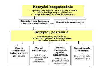 Korzyści bezpośrednie • ujawniają się szybko i kumulują się w czasie • są do pewnego stopnia policzalne • mogą prowadzić do efektów pośrednich Redukcja ryzyka kursowego i kosztów transakcyjnych ObniŜka stóp procentowych Korzyści pośrednie •mają charakter potencjalny • naleŜy je traktować w kategorii szans •są trudne do oszacowania Wzrost stabilności i wiarygodności gospodarki Wzrost konkurencji, realokacja zasobów w skali obszaru walutowego Rozwój i integracja rynków finansowych, dostęp do głębszego rynku finansowego Wzrost handlu i inwestycji krajowych oraz zagranicznych 1 Koszty Długookresowe Krótkookresowe •utrata krajowej polityki pienięŜnej i kursowej • spadają w miarę upływu czasu •trudno je oszacować •dostosowania ekonomiczne techniczne i organizacyjne •ujawniają się w krótkim okresie •są do pewnego stopnia policzalne ZagroŜenia średnio- i długookresowe Ryzyko ustalenia nieoptymalnego kursu konwersji Ryzyko boomu kredytowego i nadmiernego zadłuŜenia Ryzyko wzrostu inflacji, utraty konkurencyjnoś ci, wzrostu bezrobocia Ryzyko przenoszenia wstrząsów na rynkach finansowych Ryzyko nieskutecznego funkcjonowania mechanizmów alternatywnych wobec polityki pienięŜnej 2 Narzędziem oceny zdolności kraju do usztywnienia kursu jest TOOW OOW - to obszar, który utrzymuje równowagę wewnętrzną (wymienność pomiędzy inflacją i bezrobociem) oraz zewnętrzną (równowaga bilansu płatniczego) W dyskusji nad optymalnym reŜimem kursowym przyjęto, iŜ sztywny kurs walutowy pozwala na skuteczniejsze utrzymanie równowagi Niemniej jednak porzucenie k.w. jest kosztem makroekonomicznym Asymetryczne oddziaływanie szoku na równowagę wewnętrzną w kraju A i B Kraj A - Niemcy Kraj B – Hiszpania Poziom Cen Poziom Cen S0 S0 E0 E0 PB1 PA0 D0 D0 0 0 QA0 QA QB0 QB Asymetryczne oddziaływanie szoku na równowagę wewnętrzną w kraju A i B Kraj A - Niemcy Kraj B – Hiszpania Poziom Cen Poziom Cen S0 S0 E1 PA1 E0 E0 D1 PA0 PB1 PB0 E2 D0 D0 0 D1 0 QA0 QA1 QA QB1 QB0 QB Jak przywrócić równowagę ? - Polityką kursową - Aprecjacja/Rewaluacja k.w. w Niemczech - Dewaluacja/Deprecjacja k.w. w Hiszpanii - Polityką pienięŜną - ObniŜka stóp % w Hiszpanii - PodwyŜka stóp % w Niemczech - Polityką fiskalną - PodwyŜka podatków w Niemczech - ObniŜka podatków w Hiszpanii - …..lub transfer dochodów poprzez budŜet centralny Wg prekursorów TOOW R. Mundell’a (1961), R. McKinnon’a (1963), P. Kenen’a (1969), Przyjęcie wspólnej waluty (kursu sztywnego) jest optymalne dla tych krajów, które posiadają odpowiednie mechanizmy dostosowawcze, moŜliwe do szybkiego uruchomienia w przypadku wystąpienia szoków asymetrycznych między nimi. „Pioneering phase” od 1961 r. do pocz. lat 70. XIX w. STARA TOOW •Mobilność czynników wytwórczych •Elastyczność cen i płac •Integracja rynków finansowych •Integracja fiskalna – wspólny budŜet •Stopień otwartości gospodarki •Dywersyfikacja produkcji •Podobieństwo stóp inflacji •„Reconciliation phase” – lata 70. – początek lat 80. •Szacowanie korzyści i kosztów integracji •Pojawienie się meta – property, korelacja cykli koniunkturalnych •Spowolnienie integracji monetarnej w Europie Dwie kategorie kryteriów TOOW Konwergencja Realna •Podobieństwo struktur gospodarek, Konwergencja Nominalna •Neutralność pieniądza w długim okresie, •Elastyczność struktur gospodarek, •Nieefektywność mechanizmu kursowego, •Wiarygodność polityki makroekonomicznej Forces Driving Macroeconomy Polityka fiskalna Polityka pienięŜna Kryteria wejścia kraju do UGW określone w Traktacie z Maastricht: • Średnia stopa inflacji • Średnia nominalna długookresowa • • • • stopa procentowa Stabilność kursu walutowego Deficyt budŜetowy Dług publiczny NiezaleŜność banku centralnego Kryteria wejścia kraju do UGW określone w Traktacie z Maastricht: • Średnia stopa inflacji (1,5 p.p. + śr. 3 krajów o • • • • • najniŜszej inflacji) Średnia nominalna długookresowa stopa procentowa (2 p.p + śr. Stopa % 3 krajów o najniŜszej inflacji) Stabilność kursu walutowego (+/-15% wokół parytetu) Deficyt budŜetowy (max. 3% PKB ) Dług publiczny (max. 60% PKB) NiezaleŜność banku centralnego Polityka pienięŜna Po drugiej wojnie światowej: „Podczas węgierskiej inflacji ceny biletów tramwajowych dostosowywano codziennie, podczas gdy ceny biletów kolejowych były zmieniane tylko co cztery dni”. Ze zjawiskiem braku wiarygodności polityki pienięŜnej próbuje się walczyć wykorzystując mechanizm tzw. kotwicy nominalnej (nominal anchor) Japan S w itz e r la n d F in la n d Sweden F ra n c e G e rm a n y C anada B e lg iu m A u s tr ia D e n m a rk N e th e r la n d s A u s tr a lia UK USA Ir e la n d Ita ly S p a in P o r tu g a l G re e c e P o la n d M e x ic o H u n g a ry T u rk e y B r a z il Średnia roczna inflacja z lat 1992-2005 14,0 Poziom pow 50% 11,5 9,0 6,5 4,0 1,5 -1,0 Polityka pienięŜnej w krótkim okresie Inflacja π Krótki okres π’ π . B . A u Bezrobocie u Nieefektywność polityki pienięŜnej w długim okresie Inflacja π Długi okres . C π’ π . B . A u Krótki okres Bezrobocie u 100 bilionów dolarów na drobne zakupy eww 17-01-2009, ostatnia aktualizacja 17-01-2009 14:20 W Zimbabwe wyemitowano banknot o nominale 100 bilionów, który w momencie emisji kosztował około 30 dolarów amerykańskich. Wyemitowane we wtorek banknoty 50miliardowe są juŜ niewiele warte 6 Dlaczego niektóre kraje godzą się na porzucenie własnej polityki pienięŜnej... ... gdyŜ jest nieefektywna i niewiarygodna Im mniej wiarygodna krajowa polityka pienięŜna tym większa niechęć do pieniądza krajowego – wysoki poziom walut obcych w depozytach podmiotów gospodarczych. Polityka fiskalna w unii walutowej Polityka fiskalna jako mechanizm przywracania równowagi Transfer funduszy pomiędzy regio