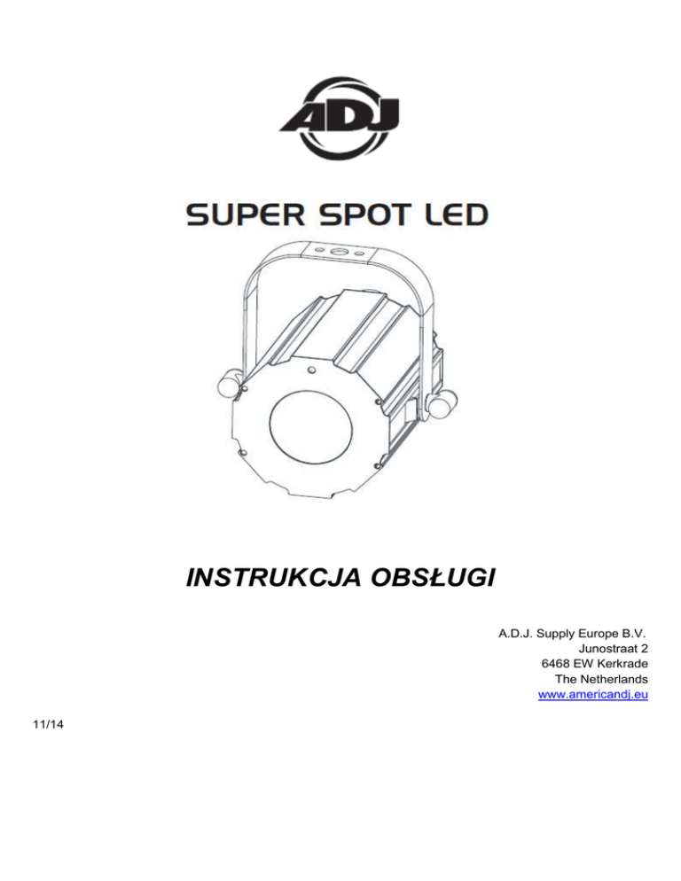 INSTRUKCJA OBSŁUGI A.D.J. Supply Europe B.V. Junostraat 2 6468 EW Kerkrade The Netherlands www.americandj.eu 11/14 ©2013 ADJ Products, LLC wszystkie prawa zastrzeżone. Informacje, specyfikacje, rysunki, zdjęcia oraz instrukcje zawarte w niniejszej instrukcji mogą ulec zmianie bez wcześniejszego powiadomienia. Produkty marki ADJ, logo LLC oraz nazwy i numery identyfikujące produkty opisane w niniejszym dokumencie stanowią znak handlowy ADJ Products, LLC. Zgłoszona ochrona praw autorskich obejmuje wszelkie formy i wszelkie kwestie dotyczące materiałów i informacji podlegających ochronie prawem autorskim, dozwolone obecnie przez obowiązujące ustawy bądź rozstrzygnięcia sądowe. Nazwy produktów użyte w niniejszym dokumencie mogą stanowić znaki towarowe bądź zarejestrowane znaki towarowe produkujących je spółek i zostają niniejszym prawnie uznane. Wszelkie marki oraz nazwy produktów nie pochodzące od ADJ Products, LLC, stanowią znaki towarowe lub zarejestrowane znaki towarowe odpowiednich, produkujących je spółek. ADJ Products, LLC oraz wszystkie powiązane z nią spółki wyłączają niniejszym wszelką swoją odpowiedzialność za szkody we własności, sprzęcie, budynkach lub szkody elektryczne, za obrażenia poniesione przez jakiekolwiek osoby, jak też za bezpośrednie lub pośrednie straty ekonomiczne związane z lub zależne od użycia jakichkolwiek informacji zawartych w niniejszym dokumencie, oraz/lub wynikłe z niewłaściwego, niebezpiecznego, niepełnego lub niestarannego montażu, instalacji, konfiguracji osprzętu oraz działania opisanych tutaj produktów. A.D.J. Supply Europe B.V. - www.americanaudio.eu - Super Spot LED Podręcznik Użytkownika 2 Spis treści INFORMACJE OGÓLNE ............................................................................................................................................................ 4 INSTRUKCJE OGÓLNE .............................................................................................................................................................. 4 CECHY:..................................................................................................................................................................................... 4 BEZPIECZNA OBSŁUGA ............................................................................................................................................................ 4 ŚRODKI BEZPIECZEŃSTWA ...................................................................................................................................................... 4 BEZPIECZNE PODWIESZANIE ................................................................................................................................................... 5 USTAWIENIA ........................................................................................................................................................................... 5 MENU SYSTEMU ..................................................................................................................................................................... 7 DZIAŁANIE ............................................................................................................................................................................... 9 KONFIGURACJA MASTER-SLAVE ........................................................................................................................................... 10 2 KANAŁY DMX...................................................................................................................................................................... 10 STEROWANIE UC IR ............................................................................................................................................................... 10 WYKRES FOTOMETRYCZNY ................................................................................................................................................... 11 WYMIANA BEZPIECZNIKA ..................................................................................................................................................... 11 CZYSZCZENIE ......................................................................................................................................................................... 11 ROZWIĄZYWANIE PROBLEMÓW .......................................................................................................................................... 11 SPECYFIKACJE ........................................................................................................................................................................ 12 ROHS - Olbrzymi wkład w ochronę środowiska .................................................................................................................... 13 WEEE – ODPADY Z URZĄDZEŃ ELEKTRYCZNYCH I ELEKTRONICZNYCH ................................................................................ 14 Uwaga: .................................................................................................................................................................................. 15 A.D.J. Supply Europe B.V. - www.americanaudio.eu - Super Spot LED Podręcznik Użytkownika 3 INOZIONE INFORMACJE OGÓLNE Wypakowanie: Dziękujemy za zakup Super Spot LED firmy ADJ Products, LLC. Każdy egzemplarz Super Spot LED został gruntownie przetestowany i wysłany do klientów w idealnym stanie technicznym. Należy dokładnie sprawdzić czy opakowanie nie posiada uszkodzeń powstałych w czasie transportu. W razie stwierdzenia uszkodzenia opakowania, dokładnie sprawdź, czy nie nastąpiło uszkodzenie sprzętu oraz upewnij się, że wszystkie części konieczne do obsługi urządzenia przybyły w stanie nienaruszonym. W razie stwierdzenia uszkodzeń lub braku części, należy skontaktować się z w