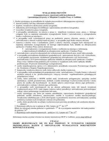 WYKAZ DOKUMENTÓW wymaganych przy rejestracji osób bezrobotnych i poszukujących pracy w Miejskim Urzędzie Pracy w Lublinie 1. Osoba rejestrująca się przedkłada do wglądu pracownikowi dokonującemu rejestracji: dowód osobisty lub inny dokument tożsamości, dyplom, świadectwo ukończenia szkoły (oryginał); dokumenty potwierdzające kwalifikacje i uprawnienia zawodowe (oryginały), wszystkie świadectwa pracy (oryginał), w przypadku zatrudnienia na umowę o pracę w niepełnym wymiarze czasu pracy, z którego osiągane było co najmniej minimalne wynagrodzenie brutto ( zaświadczenie o wynagrodzeniu brutto z rozbiciem na miesiące) , w przypadku osób wykonujących pracę na podstawie umowy zlecenia, umowy o dzieło – zaświadczenie o okresie wykonywania tej pracy, w przypadku jego braku umowa zlecenie (umowa o dzieło) wraz z rachunkiem; jeżeli z umowy zlecenia, osiągane było miesięcznie co najmniej minimalne wynagrodzenie od którego odprowadzane były składki na ubezpieczenie społeczne i Fundusz Pracy należy dostarczyć: zaświadczenie o wynagrodzeniu brutto z rozbiciem na miesiące z informacją o odprowadzanych składkach na ubezpieczenie społeczne i Fundusz Pracy zaświadczenie o przeciwwskazaniach do wykonywania określonych prac, jeżeli takie posiada, w przypadku prowadzenia działalności gospodarczych - prawomocne decyzje o ich wykreśleniu, a w przypadku zawieszenia działalności gospodarczej zaświadczenie o jej zawieszeniu zaświadczenie z ZUS potwierdzające opłacenie składek na ubezpieczenie społeczne i Fundusz Pracy wraz z deklarowaną podstawą ich wymiaru (z wyjątkiem osób, które opłacały składki preferencyjne 30 procent minimalnego wynagrodzenia), osoba niepełnosprawna oprócz w/w dokumentów przedkłada orzeczenie Powiatowego Zespołu ds. Orzekania o Stopniu Niepełnosprawności, książeczkę wojskową (dotyczy osób, które odbywały służbę wojskową), w przypadku osób posiadających gospodarstwo rolne zaświadczenie z Urzędu Gminy o obszarze użytków rolnych w ha przeliczeniowych ( dotyczy również współmałżonków posiadających gospodarstwo rolne) osoby, które pobierały z MOPR zasiłek stały, świadczenie pielęgnacyjne, specjalny zasiłek opiekuńczy, zasiłek gwarantowany, dodatek z tytułu samotnego wychowywania dziecka i utraty prawa do zasiłku dla bezrobotnych na skutek upływu ustawowego okresu jego pobierania zaświadczenie o rodzaju i okresie jego pobierania, w przypadku osób rejestrujących się po okresie pobierania renty lub innych świadczeń wypłaconych przez ZUS i inne organy rentowe należy przedłożyć zaświadczenie potwierdzające rodzaj i okres pobieranego świadczenia lub renty, osoby rejestrujące się, które po ustaniu zatrudnienia, zaprzestaniu działalności gospodarczej pobierały zasiłek chorobowy, macierzyński, zasiłek w wysokości zasiłku macierzyńskiego, świadczenia rehabilitacyjne z ZUS obowiązane są przedstawić stosowne zaświadczenia z podaną podstawą wymiaru tych świadczeń i okresie ich pobierania. osoby, które przebywały na urlopie wychowawczym powinny przedłożyć akt urodzenia dziecka (dzieci). 2. Rejestracja odbywa się w pokoju nr 106, I piętro od 745 do 1500 Bilety do rejestracji można pobierać w godzinach 730 do wyczerpania numerków lub maksymalnie do godziny 1400 3. Rejestracja osób niepełnosprawnych – pokój nr 112, I piętro od 745 do 1500 Informacje można uzyskać również na stronie internetowej MUP w Lublinie: www.mup.lublin.pl UWAGA! OSOBY REJESTRUJĄCE SIĘ PO RAZ PIERWSZY W TUTEJSZYM URZĘDZIE PRZEDKŁADAJĄ RAZEM Z ORYGINAŁAMI WYMAGANYCH DOKUMENTÓW RÓWNIEŻ ICH KOPIĘ 1 WNIOSEK O REJESTRACJĘ Na podstawie art. 61 Kodeksu postępowania administracyjnego, składam wniosek o zarejestrowanie mnie w Miejskim Urzędzie Pracy w Lublinie jako osoby bezrobotnej / poszukującej pracy.* Należy czytelnie uzupełnić dane w poniższej Tabeli: 1. Imię albo imiona i nazwisko 2. Obywatelstwo albo obywatelstwa 3. Numer PESEL 4. Imiona rodziców 5. Data i miejsce urodzenia 6. Nazwisko rodowe 7. Stan cywilny oraz informacja o pozostawaniu albo niepozostawaniu małżonka w rejestrze bezrobotnych i poszukujących pracy 8. 9. / nie dotyczy poszukujących pracy / Liczba dzieci na utrzymaniu ( imię, nazwisko, data urodzenia) / nie dotyczy poszukujących pracy / Adres zameldowania na pobyt stały 2 10. Adres zameldowania na pobyt czasowy 11. Adres do korespondencji 12. Poziom wykształcenia 13. Nazwy i daty ukończonych szkół 14. Zawody wyuczone, zawody wykonywane, kwalifikacje wyodrębnione w zawodach oraz zawód, w którym chciałby Pan/Pani pracować i ma ku temu odpowiednie kompetencje i kwalifikacje potwierdzone stosownymi dokumentami lub udokumentowaną ciągłość pracy w okresie minimum 6 miesięcy 15. Języki obce - poziom (słaby, biegły ) znajomości języków obcych 16. Posiadane uprawnienia zawodowe 17. Rodzaj i stopień niepełnosprawności, jeżeli dotyczy 18. Kierunki szkoleń, którymi jest Pan / Pani / zainteresowany /a/ 19. Ewentualne zainteresowanie podjęciem zatrudnienia w krajach Europejskiego Obszaru Gospodarczego * - niepotrzebne skreślić ………………………………………………. Data i podpis osoby składającej wniosek o rejestrację 3 POUCZENIE: Do każdego punktu należy udzielić odpowiedzi używając słów: „TAK” lub „NIE” Oświadczenie rejestrowanego Uprzedzona/y o obowiązku składania prawdziwych zeznań oraz o odpowiedzialności karnej wynikającej z art. 233 § 1 kodeksu karnego oświadczam, co następuje: 1. 2. 3. 4. Jestem osobą zdolną i gotową do podjęcia zatrudnienia: a) w pełnym wymiarze czasu pracy obowiązującego w danym zawodzie lub służbie ....................................................................................................................... b) co najmniej w połowie wymiaru czasu pracy obowiązującego w danym zawodzie lub służbie, gdyż jestem osobą niepeł