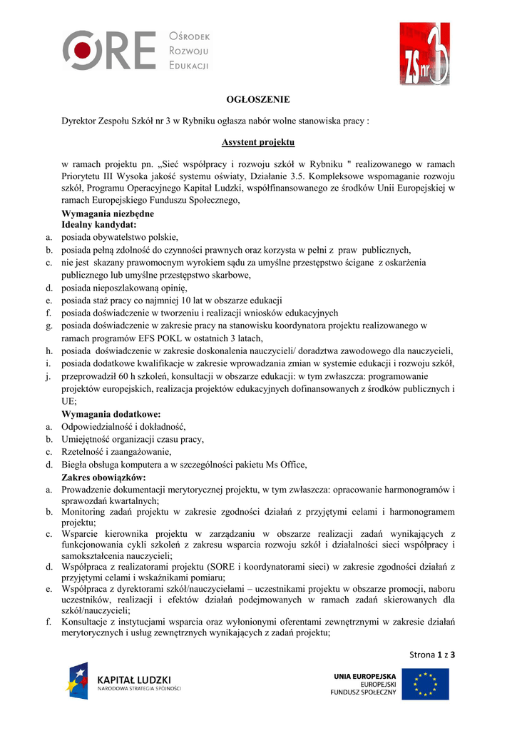 OGŁOSZENIE Dyrektor Zespołu Szkół nr 3 w Rybniku ogłasza nabór wolne stanowiska pracy : Asystent projektu a. b. c. d. e. f. g. h. i. j. a. b. c. d. a. b. c. d. e. f. w ramach projektu pn. „Sieć współpracy i rozwoju szkół w Rybniku " realizowanego w ramach Priorytetu III Wysoka jakość systemu oświaty, Działanie 3.5. Kompleksowe wspomaganie rozwoju szkół, Programu Operacyjnego Kapitał Ludzki, współfinansowanego ze środków Unii Europejskiej w ramach Europejskiego Funduszu Społecznego, Wymagania niezbędne Idealny kandydat: posiada obywatelstwo polskie, posiada pełną zdolność do czynności prawnych oraz korzysta w pełni z praw publicznych, nie jest skazany prawomocnym wyrokiem sądu za umyślne przestępstwo ścigane z oskarżenia publicznego lub umyślne przestępstwo skarbowe, posiada nieposzlakowaną opinię, posiada staż pracy co najmniej 10 lat w obszarze edukacji posiada doświadczenie w tworzeniu i realizacji wniosków edukacyjnych posiada doświadczenie w zakresie pracy na stanowisku koordynatora projektu realizowanego w ramach programów EFS POKL w ostatnich 3 latach, posiada doświadczenie w zakresie doskonalenia nauczycieli/ doradztwa zawodowego dla nauczycieli, posiada dodatkowe kwalifikacje w zakresie wprowadzania zmian w systemie edukacji i rozwoju szkół, przeprowadził 60 h szkoleń, konsultacji w obszarze edukacji: w tym zwłaszcza: programowanie projektów europejskich, realizacja projektów edukacyjnych dofinansowanych z środków publicznych i UE; Wymagania dodatkowe: Odpowiedzialność i dokładność, Umiejętność organizacji czasu pracy, Rzetelność i zaangażowanie, Biegła obsługa komputera a w szczególności pakietu Ms Office, Zakres obowiązków: Prowadzenie dokumentacji merytorycznej projektu, w tym zwłaszcza: opracowanie harmonogramów i sprawozdań kwartalnych; Monitoring zadań projektu w zakresie zgodności działań z przyjętymi celami i harmonogramem projektu; Wsparcie kierownika projektu w zarządzaniu w obszarze realizacji zadań wynikających z funkcjonowania cykli szkoleń z zakresu wsparcia rozwoju szkół i działalności sieci współpracy i samokształcenia nauczycieli; Współpraca z realizatorami projektu (SORE i koordynatorami sieci) w zakresie zgodności działań z przyjętymi celami i wskaźnikami pomiaru; Współpraca z dyrektorami szkół/nauczycielami – uczestnikami projektu w obszarze promocji, naboru uczestników, realizacji i efektów działań podejmowanych w ramach zadań skierowanych dla szkół/nauczycieli; Konsultacje z instytucjami wsparcia oraz wyłonionymi oferentami zewnętrznymi w zakresie działań merytorycznych i usług zewnętrznych wynikających z zadań projektu; Strona 1 z 3 g. Kontakt i konsultacje z ekspertami zewnętrznymi na temat zakresu ich zadań i realizacji działań zgodnych z przyjętymi celami projektu; Warunki pracy : a. wymiar czasu pracy 1 stanowisko - 1 umowa zlecenie na czas realizacji projektu b. umowa na cza trwania projektu pn. „Sieć współpracy i rozwoju szkół w Rybniku " a) b) c) d) e) f) g) h) i) j) k) l) Wskaźnik zatrudnienia osób niepełnosprawnych w jednostce: Wskaźnik zatrudnienia osób niepełnosprawnych w Zespole Szkół nr 3 w Rybniku, w rozumieniu przepisów o rehabilitacji zawodowej i społecznej oraz zatrudnianiu osób niepełnosprawnych, w miesiącu lipcu 2013 r., wyniósł poniżej 6 %. Wymagane dokumenty: CV, List motywacyjny, Kopia dokumentu potwierdzająca tożsamość, Kopie dokumentów potwierdzające wykształcenie i umiejętności, Kopie dokumentów potwierdzających doświadczenie zawodowe, Wykaz zawierający informacje potwierdzające doświadczenie w tworzeniu i realizacji wniosków edukacyjnych, w zakresie pracy na stanowisku koordynatora projektu realizowanego w ramach programu EFS POKL w ostatnich 3 latach, w zakresie obszaru doskonalenia nauczycieli/ doradztwa zawodowego dla nauczycieli potwierdzone wykazem wykonywanej pracy/stanowiska pracy, dodatkowe kwalifikacje w zakresie wprowadzania zmian w systemie edukacji i rozwoju szkół, przeprowadzenia 60 h szkoleń, konsultacji w obszarze edukacji: programowanie projektów europejskich, realizacja projektów edukacyjnych dofinansowanych z środków publicznych i UE; W wykazie należy podać kontakt do instytucji i osób mogących potwierdzić informacje w nim zawarte. Oświadczenie kandydata od kiedy może nastąpić zatrudnienie, Oświadczenie kandydata o posiadaniu pełnej zdolności do czynności prawnych oraz o korzystaniu z pełni praw publicznych, Oświadczenie kandydata o braku skazania prawomocnym wyrokiem sądu za umyślne przestępstwo ścigane z oskarżenia publicznego lub umyślne przestępstwo skarbowe, Oświadczenie kandydata o posiadaniu nieposzlakowanej opinii, Oświadczenie kandydata o wyrażeniu zgody na przetwarzanie danych osobowych, Oświadczenie kandydata o przyjęciu do wiadomości faktu obowiązku publikacji w BIP danych osobowych. Oryginały dokumentów należy przedstawić w czasie rozmowy kwalifikacyjnej. Informujemy że skontaktujemy się z wybranymi osobami. Nadesłanych ofert nie zwracamy. Oferty należy przesyłać w zamkniętej kopercie podpisanej : Kandydat na stanowisko- Asystent projektu w ramach projektu pn. „Sieć współpracy i rozwoju szkół w Rybniku " do sekretariatu Zespołu Szkół nr 3 w Rybniku, ul. Orzepowicka 15 a, 44-217 Rybnik w terminie do dnia 19 sierpnia 2013r. godz. 9:00 Strona 2 z 3 Dokumenty, które wpłyną po wyżej określonym terminie nie będą rozpatrywane. Informacja o wyniku naboru będzie zamieszczona w Biuletynie Informacji Publicznej http://zs3.bip.edukacja.rybnik.eu/455/ i na tablicy ogłoszeń w Zespole Szkół nr 3 w Rybniku zgodnie z ustawą z dnia 21 listopada 2008 r. o pracownikach samorządowych (Dz. U. Nr 223, poz. 1458 ze zmianami). Informacja o wynikach naboru zawiera imiona i nazwiska kandydatów oraz ich miejsce zamieszkania w rozumieniu przepisów Kodeksu cywilnego. 2. Etapy rekrutacji. Rekrutacja