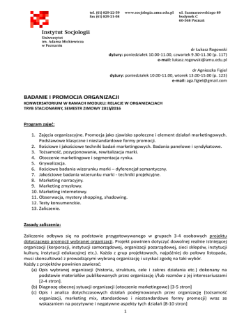dr Łukasz Rogowski dyżury: poniedziałek 10.00-11.00, czwartek 9.30-11.30 (p. 117) e-mail: [email protected] dr Agnieszka Figiel dyżury: poniedziałek 10.00-11.00, wtorek 13.00-15.00 (p. 123) e-mail: [email protected] BADANIE I PROMOCJA ORGANIZACJI KONWERSATORIUM W RAMACH MODUŁU: RELACJE W ORGANIZACJACH TRYB STACJONARNY, SEMESTR ZIMOWY 2015/2016 Program zajęć: 1. Zajęcia organizacyjne. Promocja jako zjawisko społeczne i element działań marketingowych. Podstawowe klasyczne i niestandardowe formy promocji. 2. Ilościowe i jakościowe techniki badań marketingowych. Badania panelowe i syndykatowe. 3. Tożsamość, pozycjonowanie, rewitalizacja marki. 4. Otoczenie marketingowe i segmentacja rynku. 5. Grywalizacja. 6. Ilościowe badania wizerunku marki – dyferencjał semantyczny. 7. Jakościowe badania wizerunku marki - techniki projekcyjne. 8. Marketing narracyjny. 9. Marketing zmysłowy. 10. Marketing internetowy. 11. Obserwacja, mystery shopping, shadowing. 12. Testy konsumenckie. 13. Zaliczenie. Zasady zaliczenia: Zaliczenie odbywa się na podstawie przygotowywanego w grupach 3-4 osobowych projektu dotyczącego promocji wybranej organizacji. Projekt powinien dotyczyć dowolnej realnie istniejącej organizacji (korporacji, instytucji samorządowej, organizacji pozarządowej, sieci sklepów, instytucji kultury, instytucji edukacyjnej etc.). Każda z grup projektowych, najpóźniej do połowy listopada, musi skonsultować z prowadzącymi wybraną organizację i uzyskać zgodę na taki wybór. Każdy z projektów powinien zawierać: (a) Opis wybranej organizacji (historia, struktura, cele i zakres działania etc.) dokonany na podstawie materiałów publikowanych przez organizację i/lub rozmów z jej interesariuszami [2-4 stron]. (b) Diagnozę obecnej sytuacji organizacji (otoczenie marketingowe) [3-5 stron] (c) Opis i analiza dotychczasowych działań podejmowanych przez organizację (tożsamość organizacji, marketing mix, standardowe i niestandardowe formy promocji) wraz ze wskazaniem na pozytywne i negatywne aspekty tych działań [8-10 stron] 1 (d) Własną propozycję przyszłych działań organizacji (z wykorzystaniem technik poznanych podczas zajęć) [8-10 stron] (e) Zaprojektowanie badań i narzędzi badawczych służących diagnozie obecnej sytuacji organizacji oraz ocenie skuteczności proponowanych działań [5-8 stron] Wymogi formalne: czcionka 12pkt, interlinia 1,5, format .doc lub .docx. Projekt należy przesyłać na adresy mailowe prowadzących w uzgodnionym później terminie. Każdy dzień opóźnienia = ocena niżej. UWAGA! Praca powinna mieć charakter autorski i twórczy i być przygotowana w oparciu o własne analizy i pomysły. Korzystanie z materiałów internetowych, w inny sposób, niż na zasadzie ilustracji/przykładu, skutkuje oceną niedostateczną oraz poinformowaniem o plagiacie Dyrekcji Instytutu. Warunkiem przystąpienia do zaliczenia jest nieprzekroczenie dopuszczalnej liczby nieobecności. Możliwe jest opuszczenie bez konsekwencji 2 zajęć (bez względu na przyczynę). W przypadku 3. i 4. nieobecności konieczne jest ich odrobienie w terminach dyżurów prowadzącego zajęcia, na których było się nieobecnym. Więcej jak 4 nieobecności (poza wyjątkowymi przypadkami, rozpatrywanymi indywidualnie) uniemożliwiają przystąpienie do zaliczenia. UWAGA!: Pilnowanie liczby opuszczonych zajęć jest obowiązkiem studentów, a nie wykładowców. Nieobecności muszą zostać odrobione najpóźniej na tydzień przed terminem zaliczenia. W ciągu semestru studenci będą zobowiązani do zrealizowania 7 zadań domowych, dotyczących treści prezentowanych podczas zajęć. Zadania domowe powinny być przesyłane na adresy mailowe obu prowadzących min. dzień przed kolejnymi zajęciami. Warunkiem uzyskania zaliczenia jest indywidualne zrealizowanie przez każdego studenta wszystkich zadań i ich pozytywne zaliczenie przez prowadzących. Zadania domowe zastępują przygotowywanie się do zajęć na podstawie tekstów obowiązkowych. Osoby studiujące według indywidualnej organizacji studiów są zobowiązane do poinformowania o tym prowadzących, najpóźniej podczas 3. zajęć w ciągu semestru. IOS zwalnia z obowiązku uczestnictwa w zajęciach, student musi jednak w tych przypadkach odrobić wszystkie nieobecności podczas dyżurów prowadzących (odrabianie powinno odbywać się w częściach, przynajmniej raz w miesiącu, a nie całościowo pod koniec semestru). Wybrana literatura: Baker Michael J., Hart Susan J. (red.), „The Marketing Book”, Burlington 2008. Black Sam, „Public relations”, Kraków 2001. Cialdini Robert B., „Wywieranie wpływu na ludzi: teoria i praktyka”, Gdańsk 2008. Evans Liana, „Social media marketing. Odkryj potencjał Facebooka, Twittera i innych portali społecznościowych”, Gliwice 2011. Hughes Mark, „Marketing szeptany. Z ust do ust. Jak robić szum medialny wokół siebie, firmy, produktu”, Warszawa 2008. Jabłoński Wojciech, „Kreowanie informacji. Media relations”, Warszawa 2007. Jupowicz-Ginalska Anna, „Marketing medialny”, Warszawa 2010. Konkol Sebastian, „Marketing mobilny”, Gliwice 2010. Kotler Philip, „Marketing”, Poznań 2005. Kotler Philip, Kartajara Herwaman, Setiawan Iwan, „Marketing 3.0”, Hoboken 2010. Makarenko Vadim, „Tajne służby kapitalizmu”, Kraków 2008. Mistewicz Eryk, „Marketing narracyjny. Jak budować historie, które sprzedają”, Gliwice 2011. Moilanen Teemu, Rainisto Seep, „How to Brand Nations, Cities, Destinations”, Trowbridge 2009. Nikodemska-Wołowik Anna Maria, „Klucz do zrozumienia nabywcy: jakościowe badania 2 marketingowe”, Warszawa 2008. Sadowski Michał, „Rewolucja social media”, Gliwice 2013. Sitek Wojciech, „Między rynkiem a civil society. Konteksty badań socjologicznych”, Warszawa 2007. Solomon Michael R, Marshall Greg W., Stuart Elnora W., „Marketing: Real People, Real Choises”, Upper Saddle River 2008. Under