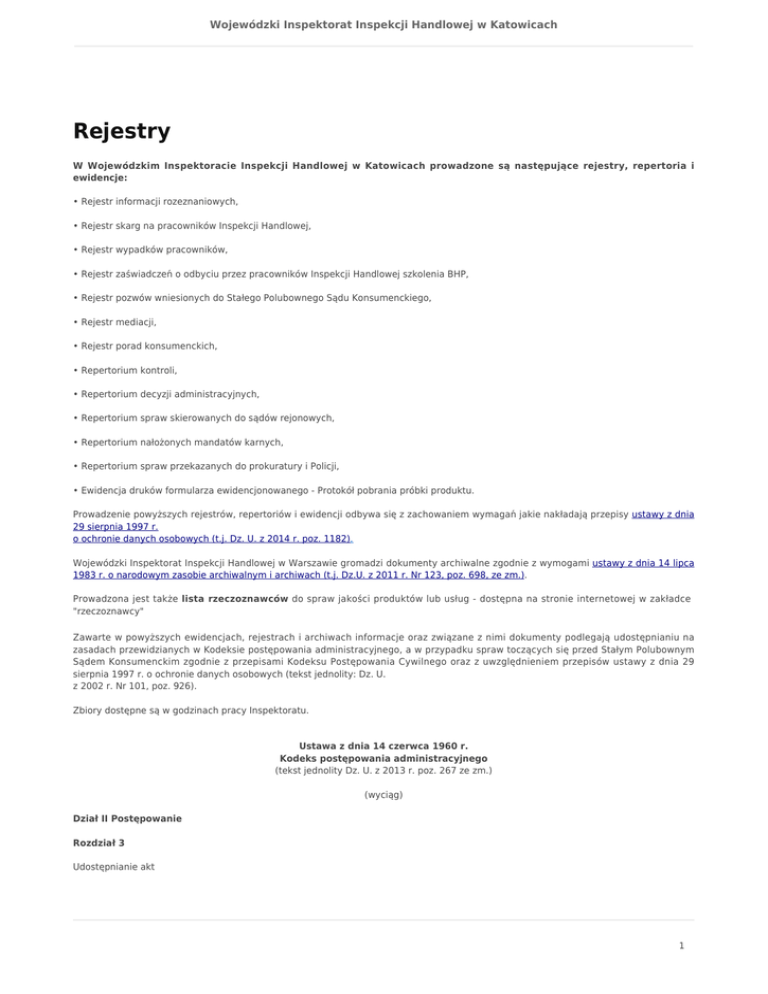 Wojewódzki Inspektorat Inspekcji Handlowej w Katowicach Rejestry W Wojewódzkim Inspektoracie Inspekcji Handlowej w Katowicach prowadzone są następujące rejestry, repertoria i ewidencje: • Rejestr informacji rozeznaniowych, • Rejestr skarg na pracowników Inspekcji Handlowej, • Rejestr wypadków pracowników, • Rejestr zaświadczeń o odbyciu przez pracowników Inspekcji Handlowej szkolenia BHP, • Rejestr pozwów wniesionych do Stałego Polubownego Sądu Konsumenckiego, • Rejestr mediacji, • Rejestr porad konsumenckich, • Repertorium kontroli, • Repertorium decyzji administracyjnych, • Repertorium spraw skierowanych do sądów rejonowych, • Repertorium nałożonych mandatów karnych, • Repertorium spraw przekazanych do prokuratury i Policji, • Ewidencja druków formularza ewidencjonowanego - Protokół pobrania próbki produktu. Prowadzenie powyższych rejestrów, repertoriów i ewidencji odbywa się z zachowaniem wymagań jakie nakładają przepisy ustawy z dnia 29 sierpnia 1997 r. o ochronie danych osobowych (t.j. Dz. U. z 2014 r. poz. 1182). Wojewódzki Inspektorat Inspekcji Handlowej w Warszawie gromadzi dokumenty archiwalne zgodnie z wymogami ustawy z dnia 14 lipca 1983 r. o narodowym zasobie archiwalnym i archiwach (t.j. Dz.U. z 2011 r. Nr 123, poz. 698, ze zm.). Prowadzona jest także lista rzeczoznawców do spraw jakości produktów lub usług - dostępna na stronie internetowej w zakładce "rzeczoznawcy" Zawarte w powyższych ewidencjach, rejestrach i archiwach informacje oraz związane z nimi dokumenty podlegają udostępnianiu na zasadach przewidzianych w Kodeksie postępowania administracyjnego, a w przypadku spraw toczących się przed Stałym Polubownym Sądem Konsumenckim zgodnie z przepisami Kodeksu Postępowania Cywilnego oraz z uwzględnieniem przepisów ustawy z dnia 29 sierpnia 1997 r. o ochronie danych osobowych (tekst jednolity: Dz. U. z 2002 r. Nr 101, poz. 926). Zbiory dostępne są w godzinach pracy Inspektoratu. Ustawa z dnia 14 czerwca 1960 r. Kodeks postępowania administracyjnego (tekst jednolity Dz. U. z 2013 r. poz. 267 ze zm.) (wyciąg) Dział II Postępowanie Rozdział 3 Udostępnianie akt 1 Wojewódzki Inspektorat Inspekcji Handlowej w Katowicach Art. 73. § 1. Strona ma prawo wglądu w akta sprawy, sporządzania z nich notatek, kopii lub odpisów. Prawo to przysługuje również po zakończeniu postępowania. § 1a. Czynności określone w § 1 są dokonywane w lokalu organu administracji publicznej w obecności pracownika tego organu. § 2. Strona może żądać uwierzytelnienia odpisów lub kopii akt sprawy lub wydania jej z akt sprawy uwierzytelnionych odpisów, o ile jest to uzasadnione ważnym interesem strony. § 3. Organ administracji publicznej może zapewnić stronie dokonanie czynności, o których mowa w § 1, w swoim systemie teleinformatycznym, po identyfikacji strony w sposób określony w art. 20a ust. 1 albo 2 ustawy z dnia 17 lutego 2005 r. o informatyzacji działalności podmiotów realizujących zadania publiczne. Art. 74. § 1. Przepisu art. 73 nie stosuje się do akt sprawy zawierających informacje niejawne o klauzuli tajności "tajne" lub "ściśle tajne", a także do innych akt, które organ administracji publicznej wyłączy ze względu na ważny interes państwowy. § 2. Odmowa umożliwienia stronie przeglądania akt sprawy, sporządzania z nich notatek, kopii i odpisów, uwierzytelnienia takich kopii i odpisów lub wydania uwierzytelnionych odpisów następuje w drodze postanowienia, na które służy zażalenie. Ustawa z dnia 17 listopada 1964 r. Kodeks Postępowania Cywilnego (tekst jednolity: Dz. U. z 2014 r. poz. 101 ze zm.) (wyciąg) Art. 9 § 1. Rozpoznawanie spraw odbywa się jawnie, chyba że przepis szczególny stanowi inaczej. Strony i uczestnicy postępowania mają prawo przeglądać akta sprawy i otrzymywać odpisy, kopie lub wyciągi z tych akt. Treść 2 Wojewódzki Inspektorat Inspekcji Handlowej w Katowicach protokołów i pism może być także udostępniana w postaci elektronicznej za pośrednictwem systemu teleinformatycznego. § 2. Strony i uczestnicy postępowania mają prawo do otrzymania z akt sprawy zapisu dźwięku albo obrazu i dźwięku, chyba że protokół został sporządzony wyłącznie pisemnie. Przewodniczący wydaje z akt sprawy zapis dźwięku, jeżeli wydaniu zapisu obrazu i dźwięku sprzeciwia się ważny interes publiczny lub prywatny. § 3. Jeżeli posiedzenie odbyło się przy drzwiach zamkniętych strony i uczestnicy postępowania mają prawo do otrzymania z akt sprawy jedynie zapisu dźwięku. Art. 73. [Zasada] § 1. Strona ma prawo wglądu w akta sprawy, sporządzania z nich notatek, kopii lub odpisów. Prawo to przysługuje również po zakończeniu postępowania. § 1a. Czynności określone w § 1 są dokonywane w lokalu organu administracji publicznej w obecności pracownika tego organu. § 2. Strona może żądać uwierzytelnienia odpisów lub kopii akt sprawy lub wydania jej z akt sprawy uwierzytelnionych odpisów, o ile jest to uzasadnione ważnym interesem strony. § 3.[20] Organ administracji publicznej może zapewnić stronie dokonanie czynności, o których mowa w § 1, w swoim systemie teleinformatycznym, po identyfikacji strony w sposób określony w art. 20a ust. 1 albo 2 ustawy z dnia 17 lutego 2005 r. o informatyzacji działalności podmiotów realizujących zadania publiczne. Art. 74. [Wyłączenia] § 1. Przepisu art. 73 nie stosuje się do akt sprawy zawierających informacje niejawne o klauzuli tajności "tajne" lub "ściśle tajne", a także do innych akt, które organ administracji publicznej wyłączy ze względu na ważny interes państwowy. § 2. Odmowa umożliwienia stronie przeglądania akt sprawy, sporządzania z nich notatek, kopii i odpisów, uwierzytelnienia takich kopii i odpisów lub wydania uwierzytelnionych odpisów następuje w drodze postanowienia, na które służy zażalenie. 3