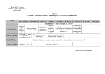 Komenda Powiatowa Państwowej Straży Pożarnej w Miechowie PLAN szkolenia z zakresu ratownictwa technicznego dla strażaków ratowników OSP Godziny 8.00 - 8.45 8.50 - 9.35 9.40-10.25 Dni 01.06.2013 Sobota 02.06..2013 Niedziela 11.30-12.15 12.20-13.05 13.10-13.55 14.25-15.10 15.15-16.00 PRZEDMIOT I TREŚĆ KSZTAŁACENIA Wypadki drogwe statystyki i przyczyny (T) Budowa pojazdów samochodowych (T) Postępowanie w czasie innych akcji komunikacyjnych (T) 08.06.2013 Sobota 09.06.2013 Niedziela 10.40-11.25 Organizacja akcji Hydrauliczne ratownictwa urządzenia technicznego ratownicze (T) na drogach (T) Hydrauliczne urządzenia ratownicze (P) Postępowanie Metody uwalniania osób w czasie akcji z poszkodowanych z samochodów występowaniem osobowych, ciężarowych oraz substancji autobusów (T) niebezpiecznyc h (T) Organizacja akcji ratownictwa technicznego na drogach (P) Metody uwalniania osób poszkodowanych z samochodów osobowych, ciężarowych oraz autobusów (P) EGZAMIN TEORIA EGZAMIN PRAKTYKA Opracował: kpt. Michał Burzyński 16.10-16.55