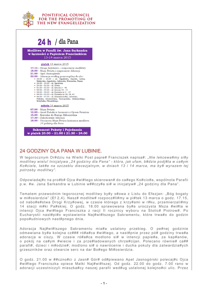 24 GODZINY DLA PANA W LUBINIE. W tegor ocznym O r#dziu na Wielki Post papie # Franciszek napisa#: „Nie lekcewa#my si#y modlitwy wielu ! Inicjatywa „24 godziny d la Pa na ” - która, jak ufam, b#dzie podj#ta w ca# ym Ko#ciele, tak#e na szczeblu diecezjaln ym, w dniach 13 i 14 marca, ma by# wyraze m te j potrzeby modlitwy”. Odpowiadaj#c na pro#b# Ojca #wi#tego skiero wan# do ca#ego Ko#cio#a, wspólnota Pa rafii p.w. #w. Jana Sarkandra w Lubinie w ## czy#a si# w inicjatyw# „24 godziny dla Pana”. Tematem przew odnim tegorocznej modlitwy by#y s#owa z Listu do Efezjan: „Bóg bog a ty w mi#osierdzie” (E f 2, 4). Nasz# modlitw# r ozpocz#li#my w pi#tek 13 marca o godz. 17 .15, od nabo#e#st wa Drogi Krzy#owej, w czasie którego z krzy#ami w r#ku, przemierzali# my 14 stacji m# ki Pa#skiej. O godz. 1 8. 00 spr awowana by#a uroczysta Msza #wi#ta w intencji Ojca #wi#tego Franciszka z r acji II rocznicy wyboru na Stolic# Piotrow# . Po Euchar ystii n ast#pi #o w ystawienie Naj# wi# tszego Sakramentu, które trwa#o do god zin popo#udniowych nast#pnego dnia. Ador acja Naj#wi#tszego Sakramentu m ia# a ustalony przebieg. O pe#nej godzinie odmawiana by#a kolej na cz### ró#a#ca #wi#t ego, a nast#pnie przez pó# godziny trwa #a adoracja w ciszy. W czasie ró#a#ca m od lono si# w intencji papie#a, za kap#an ów, o pokój na ca#ym #wiecie i za prze#la do wanych chrze#cijan. Polecano równie# ca# # parafi#, dzieci i m#odzie#; modlono si# o na wrócenie i ducha pokuty dla zatwardzia#ych grzeszników o raz otwarcie serc na dar Bo#ego M i#osierdzia. O godz. 21.00 w ##czno#ci z Jasn# Gór # o d# piewano Apel Jasnogórski polecaj#c Ojca #wi#tego Fra nciszka opiece Matki Naj# wi# tszej. Od godz. 22.00 do godz. 7.00 rano w adoracji uczestniczyli mieszka#cy naszej para fii wed#ug ustalonej kolejno#ci ulic. P rzez -1- ca## noc w poszczególnych godzina ch na adoracji trwa#o #rednio 60 osób, co b y#o wyrazem wielkiego zaanga#owania par af ian w to papieskie dzie#o. Wielk# pomo c# w dobrym prze#yciu spot kan ia z Chrystusem Eucharystycznym b y#o specjalnie przygotowane o#wietlenie pr ezb it er ium, symbolizuj#ce ogie# mi#osierdzia o raz odtwarzany z g#o#ników chora# gregoria#ski. Je dn ocze#nie od godz. 20.00 do 2.00 w no cy sprawowany by# sakrament pokuty i pojed na nia, w czasie którego wiele osób skorzysta # o ze spowiedzi #wi#tej. Podczas adoracj i dotar#a do nas wia do mo##, #e Ojciec #wi#ty og#osi# nadzwycza jny Rok #wi#ty, p o#wi #cony Bo#emu Mi#osie rdziu, co jeszcze bardziej zmotywowa#o nas d o intensywnej modlitwy w intencji Najwy#sze go Pasterza oraz wypraszania Mi#osierdzia Bo#ego dla zatwardzi a#ych grzeszników. W sobot# 14 marca o godz. 7.00 sprawowana by#a Eucharystia, po której kontynuowan o adoracj#. O godz. 12.00 w ##czno#ci z Ojcem #wi#tym odmówiono modlitw# Anio# Pa #ski, a w godzinie Mi#osierdzia koronk# do Bo #e go Mi#osierdzia wypraszano potrzebne #aski dla ca#ego #wiata. O godz. 17.30 od#pie wano Suplikacje, po której wszyscy zosta li umocnieni b#ogos#aw ie#stwem Naj#wi#t szym Sakramentem. O godz. 18.00 sprawowa na by#a uroczysta Eucharystia, która zako#czy#a inicjatyw# „24 godziny dla Pana” w Para fii #w. Jana Sarkandra. W ca## akcj# przygotowania i p rzepro wadzenia tego modlitewnego czuwa nia zaanga#owane by#o prawie 100 osób, p od przewodnictwem ks. proboszcza Andrze ja Drwi#y i ks. w ikariusza Damiana Koniecznego. Osoby te prowadzi#y modlitwy i #piew w poszczególnych godzinach ad or acji. Ca#a inicjatywa bardzo zjednoczy# a nasz# parafi#, pobudzi#a do wysi#ku, p oka zuj#c jak wiele osób potrzebuje spotka nia z Chrystusem E ucharystycznym. Ma my na dziej#, #e ten 24 godzinny „#wi#ty czas” przyniesie b# ogos#awi one owoce dla ca#ej Parafii – ju# dzi# wida#, #e nie by# o n zmarnowany. Autor tekstu: JN -2-