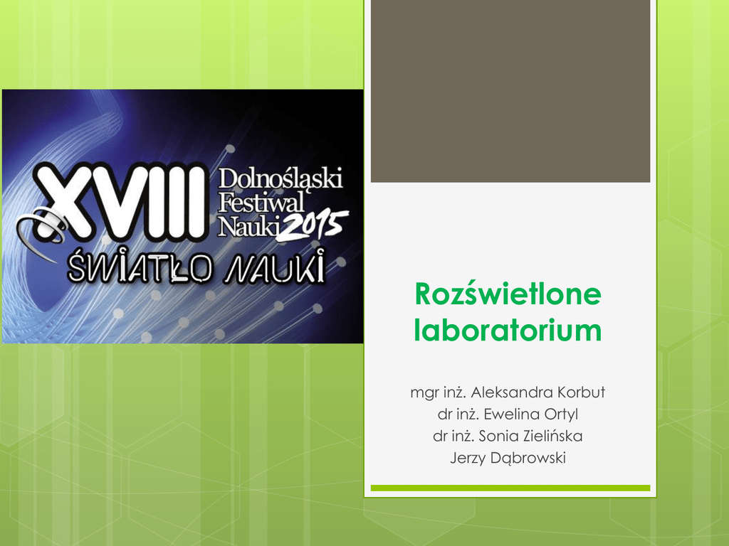 Rozświetlone laboratorium mgr inż. Aleksandra Korbut dr inż. Ewelina Ortyl dr inż. Sonia Zielińska Jerzy Dąbrowski Zasady BHP w laboratorium chemicznym Pracujemy w odzieży ochronnej Podczas wykonywania doświadczeń zachowujemy szczególną ostrożność Wykonujemy polecenia prowadzącego, nie przeprowadzamy eksperymentów bez jego pozwolenia Nie wąchamy ani nie wciągamy ustami żadnej cieczy Nie spożywamy posiłków i nie pijemy żadnych napojów Luminescencja Zjawisko świecenia stymulowanego, wywołane różnymi czynnikami zewnętrznymi Rodzaje luminescencji Fotoluminescencja- wywołana przez pochłonięcie promieniowania elektromagnetycznego z obszaru widzialnego, ultrafioletu lb podczerwieni. • • Fluorescencja – zjawisko trwające wyłącznie podczas działania czynnika wzbudzającego Fosforescencja – zjawisko trwające również przez pewien czas po ustąpieniu czynnika wzbudzającego Chemiluminescencja – wytworzona w trakcie niektórych reakcji chemicznych Elektroluminescencja – świecenie pod wpływem stałego lub zmiennego prąd elektrycznego Sonoluminescencja – wywołana ultradźwiękami Termoluminescencja – wywołana podniesieniem temperatury, jednak do niższej temperatury niż temperatura żarzenia Chemiluminescencja luminolu -chemiczna latarka Opis doświadczenia Do probówki zawierającej KOH dodajemy 5.0 ml rozpuszczalnika organicznego w postaci DMSO Dodajemy szczyptę luminolu Zawartość probówki intensywnie wstrząsamy Dlaczego tak się dzieje? Świecenie roztworu związane jest z utlenianiem luminolu w środowisku alkalicznym Reakcja zachodzi bez udziału żadnych aktywatorów, nawet pod wpływem tlenu atmosferycznego, wprowadzonego do roztworu podczas jego wytrząsania Fluorescencja w poli(alkoholu winylowym) Opis doświadczenia Do 10% wodnego roztworu poli(alkoholu winylowego) dodajemy szczyptę rodaminy B Roztwór wylewamy na płytkę szklaną i pozostawiamy do całkowitego wyschnięcia Płytkę z warstwą polimeru naświetlamy lampą UV, obserwujemy barwę fluorescencji Chromizm Zdolność do odwracalnej zmiany barwy materiału pod wpływem określonego bodźca fizycznego lub chemicznego Rodzaje chromizmu Fotochromizm – zmiana barwy pod wpływem światła Termochromizm – zmiana barwy pod wpływem temperatury Solwatochromizm – zmiana barwy w zależności od polarności rozpuszczalnika Elektrochromizm – zmiana barwy pod wpływem prądu elektrycznego Mechanochromizm – zmiana barwy spowodowana działaniem mechanicznym Jonochromizm – zmiana barwy pod wpływem obecności jonów Halochromizm – zmiana barwy pod wpływem zmiany pH środowiska Trybochromizm – zmiana barwy pod wpływem tarcia mechanicznego Halochromizm - kolorowy cylinder Opis doświadczenia Do probówki wlewamy wodę destylowaną (ok.1/4 objętości) Dodajemy niewielką ilość wodorotlenku sodu (w celu zalkalizowania roztworu) Dodajemy do r-ru NaOH kilka kropel przygotowanego alkoholowego roztworu błękitu bromotymolowego Zmieniamy pH za pomocą r-ru kwasu octowego / r-ru wodorotlenku sodu pH 5.5 6.0 6.5 7.0 7.5 8.0 Dlaczego tak się dzieje? Błękit bromotymolowy jest barwnikiem – chemicznym wskaźnikiem pH. Jego barwa zależy od odczynu środowiska, w którym się znajduje Roztwór użyty w doświadczeniu ma początkowo odczyn zasadowy – co objawia się niebieskim zabarwieniem Podczas dodawania kwasu (jony H+) pH roztworu obniża się, dzięki czemu wskaźnik przybiera barwę zieloną w środowisku obojętnym i żółtą w środowisku kwaśnym Halochromizm - światła drogowe Opis doświadczenia Do kolby miarowej zawierającej 2% r-r glukozy dodajemy szczyptę indygokarminu Następnie do roztworu barwnika dodajemy ok. 2ml 2% r-r NaOH Odstawiamy kolbę i obserwujemy zmianę barwy roztworu Mieszamy zawartość kolby (wstrząsamy) Dlaczego tak się dzieje? Początkowa niebieska barwa wskazuje na obecność barwnika w roztworze o odczynie zbliżonym do obojętnego Po dodaniu r-ru NaOH, następuje zmiana pH z obojętnego na silnie zasadowy, z czym wiąże się zmiana barwy na zieloną Jednocześnie, w środowisku zasadowym, ujawniają się redukujące właściwości glukozy Barwnik zostaje najpierw zredukowany częściowo (barwa czerwona), aż do całkowitego zredukowania, o czym świadczy barwa żółta Potrząśnięcie roztworem powoduje utlenianie barwnika tlenem z powietrza Mechanochromizm -wstrząśnięty błękit Opis doświadczenia: W kolbie miarowej sporządzamy 1.5% roztwór wodorotlenku sodu Dodajemy 0.15 g glukozy Dodajemy szczyptę błękitu metylenowego Mieszamy i pozostawiamy do zniknięcia barwy Dlaczego tak się dzieje? Zmiany barwy roztworu są efektem dwóch przeciwbieżnych reakcji: redukcji i utleniania barwnika Niebieska barwa znika, ponieważ glukoza redukuje błękit metylenowy do błękitu leukometylenowego, sama zaś utlenia się do kwasu glukonowego, a ten reaguje z jonami sodu tworząc glukonian sodu Podczas wytrząsania, tlen znajdujący się w kolbie utlenia bezbarwną formę błękitu (leukobarwnik) do formy barwnej Doświadczenie można powtarzać dopóki w kolbie będzie znajdować się tlen Fotochromizm - sympatyczny atrament Opis doświadczenia: Sporządzamy roztwór spiropiranu w chloroformie Nanosimy na papier „ukrytą wiadomość” Wywołujemy tajną wiadomość za pomocą promieniowania ultrafioletowego Dlaczego tak się dzieje? Zmiana barwy następuje wskutek otwarcia pierścienia, wywołanego działaniem promieniowania ultrafioletowego Forma zamknięta użytego związku jest bezbarwna, z kolei forma otwarta przyjmuje barwę różową (fioletową) UV VIS lub Δ Zastosowanie chemiluminescencji o Chemiczne oświetlacze - dostępne w handlu oświetlacze oparte są na reakcji utleniania szczawianów organicznych rozcieńczonym roztworem bezwodnego nadtlenku wodoru w mieszaninie ftalanu metylu i alkoholu tert-butylowegoTaka latarka jest odporna na stłuczenie czy zalanie wodą,ale nie da się jej wyłączyć… o W kryminalis