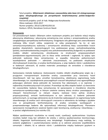 Tytuł projektu: Właściwości składniowe czasowników jako baza ich zintegrowanego opisu leksykograficznego (w perspektywie konfrontatywnej polsko-bułgarskorosyjskiej) Kierownik projektu: prof. dr hab. Małgorzata Korytkowska Okres realizacji: 2014-2017 Numer projektu: 2013/11/B/HS2/03116 Konkurs: OPUS, Narodowe Centrum Nauki Streszczenie Cel prowadzonych badao: Głównym celem naukowym projektu jest badanie relacji między płaszczyzną składniową i płaszczyzną semantyczną oraz synteza z przeprowadzonej analizy uwzględniająca perspektywę konfrontatywną. Osiągnięcie celu głównego jest uwarunkowane realizacją kilku innych celów, wzajemnie ze sobą powiązanych. Są to: a) opis semantycznosyntaktyczny wybranej i semantycznie określonej klasy czasowników trzech języków słowiaoskich, reprezentujących trzy podstawowe grupy: zachodniosłowiaoską (polski), wschodniosłowiaoską (rosyjski) oraz południowosłowiaoską (bułgarski) na podstawie modelu składni semantycznej, ufundowanej na strukturach propozycjonalnych (predykatowo-argumentowych); jest to klasa verba sentiendi i cogitandi; b) spójny opis jednostek wybranej klasy semantycznej; w wypadku leksemów polisemicznych wyodrębnienie jednostek — odmianek znaczeniowych, na podstawie eksplicytnie sformułowanych kryteriów; c) analiza konfrontatywna, a więc badanie różnic i podobieostw w badanych zakresach; d) analiza materiału prowadząca do wniosków o charakterze leksykograficznym. Zastosowana metoda badawcza: Zastosowanie modelu składni eksplikacyjnej wiąże się z przyjęciem transparentnych kryteriów analizy czasowników przy tworzeniu haseł słownikowych: taki typ opisu umożliwi konsekwentną, obiektywną segmentację hasła słownikowego, tzn. wyodrębnienie poszczególnych znaczeo leksykalnych oraz egzemplifikacje pokazujące zdolności danej jednostki do tworzenia fraz zdaniowych, a co najmniej — najbardziej charakterystycznych ich postaci. Przewiduje się kilka etapów badao: a) stworzenie list czasowników badanej klasy semantycznej; b) opracowanie o charakterze słownika semantyczno-syntaktycznego, w którym ustalone zostaną zbiory struktur pozostających w relacjach hierarchicznych (o różnym stopniu realizacji treści pełnej struktury propozycjonalnej), wnioski konfrontatywne w tym zakresie; c) badanie jednostek polisemicznych, co wymaga odniesienia się do kryteriów wpływających na segmentację hasła słownikowego; d) analiza cech różnicujących znaczenia w odniesieniu do każdego z języków oraz w perspektywie konfrontatywnej; d) analiza wniosków wynikających z przeprowadzonego badania dla optymalizacji informacji leksykograficznej. Planowane opracowanie monograficzne zawierad będzie częśd teoretyczną, analityczną i słownikową — w postaci zdigitalizowanej (na nośniku CD). Wpływ spodziewanych rezultatów na rozwój nauki, cywilizacji, społeczeostwa: Uzyskane rezultaty badao mają byd wkładem do wiedzy z zakresu językoznawstwa teoretycznego, składni, lingwistyki konfrontatywnej oraz leksykologii. Projektodawcy mają nadzieję, że zostanie pogłębiona i usystematyzowana wiedza a) w zakresie procesów współdziałania semantyki i składni; b) w zakresie różnic i podobieostw między badanymi językami w dopuszczalności procesów semantyczno-syntaktycznych; c) w zakresie możliwości tworzenia i skuteczności eksplicytnych kryteriów analizy w odniesieniu do badanej klasy semantycznej, a także w odniesieniu do zjawisk polisemii. Realizacja projektu może byd wkładem do optymalizacji opisów leksykograficznych. Rozwój leksykologii i sprostanie potrzebom użytkowników słowników, zwłaszcza niejednojęzycznych, wymaga dostarczania coraz bardziej wyczerpującej i usystematyzowanej informacji na różnych poziomach. Wydaje się, że proponowany typ opisu może stanowid inspirację dla kompendiów słownikowych ogólnie dostępnych, a w nowoczesnych społeczeostwach postęp w omawianym zakresie jest nieodzowny. Abstract Research project objectives: The main goal of the project is to study the relation between syntactic and semantic layers and to synthesize the analysis performed with regard to the contrastive perspective. The accomplishment of this goal is determined by the achievement of other detailed and interrelated objectives, i.e.: a) a semantic and syntactic description of a chosen and semantically determined class of verbs in three Slavic languages representing three basic groups: West Slavic (Polish), East Slavic (Russian) and South Slavic (Bulgarian), on the basis of the model of semantic syntax, founded on propositional (predicate-argument) structures. The class discussed exemplifies verba sentiendi and cogitandi; b) a coherent description of the elements belonging to a chosen semantic class in the aspect mentioned above; in case of polysemic lexemes, isolating units and semantic varieties is based on explicitly formulated criteria; c) a comparative analysis and hence a study of the material in terms of the distributive and semantic similarities and differences; d) an analysis of the material meant to reach conclusions of the lexicographical nature. The research hypothesis aims at revealing possibilities and efficiency of the research submitted for a coherent description of the semantic and syntactic layers of verbs and polysemantic phenomena, taking a contrastive analysis and conclusions on enhancing lexicographical information into consideration. Research project methodology: The explicational syntax model will be applied, which entails accepting transparent criteria for the analysis of verbs when constructing dictionary entries: such a type of description enables us to perform consistent, systematic and reasonably objective segmentation of a dictionary entry, i.e. it will be possible to isolate particular lexical meanings and exemplifications that show possibilities of a given unit of building sentence phrases or, at least — their most charact