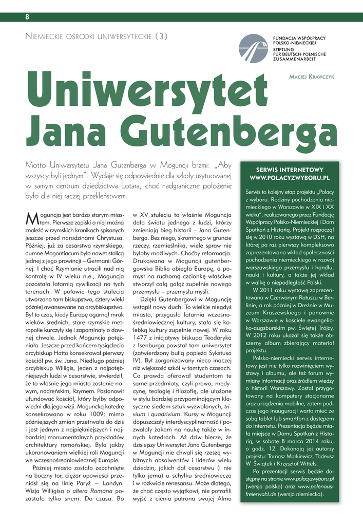 8 N ieMieckie ośrodki UNiWersyteckie (3) Uniwersytet MACIEJ KRAWCZYK Jana Gutenberga Motto Uniwersytetu Jana Gutenberga w Moguncji brzmi: „Aby wszyscy byli jednym”. Wydaje się odpowiednie dla szkoły usytuowanej w samym centrum dziedzictwa Lotara, choć nadgraniczne położenie było dla niej raczej przekleństwem. M oguncja jest bardzo starym miastem. Pierwsze zapiski o niej można znaleźć w rzymskich kronikach spisanych jeszcze przed narodzinami Chrystusa. Później, już za cesarstwa rzymskiego, dumne Mogontiacum było nawet stolicą jednej z jego prowincji – Germanii Górnej. I choć Rzymianie utracili nad nią kontrolę w IV wieku n.e., Moguncja pozostała latarnią cywilizacji na tych terenach. W połowie tego stulecia utworzono tam biskupstwo, cztery wieki później awansowane na arcybiskupstwo. Był to czas, kiedy Europę ogarnął mrok wieków średnich, stare rzymskie metropolie kurczyły się i zapominały o dawnej chwale. Jednak Moguncja potężniała. Jeszcze przed końcem tysiąclecia arcybiskup Hatto konsekrował pierwszy kościół pw. św. Jana. Niedługo później arcybiskup Willigis, jeden z najpotężniejszych ludzi w cesarstwie, stwierdził, że to właśnie jego miasto zostanie nowym, nadreńskim, Rzymem. Postanowił ufundować kościół, który byłby odpowiedni dla jego wizji. Moguncką katedrę konsekrowano w roku 1009; mimo późniejszych zmian przetrwała do dziś i jest jednym z najpiękniejszych i najbardziej monumentalnych przykładów architektury romańskiej. Była jakby ukoronowaniem wielkiej roli Moguncji we wczesnośredniowiecznej Europie. Później miasto zostało zepchnięte na boczny tor, ciężar opowieści przeniósł się na linię Paryż − Londyn. Wizja Willigisa o altera Romana pozostała tylko snem. Do czasu. Bo w XV stuleciu to właśnie Moguncja dała światu jednego z ludzi, którzy zmieniają bieg historii – Jana Gutenberga. Bez niego, skromnego w gruncie rzeczy, rzemieślnika, wiele spraw nie byłoby możliwych. Choćby reformacja. Drukowana w Moguncji gutenbergowska Biblia obiegła Europę, a pomysł na ruchomą czcionkę właściwe stworzył całą gałąź zupełnie nowego przemysłu – przemysłu myśli. Dzięki Gutenbergowi w Moguncję wstąpił nowy duch. To wielkie niegdyś miasto, przygasła latarnia wczesnośredniowiecznej kultury, stało się kolebką kultury zupełnie nowej. W roku 1477 z inicjatywy biskupa Teodoryka z Isenburga powstał tam uniwersytet (zatwierdzony bullą papieża Sykstusa IV). Był zorganizowany nieco inaczej niż większość szkół w tamtych czasach. Co prawda oferował studentom te same przedmioty, czyli prawo, medycynę, teologię i filozofię, ale ułożone w stylu bardziej przypominającym klasyczne siedem sztuk wyzwolonych, trivium i quadrivium. Kursy w Moguncji dopuszczały interdyscyplinarność i pozwalały żakom na naukę także w innych katedrach. Aż dziw bierze, że dzisiejszy Uniwersytet Jana Gutenberga w Moguncji nie chwali się rzeszą wybitnych absolwentów i liderów wielu dziedzin, jakich dał cesarstwu (i nie tylko jemu) u schyłku średniowiecza i w rozkwicie renesansu. Może dlatego, że choć często wyjątkowi, nie potrafili wyjść z cienia patrona swojej Alma SERWIS INTERNETOWY WWW.POLACYZWYBORU.PL Serwis to kolejny etap projektu „Polacy z wyboru. Rodziny pochodzenia niemieckiego w Warszawie w XIX i XX wieku”, realizowanego przez Fundację Współpracy Polsko-Niemieckiej i Dom Spotkań z Historią. Projekt rozpoczął się w 2010 roku wystawą w DSH, na której po raz pierwszy kompleksowo zaprezentowano wkład społeczności pochodzenia niemieckiego w rozwój warszawskiego przemysłu i handlu, nauki i kultury, a także jej wkład w walkę o niepodległość Polski. W 2011 roku wystawę zaprezentowano w Czerwonym Ratuszu w Berlinie, a rok później w Dreźnie w Muzeum Kraszewskiego i ponownie w Warszawie w kościele ewangelicko-augsburskim pw. Świętej Trójcy. W 2012 roku ukazał się także obszerny album zbierający materiał projektu. Polsko-niemiecki serwis internetowy jest nie tylko rozwinięciem wystawy i albumu, ale też forum wymiany informacji oraz źródłem wiedzy o historii Warszawy. Został przygotowany na komputery stacjonarne oraz urządzenia mobilne, zatem podczas jego inauguracji warto mieć ze sobą tablet lub smartfon z dostępem do Internetu. Prezentacja będzie miała miejsce w Domu Spotkań z Historią, w sobotę 8 marca 2014 roku, o godz. 12. Dokonają jej autorzy projektu: Tomasz Markiewicz, Tadeusz W. Świątek i Krzysztof Wittels. Po prezentacji serwis będzie dostępny na stronie www.polacyzwyboru.pl (wersja polska) oraz www.polenausfreierwahl.de (wersja niemiecka). 9 Mater. Rywalizować z Gutenbergiem to rzecz nieprosta. Uniwersytet w Moguncji, podobnie jak całe miasto, od XV wieku był własnością arcybiskupów. Jednak nie stał się areną teologicznych kłótni poprzedzających pokój augsburski, a później wojnę trzydziestoletnią. Oczywiście pojawiali się na nim zwolennicy reformacji, a później jej żarliwi adwersarze, ale na nadreńskiej uczelni religijne spory nigdy nie były najważniejsze. Nie uchroniło to jej przed szwedzką okupacją w XVII wieku; wówczas studenci udali się na pierwsze wygnanie. Nie ostatnie, bowiem późniejsze czasy nie były łaskawe dla uniwersytetu w Moguncji. Wywarły na nim piętno nie tylko francusko-pruskie spory o dziedzictwo Lotara, ale i rewolucja francuska – przez chwilę jakobini proklamowali nawet w Moguncji swoją republikę. Wojenne czasy nie sprzyjały uniwersyteckiemu życiu i uczelnia podupadała, aż w 1823 roku została zamknięta. Uniwersytet Jana Gutenberga wznowił działalność dopiero po drugiej wojnie światowej 15 maja 1946 roku. Został reaktywowany jako instytucja nowoczesna i troszeczkę jako symbol nowej Europy, która woli dyskutować, niż się kłócić. W 1947 roku z inicjatywy francuskich władz wojskowych na Uniwersytecie Jana Gutenberga powstała Pań