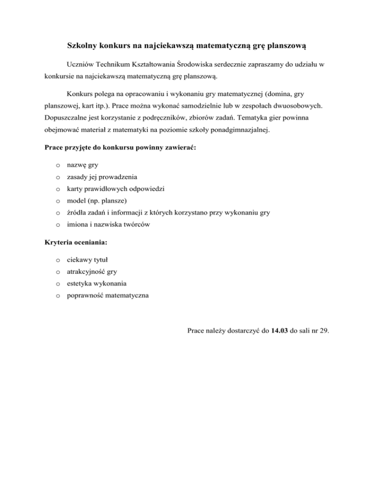 Szkolny konkurs na najciekawszą matematyczną grę planszową Uczniów Technikum Kształtowania Środowiska serdecznie zapraszamy do udziału w konkursie na najciekawszą matematyczną grę planszową. Konkurs polega na opracowaniu i wykonaniu gry matematycznej (domina, gry planszowej, kart itp.). Prace można wykonać samodzielnie lub w zespołach dwuosobowych. Dopuszczalne jest korzystanie z podręczników, zbiorów zadań. Tematyka gier powinna obejmować materiał z matematyki na poziomie szkoły ponadgimnazjalnej. Prace przyjęte do konkursu powinny zawierać: o nazwę gry o zasady jej prowadzenia o karty prawidłowych odpowiedzi o model (np. plansze) o źródła zadań i informacji z których korzystano przy wykonaniu gry o imiona i nazwiska twórców Kryteria oceniania: o ciekawy tytuł o atrakcyjność gry o estetyka wykonania o poprawność matematyczna Prace należy dostarczyć do 14.03 do sali nr 29.