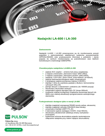 Nadajniki LA-600 i LA-300 Zastosowanie Nadajniki LA-600 i LA-300 przeznaczone są do monitorowania pozycji pojazdów z wykorzystaniem satelitarnych systemów pozycjonowania (GPS/GLONASS) oraz przekazywania informacji o położeniu i stanie pojazdu do centrum monitorowania za pośrednictwem sieci telefonii komórkowych w technologii GSM/GPRS. Charakterystyka nadajników LA-600/LA-300 wejście ACC (zapłon – zmienia tryb pracy urządzenia), 2 wejścia uniwersalne „sterowane masą” (WE1,WE2), 2 wejścia uniwersalne „sterowane plusem” (WE3,WE4), zasilanie +12V/+24V, (Imin=15mA, Imax=500mA, Iśr=60mA) wejście blokowania/uzbrajania wejść uniwersalnych, 2 analogowe wejścia pomiarowe (zakres 0-30VDC), interfejs 1-Wire do czytników pastylek (i-Button) i termometrów cyfrowych DALLAS, pamięć danych o zdarzeniach i położeniu (do 100000 pozycji) wbudowany akumulator awaryjny, uniwersalne wyjście sterujące typu OC (Imax=300mA) możliwość zdalnej konfiguracji urządzenia (transmisja danych lub SMS) oraz zdalnej aktualizacji oprogramowania wewnętrznego sterownika. Funkcjonalności dostępne tylko w wersji LA-600 interfejs magistrali szeregowej RS485 (sondy paliwa, akcesoria), interfejs magistrali cyfrowej CAN-BUS (dwa kanały), uniwersalny interfejs UART-TTL-5V, 2 sterowane wyjścia zasilające (12/24V, Imax=50mA), wbudowany akcelerometr (detekcja zmiany nachylenia i przeciążeń) systemowa ochrona akumulatora pojazdu (automatyczne odłączenie nadajnika przy niskim napięciu akumulatora)