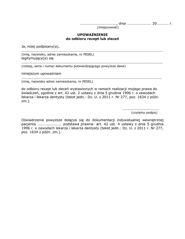 .............................., dnia .................... 20.......... r. (miejscowość) UPOWAŻNIENIE do odbioru recept lub zleceń Ja, niżej podpisany(a), ..................................................................................................................... (imię, nazwisko, adres zamieszkania, nr PESEL) legitymujący(a) się ..................................................................................................................... (rodzaj, seria i numer dokumentu potwierdzającego powyższe dane) niniejszym upoważniam .................................................................................................................... (imię, nazwisko adres zamieszkania, nr PESEL) do odbioru recept lub zleceń wystawionych w ramach realizacji mojego prawa do świadczeń, zgodnie z art. 42 ust. 2 ustawy z dnia 5 grudnia 1996 r. o zawodach lekarza i lekarza dentysty (tekst jedn.: Dz. U. z 2011 r. Nr 277, poz. 1634 z późn. zm.). .............................. (czytelny podpis) Oświadczenie powyższe dołącza się do dokumentacji indywidualnej wewnętrznej pacjenta .................... podstawa prawna: art. 42 ust. 4 ustawy z dnia 5 grudnia 1996 r. o zawodach lekarza i lekarza dentysty (tekst jedn.: Dz. U. z 2011 r. Nr 277, poz. 1634 z późn. zm.).