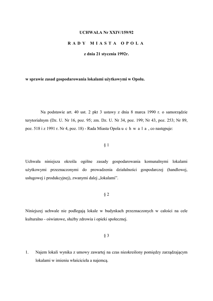 UCHWAŁA Nr XXIV/159/92 R A D Y M I A S T A O P O L A z dnia 21 stycznia 1992r. w sprawie zasad gospodarowania lokalami użytkowymi w Opolu. Na podstawie art. 40 ust. 2 pkt 3 ustawy z dnia 8 marca 1990 r. o samorządzie terytorialnym (Dz. U. Nr 16, poz. 95; zm. Dz. U. Nr 34, poz. 199; Nr 43, poz. 253; Nr 89, poz. 518 i z 1991 r. Nr 4, poz. 18) - Rada Miasta Opola u c h w a l a , co następuje: §1 Uchwała niniejsza określa ogólne zasady gospodarowania komunalnymi lokalami użytkowymi przeznaczonymi do prowadzenia działalności gospodarczej (handlowej, usługowej i produkcyjnej), zwanymi dalej „lokalami”. §2 Niniejszej uchwale nie podlegają lokale w budynkach przeznaczonych w całości na cele kulturalno - oświatowe, służby zdrowia i opieki społecznej. §3 1. Najem lokali wynika z umowy zawartej na czas nieokreślony pomiędzy zarządzającym lokalami w imieniu właściciela a najemcą. 2 2. Umowa najmu może być zawarta na czas oznaczony, jeżeli działalność w lokalu ma być prowadzona okresowo lub jeżeli lokal jest usytuowany w budynku przeznaczonym do remontu kapitalnego lub rozbiórki. 3. Partycypacja najemcy w kosztach remontu lokalu położonego w budynku przeznaczonym do remontu kapitalnego w wysokości 50% kosztów uprawnia do przedłużenia umowy najmu na czas nieokreślony z pominięciem zasad przetargu. §4 1. Najemców wyłania się z przetargu bezpośrednim, nieograniczonym, którego przedmiotem jest wyłącznie czynsz. 2. Dopuszcza się również stosowanie przetargu ofertowego pisemnego lub przetargu ograniczonego. 3. Regulamin przetargu ustala Zarząd Miasta. §5 1. Z przetargu wyłącza się lokale biurowe. 2. W przypadkach społecznie uzasadnionych, po uzyskaniu pozytywnej opinii właściwej komisji Rady Miasta, Zarząd Miasta może wyłączyć z przetargu również inne lokale. §6 1. Do przetargu przeznacza się tylko wolne lokale. 2. Przed przekazaniem lokali do przetargu zarządzający powinien zapewnić sprawne działanie wszystkich istniejących w lokalu urządzeń technicznych. 3. Przejęcie z własnej woli lokalu w stanie niezdatnym do użytkowania w wyniku pisemnego przetargu ofertowego nie wpływa na zwolnienie z czynszu lub obniżenie stawki. 3 §7 1. Lokal przejęty w najem w drodze przetargu powinien być wykorzystany zgodnie z przeznaczeniem określonym w warunkach przetargu. 2. Zmiana branży może nastąpić za zgodą zarządzającego w przypadku przejęcia lokalu w najem bez przetargu lub bez określenia branży. 3. Zmiana branży powoduje ponowne naliczenie czynszu. §8 Zarząd Miasta może przeznaczyć do adaptacji na lokale użytkowe z uwzględnieniem przepisów prawa budowlanego oraz opinii właściwych organów straży pożarnych i SANEPID lokale mieszkalne nie nadające się na stały pobyt ludzi ze względu na stan techniczny bądź parametry, a także zbędne pomieszczenia niemieszkalne i pomieszczenia komunikacyjne. §9 Upoważnia się zarządzającego do wyrażenia zgody na podnajem części lokalu, z uwzględnieniem poniższych kryteriów: 1) zgodna na podnajem może dotyczyć powierzchni nie większej niż 20% z przeznaczeniem na działalność dla której nie stosuje się wydzielania samodzielnych lokali np. punkty rejestracji, punkty repasacji, sprzedaż biletów, kantory wymiany walut, punkty przyjęć ogłoszeń prasowych itp. 2) zgodna na podnajem może być wydana tylko na okres jednego roku z uwzględnieniem ściśle określonej działalności. § 10 Rozwiązanie umowy najmu bez wypowiedzenia może nastąpić w szczególności gdy: 1) najemca dopuści się zwłoki z zapłatą czynszu co najmniej przez dwa okresy płatności, 4 2) samowolnie zmieni warunki określone w umowie najmu, 3) faktycznie nie zajmuje lokalu lub jego części przez okres dłuższy niż 2 miesiące, 4) samowolnie podnajmuje lokal w całości lub części, 5) prowadzi działalność, w wyniku której w sposób rażący lub uporczywy narusza porządek publiczny. § 11 1. W razie śmierci najemcy prawo do prowadzenia dalszej działalności w lokalu przysługuje: a) małżonkowi, b) pełnoletnim dzieciom najemcy, c) dotychczasowym wspólnikom prowadzącym z najemcą w tym lokalu działalność gospodarczą. 2. W przypadku rezygnacji z prowadzenia działalności przez osoby wymienione w ust. 1, lokal powinien być przekazany do dyspozycji zarządzającego nie później niż w okresie dwóch miesięcy od daty śmierci najemcy. § 12 1. W zakresie czynszu najmu za lokale stanowiące mienie komunalne ustala się strefy podziału miasta oraz minimalne stawki czynszu za 1 m2 powierzchni użytkowej lokalu obowiązujące w poszczególnych strefach, które stanowią załącznik Nr 1 i 2 do uchwały. 2. Dla instytucji społecznych oraz organizacji charytatywnych będących najemcami lokali na ich wniosek ustala się czynsz w wysokości 10% stawki z załącznika Nr 2 do uchwały, jeżeli w lokalu nie jest prowadzona przez wnioskującego działalność gospodarcza. 3. Dla piekarni ustala się czynsz w wysokości 50% stawek minimalnych określonych w załączniku Nr 2 do uchwały. 5 4. Dla oświaty, kultury, zdrowia i opieki społecznej, o ile w lokalu nie jest prowadzona działalność gospodarcza, ustala się czynsz w wysokości 20% stawek minimalnych załącznika Nr 2 do uchwały. 5. Dla lokali usytuowanych w oficynach i budynkach przeznaczonych do wyburzenia ustala się czynsz w wysokości 50% stawek minimalnych określonych w załączniku Nr 2 do uchwały. 6. Jeżeli przedmiotem najmu jest cały budynek, czynsz najmu obniża się o 50% stawki minimalnej określonej w załączniku Nr 2 do uchwały, gdy najemca wykona remont kapitalny budynku. 7. Dla lokali uzyskanych w wyniku adaptacji na własny koszt zbędnych pomieszczeń niemieszkalnych i powierzchni komunikacyjnych albo lokali mieszkalnych nie nadających się na stały pobyt ludzi, obniża się o 50% stawkę minimalną czynszu ustaloną w załączniku Nr 2 do uchwały na okres 3 lat od daty rozpoczęci