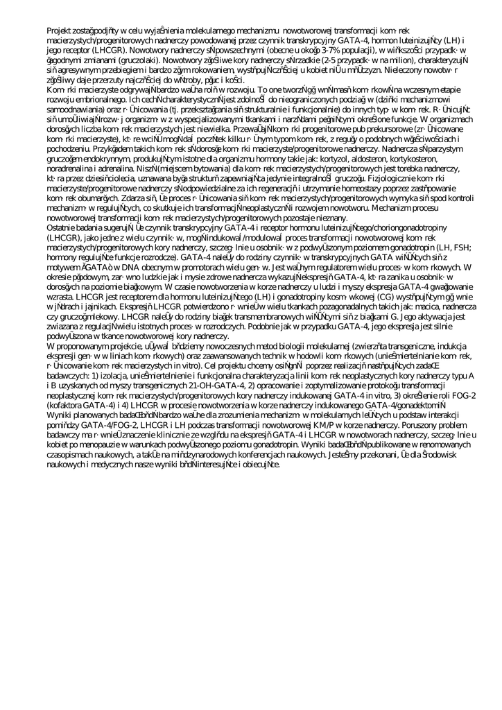 Projekt został podjęty w celu wyjaśnienia molekularnego mechanizmu nowotworowej transformacji komórek macierzystych/progenitorowych nadnerczy powodowanej przez czynnik transkrypcyjny GATA-4, hormon luteinizujący (LH) i jego receptor (LHCGR). Nowotwory nadnerczy są powszechnymi (obecne u około 3-7% populacji), w większości przypadków łagodnymi zmianami (gruczolaki). Nowotwory złośliwe kory nadnerczy są rzadkie (2-5 przypadków na milion), charakteryzują się agresywnym przebiegiem i bardzo złym rokowaniem, występują częściej u kobiet niż u mężczyzn. Nieleczony nowotwór złośliwy daje przerzuty najczęściej do wątroby, płuc i kości. Komórki macierzyste odgrywają bardzo ważna rolę w rozwoju. To one tworzą główną masę komórkową na wczesnym etapie rozwoju embrionalnego. Ich cechą charakterystyczną jest zdolność do nieograniczonych podziałów (dzięki mechanizmowi samoodnawiania) oraz różnicowania (tj. przekształcania się strukturalnie i funkcjonalnie) do innych typów komórek. Różnicując się umożliwiają rozwój organizmów z wyspecjalizowanymi tkankami i narządami pełniącymi określone funkcje. W organizmach dorosłych liczba komórek macierzystych jest niewielka. Przeważają komórki progenitorowe pub prekursorowe (zróżnicowane komórki macierzyste), które wciąż mogą dać początek kilku różnym typom komórek, z reguły o podobnych właściwościach i pochodzeniu. Przykładem takich komórek są dorosłe komórki macierzyste/progenitorowe nadnerczy. Nadnercza są parzystym gruczołem endokrynnym, produkującym istotne dla organizmu hormony takie jak: kortyzol, aldosteron, kortykosteron, noradrenalina i adrenalina. Niszą (miejscem bytowania) dla komórek macierzystych/progenitorowych jest torebka nadnerczy, która przez dziesięciolecia, uznawana była strukturę zapewniająca jedynie integralność gruczołu. Fizjologicznie komórki macierzyste/progenitorowe nadnerczy są odpowiedzialne za ich regenerację i utrzymanie homeostazy poprzez zastępowanie komórek obumarłych. Zdarza się, że proces różnicowania się komórek macierzystych/progenitorowych wymyka się spod kontroli mechanizmów regulujących, co skutkuje ich transformacją neoplastyczną i rozwojem nowotworu. Mechanizm procesu nowotworowej transformacji komórek macierzystych/progenitorowych pozostaje nieznany. Ostatnie badania sugerują, że czynnik transkrypcyjny GATA-4 i receptor hormonu luteinizującego/choriongonadotropiny (LHCGR), jako jedne z wielu czynników, mogą indukować/modulować proces transformacji nowotworowej komórek macierzystych/progenitorowych kory nadnerczy, szczególnie u osobników z podwyższonym poziomem gonadotropin (LH, FSH; hormony regulujące funkcje rozrodcze). GATA-4 należy do rodziny czynników transkrypcyjnych GATA wiążących się z motywem „GATA” w DNA obecnym w promotorach wielu genów. Jest ważnym regulatorem wielu procesów komórkowych. W okresie płodowym, zarówno ludzkie jak i mysie zdrowe nadnercza wykazują ekspresję GATA-4, która zanika u osobników dorosłych na poziomie białkowym. W czasie nowotworzenia w korze nadnerczy u ludzi i myszy ekspresja GATA-4 gwałtowanie wzrasta. LHCGR jest receptorem dla hormonu luteinizującego (LH) i gonadotropiny kosmówkowej (CG) występującym głównie w jądrach i jajnikach. Ekspresję LHCGR potwierdzono również w wielu tkankach pozagonadalnych takich jak: macica, nadnercza czy gruczoł mlekowy. LHCGR należy do rodziny białek transmembranowych wiążącymi się z białkami G. Jego aktywacja jest zwiazana z regulacją wielu istotnych procesów rozrodczych. Podobnie jak w przypadku GATA-4, jego ekspresja jest silnie podwyższona w tkance nowotworowej kory nadnerczy. W proponowanym projekcie, używać będziemy nowoczesnych metod biologii molekularnej (zwierzęta transgeniczne, indukcja ekspresji genów w liniach komórkowych) oraz zaawansowanych technik w hodowli komórkowych (unieśmiertelnianie komórek, różnicowanie komórek macierzystych in vitro). Cel projektu chcemy osiągnąć poprzez realizację następujących zadań badawczych: 1) izolacja, unieśmiertelnienie i funkcjonalna charakteryzacja linii komórek neoplastycznych kory nadnerczy typu A i B uzyskanych od myszy transgenicznych 21-OH-GATA-4, 2) opracowanie i zoptymalizowanie protokołu transformacji neoplastycznej komórek macierzystych/progenitorowych kory nadnerczy indukowanej GATA-4 in vitro, 3) określenie roli FOG-2 (kofaktora GATA-4) i 4) LHCGR w procesie nowotworzenia w korze nadnerczy indukowanego GATA-4/gonadektomią. Wyniki planowanych badań będą bardzo ważne dla zrozumienia mechanizmów molekularnych leżących u podstaw interakcji pomiędzy GATA-4/FOG-2, LHCGR i LH podczas transformacji nowotworowej KM/P w korze nadnerczy. Poruszony problem badawczy ma również znaczenie klinicznie ze względu na ekspresję GATA-4 i LHCGR w nowotworach nadnerczy, szczególnie u kobiet po menopauzie w warunkach podwyższonego poziomu gonadotropin. Wyniki badań będą publikowane w renomowanych czasopismach naukowych, a także na międzynarodowych konferencjach naukowych. Jesteśmy przekonani, że dla środowisk naukowych i medycznych nasze wyniki będą interesujące i obiecujące.